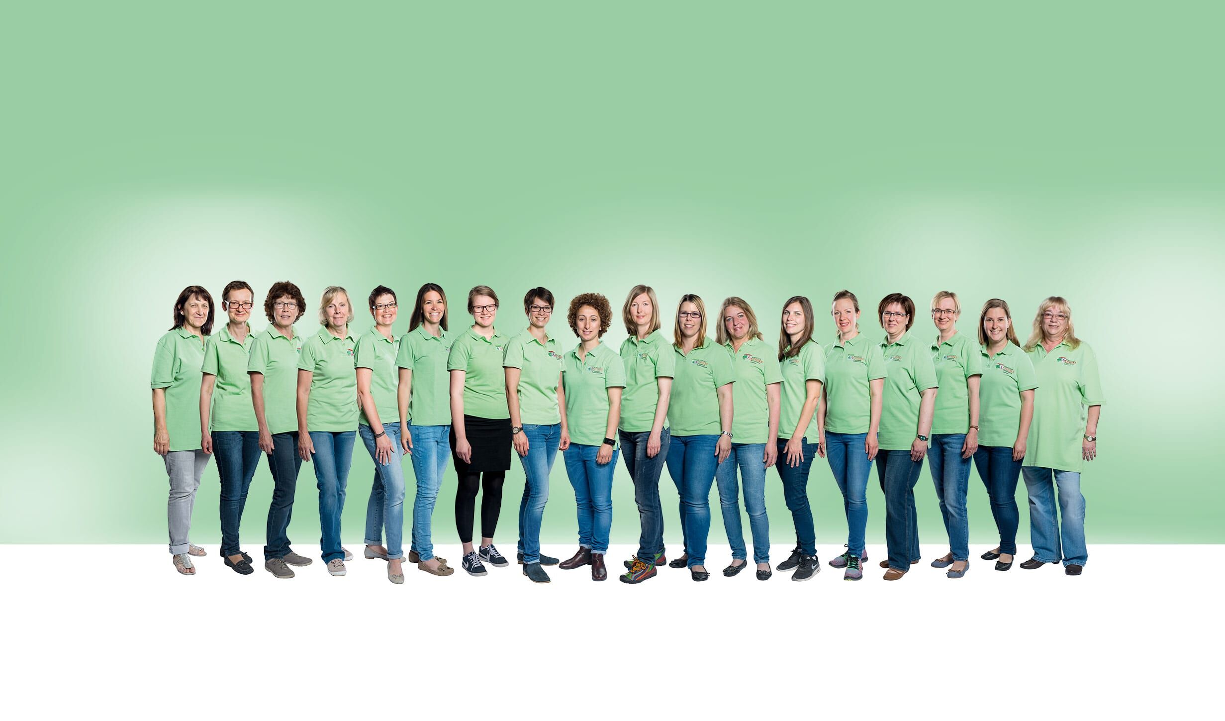 Gruppenfoto eines Frauenteams in grünen Poloshirts vor neutralem Hintergrund