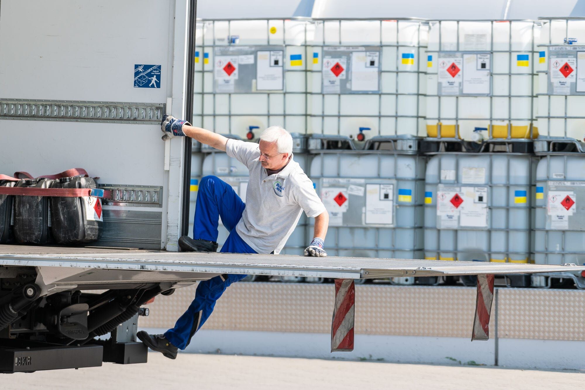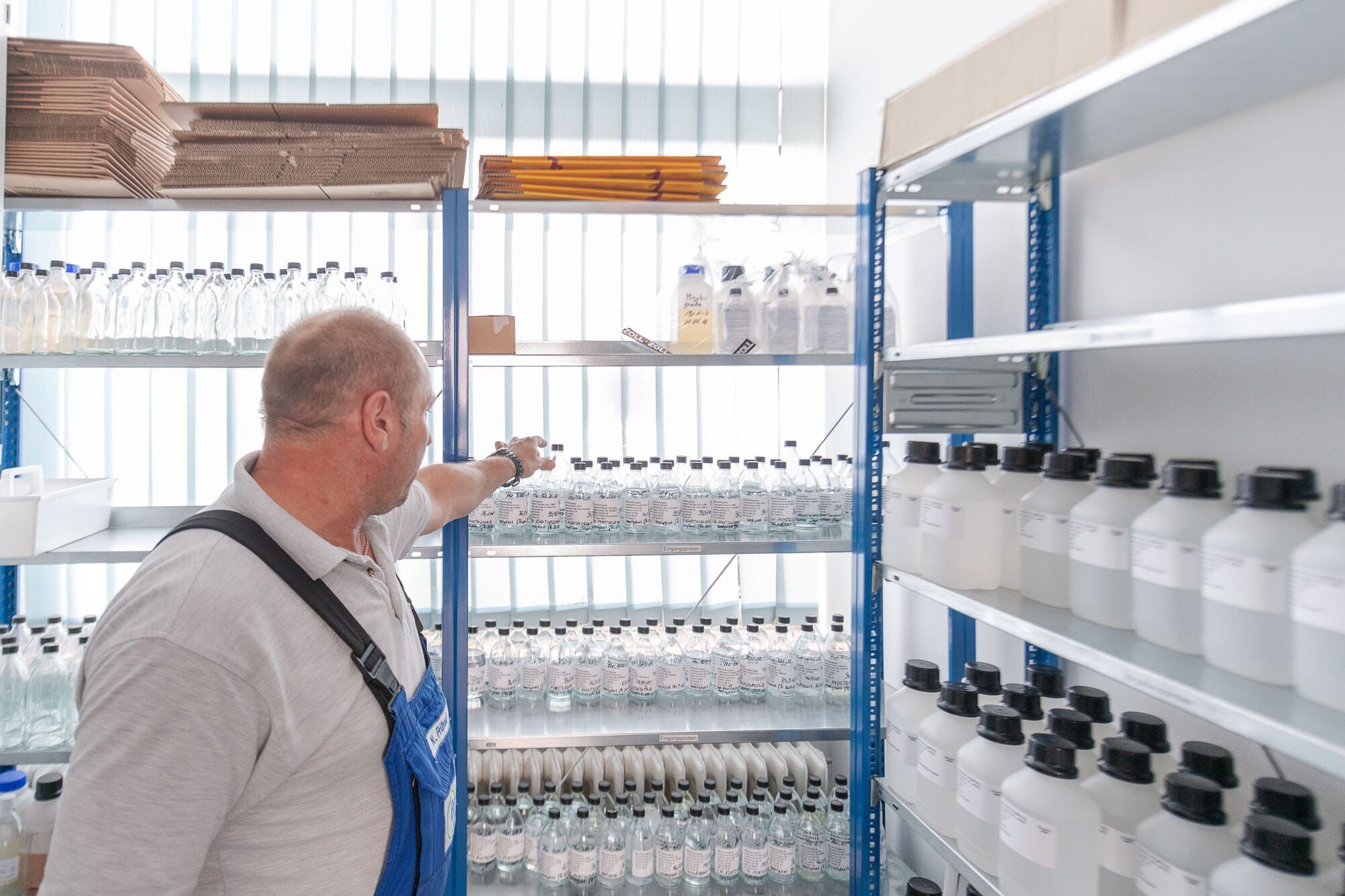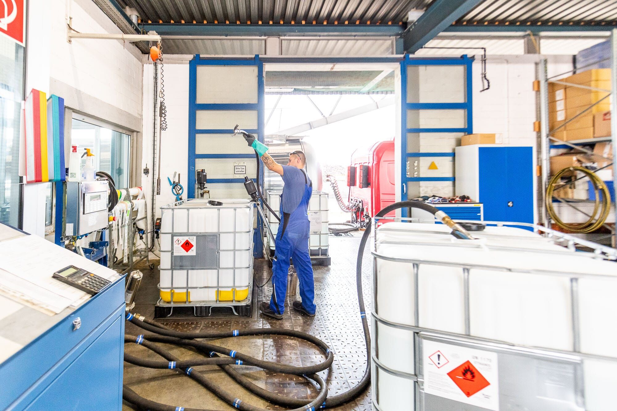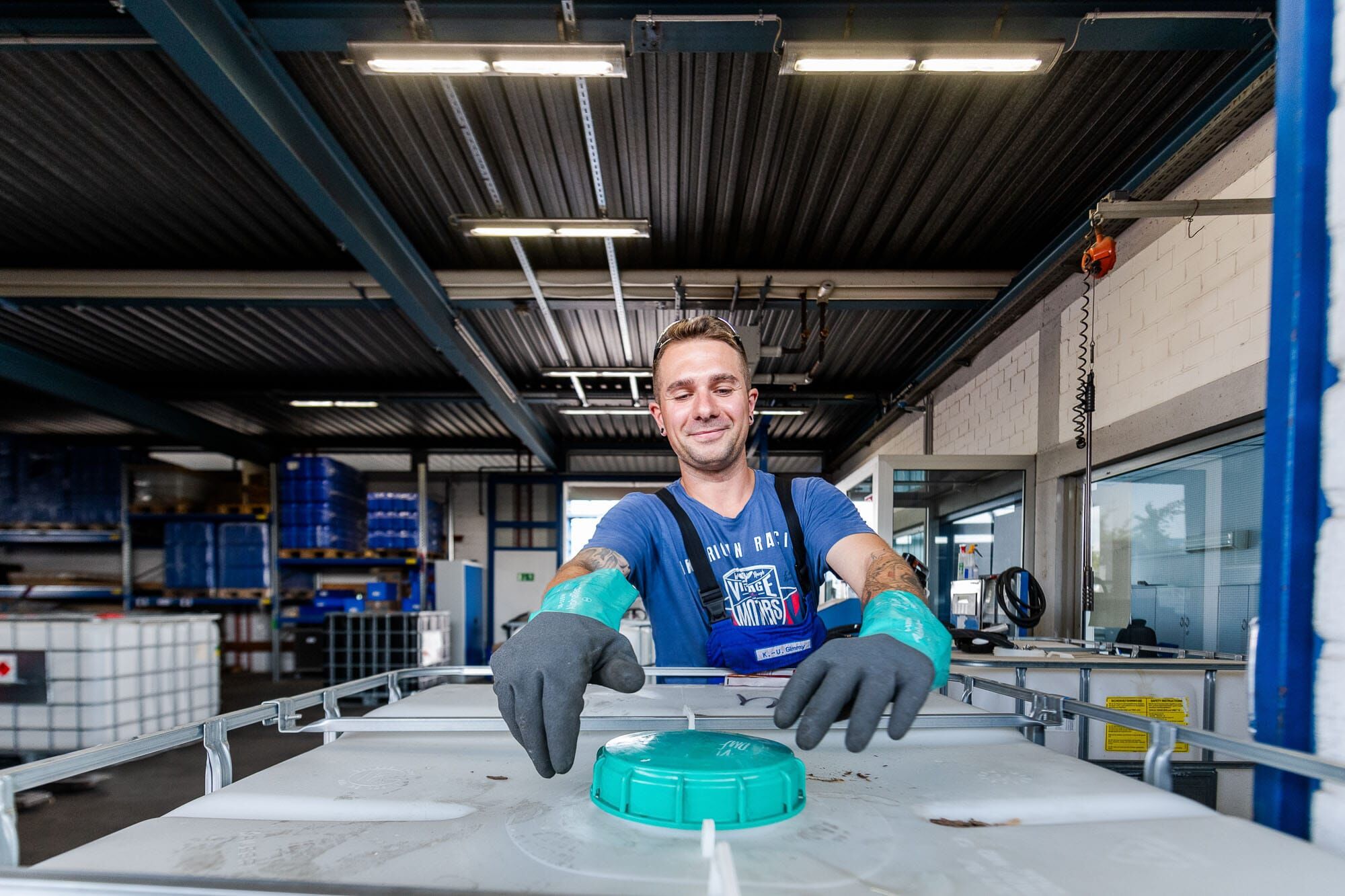 Mann arbeitet in einem Lager mit großen Behältern.