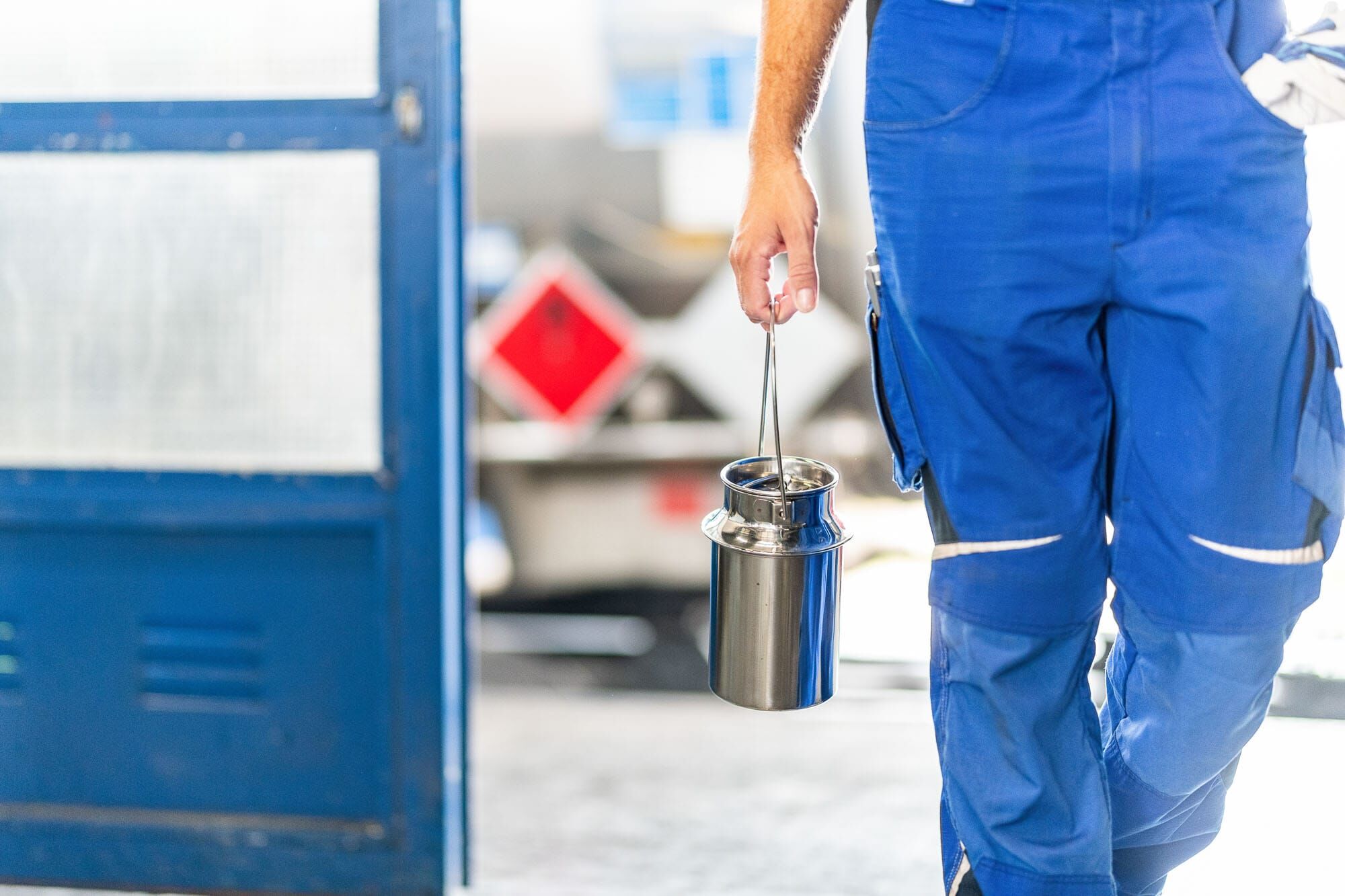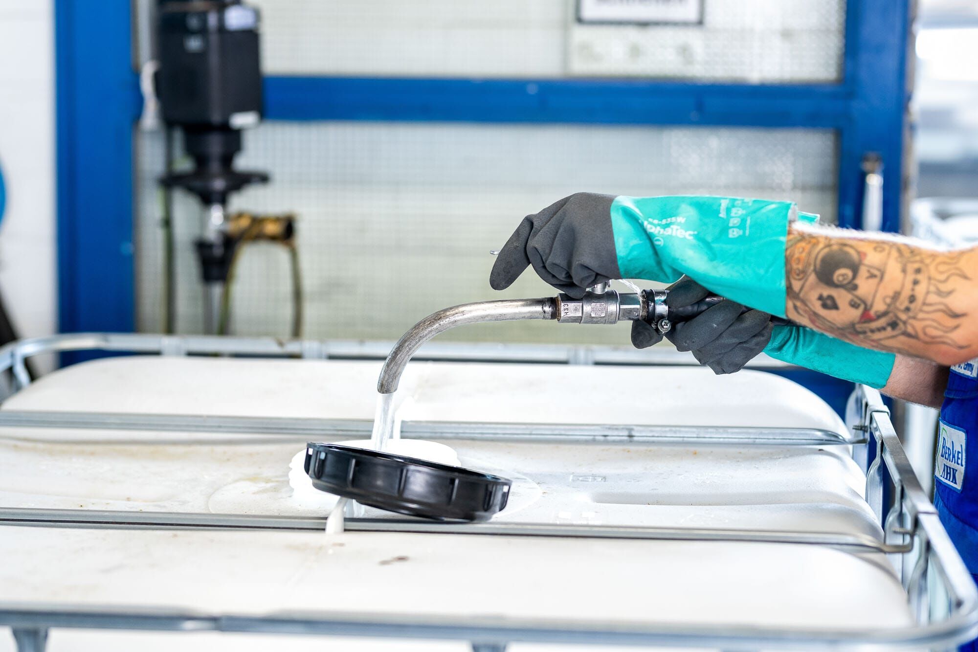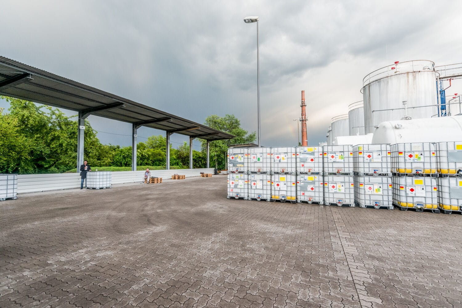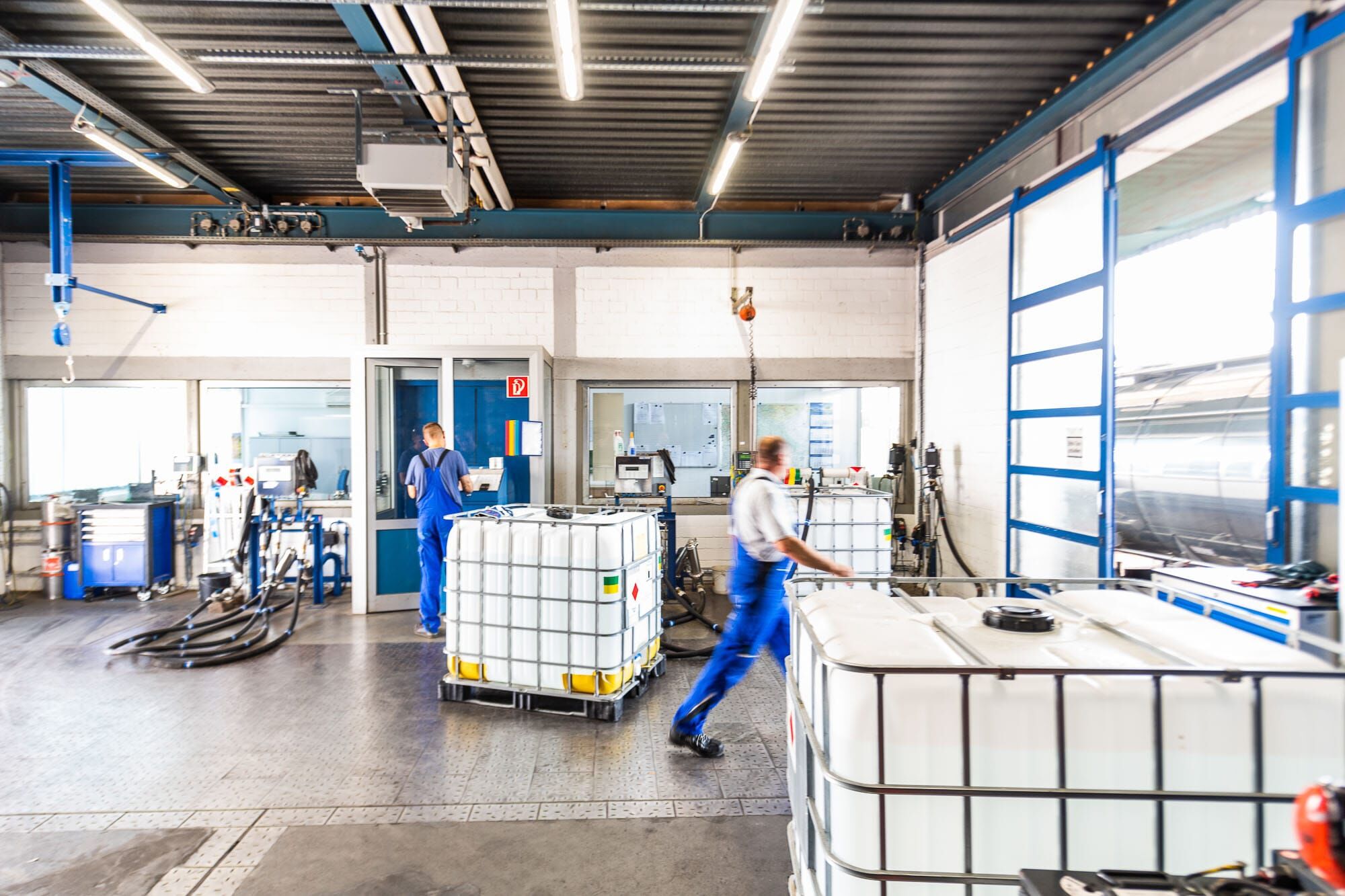 Mann arbeitet in einem Lager mit großen Behältern.