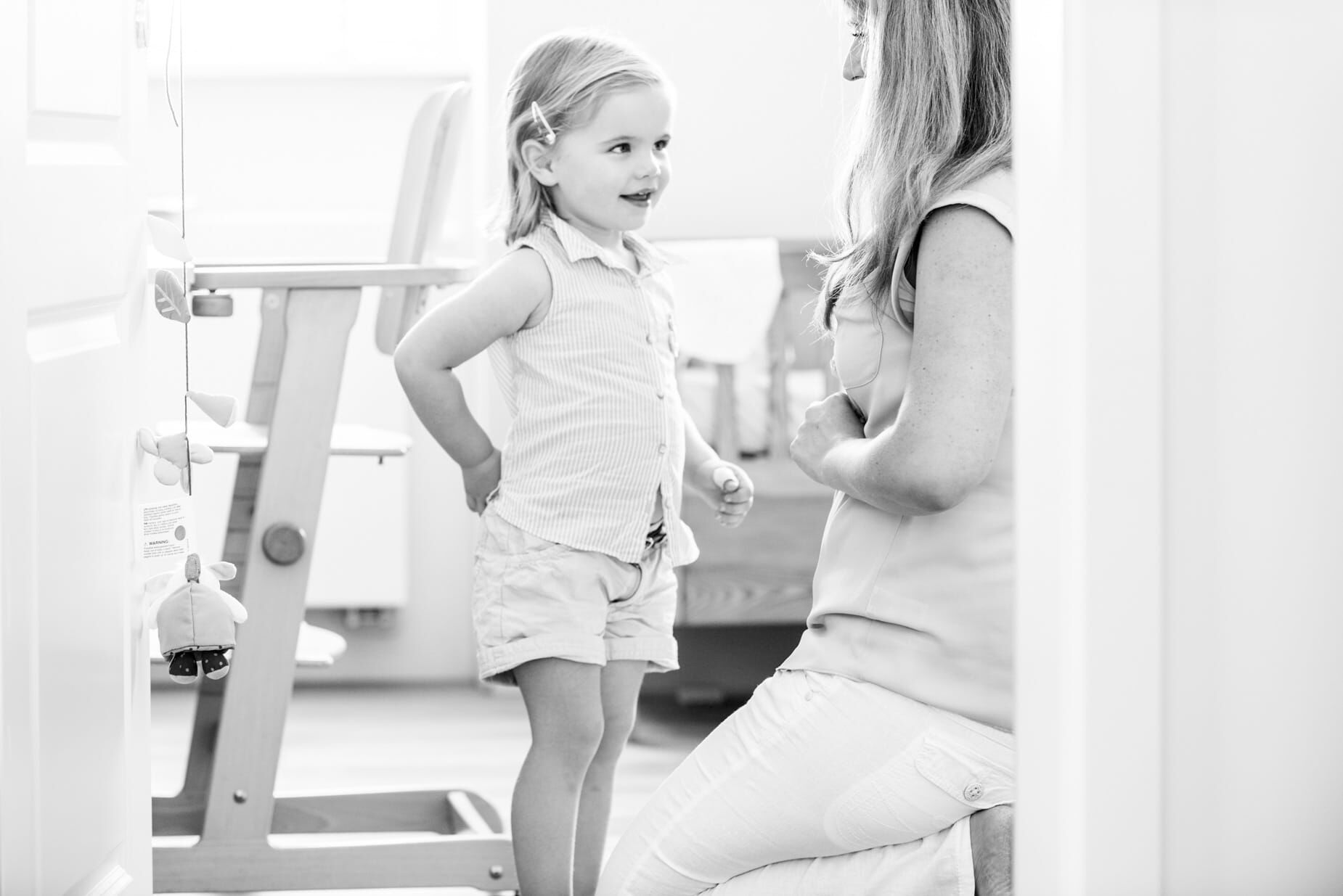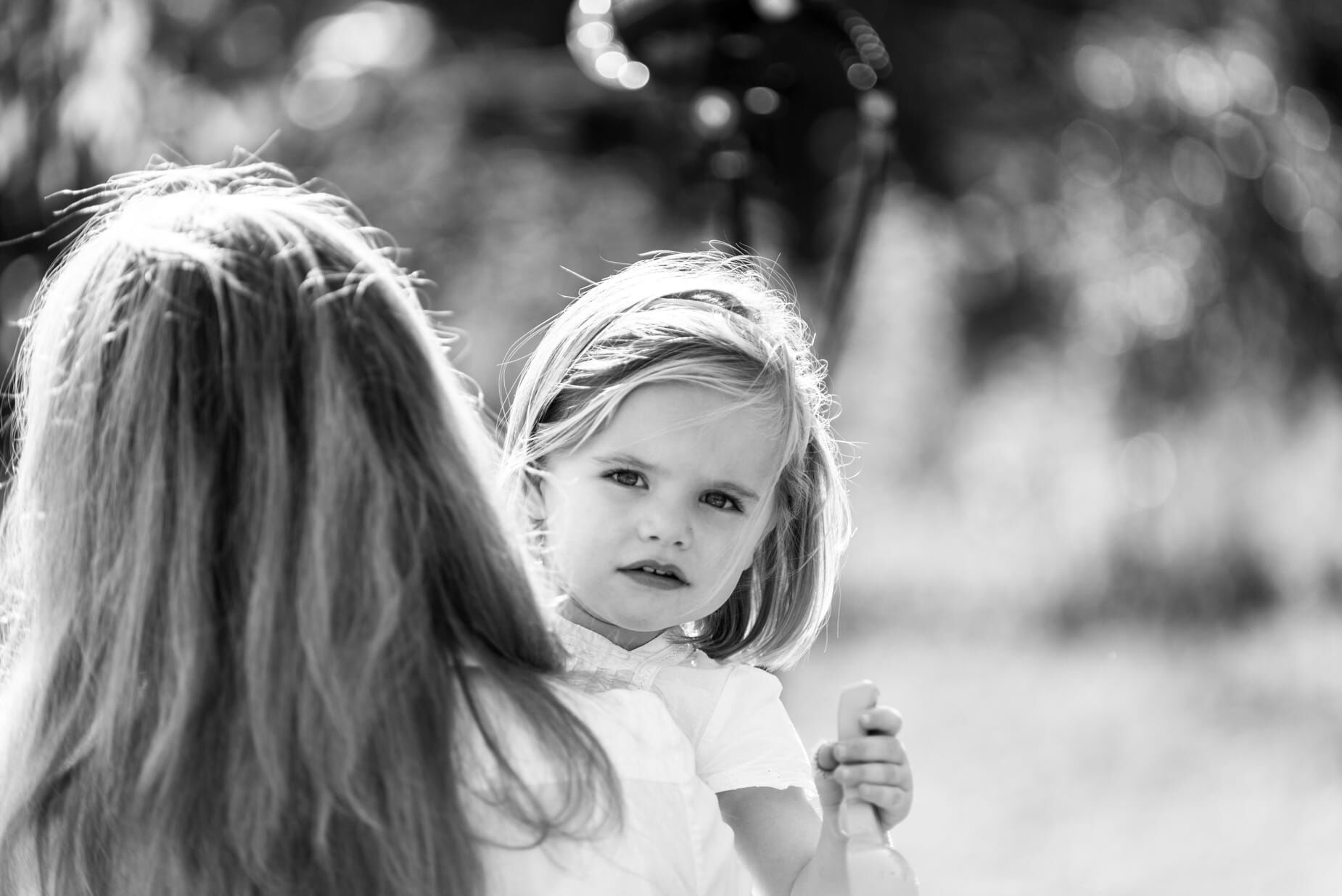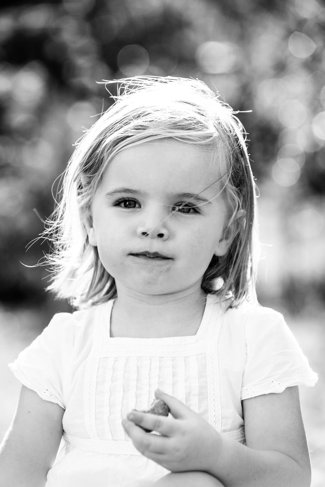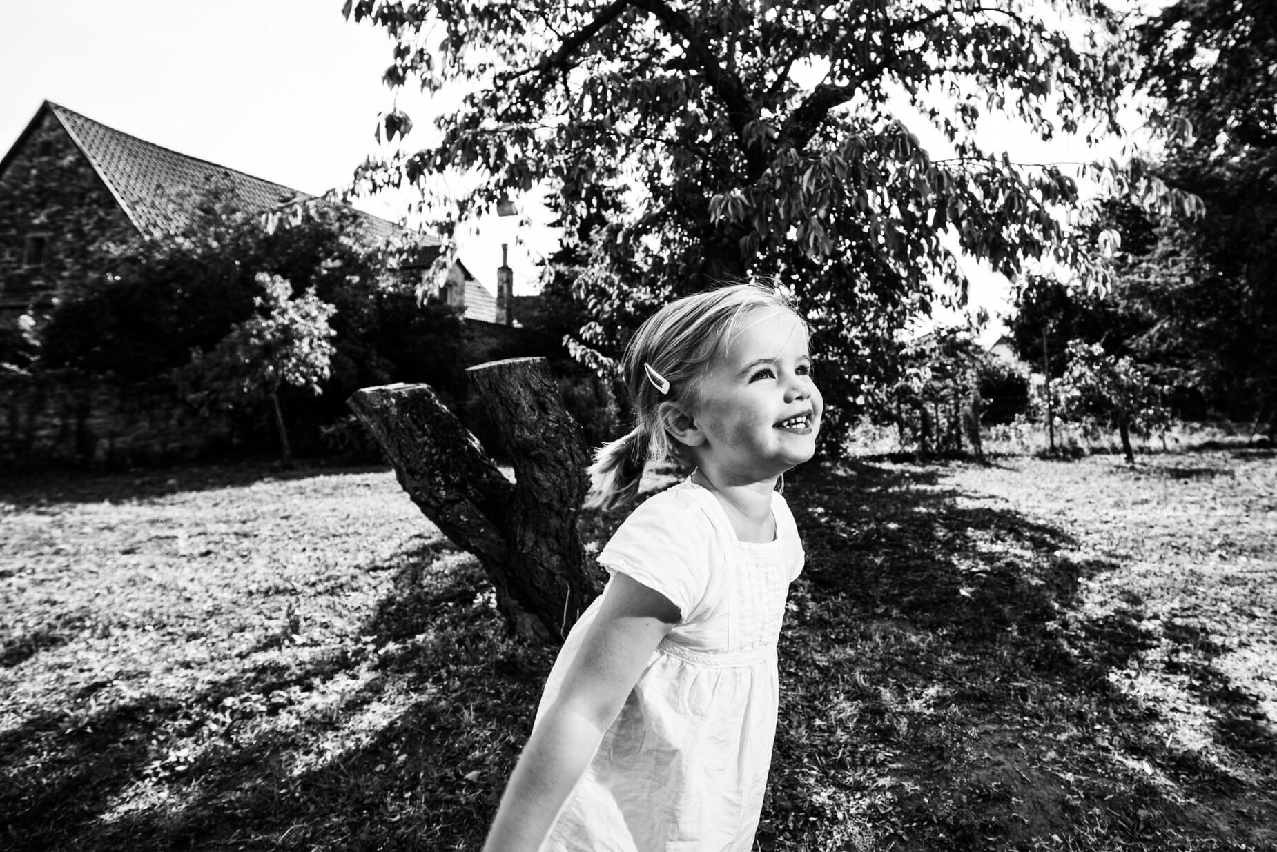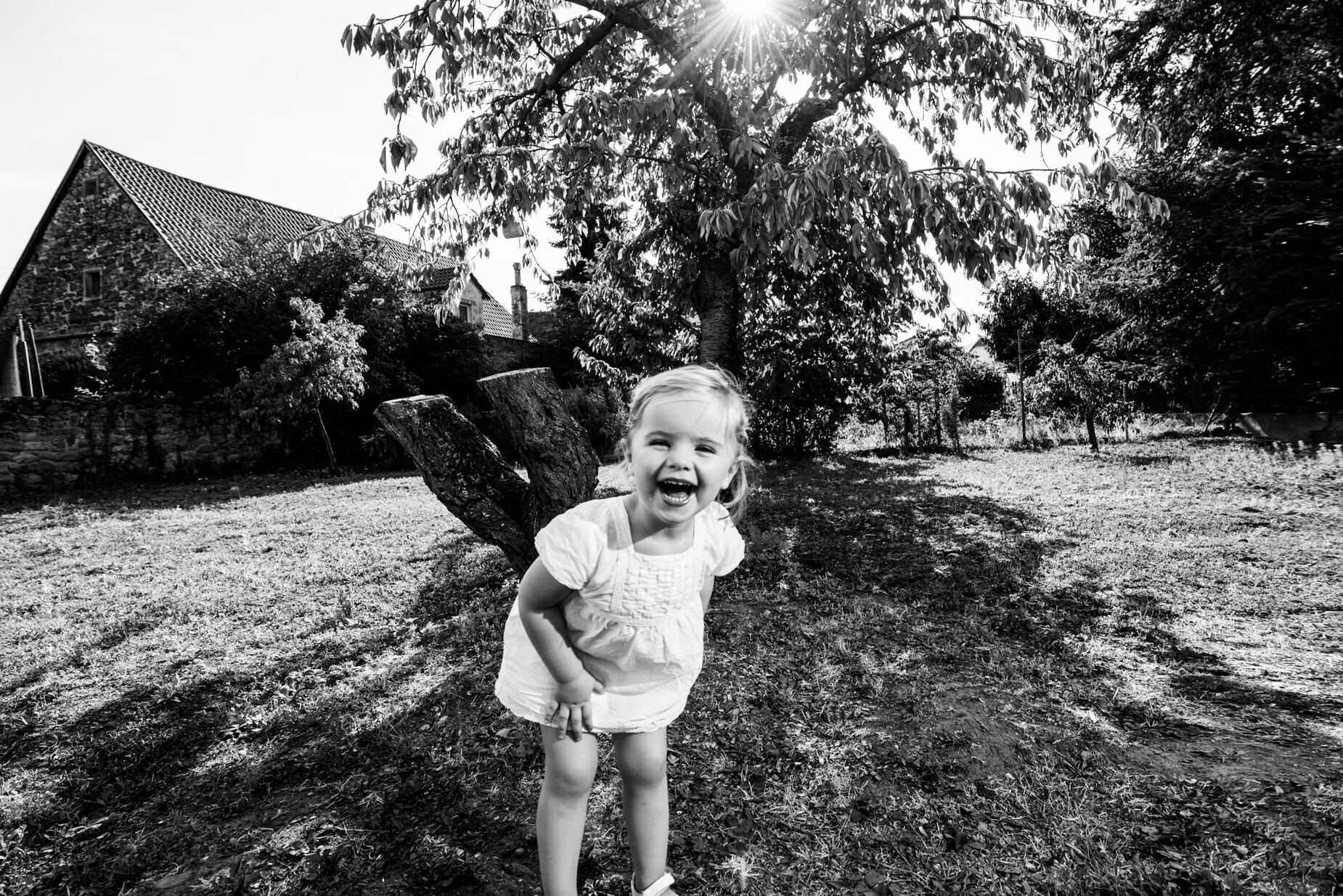 Lachendes Kind im Garten, schwarz-weiß Foto