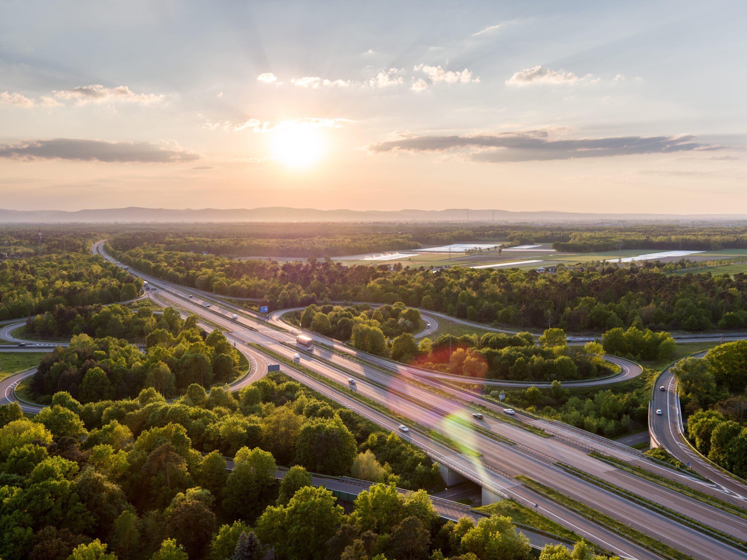 Sonnenuntergang über Autobahn und grüner Landschaft.