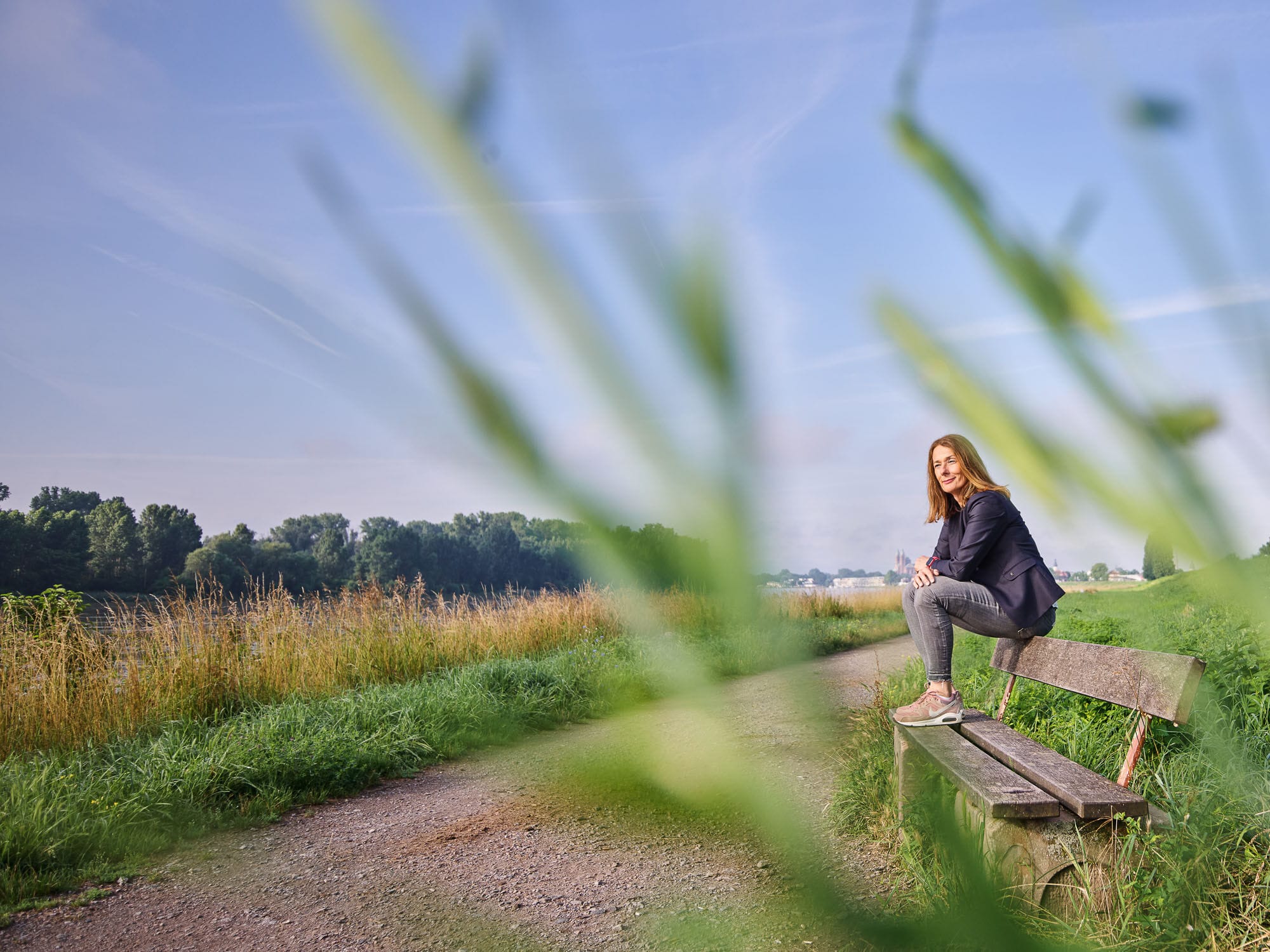 Frau sitzt auf Bank in grüner Landschaft