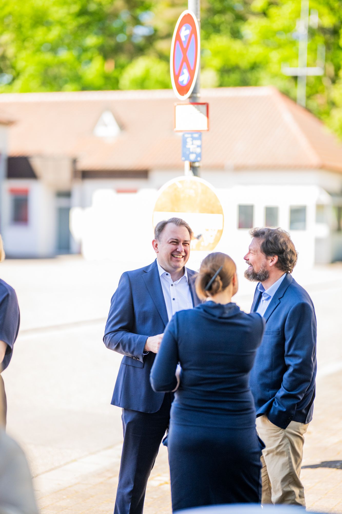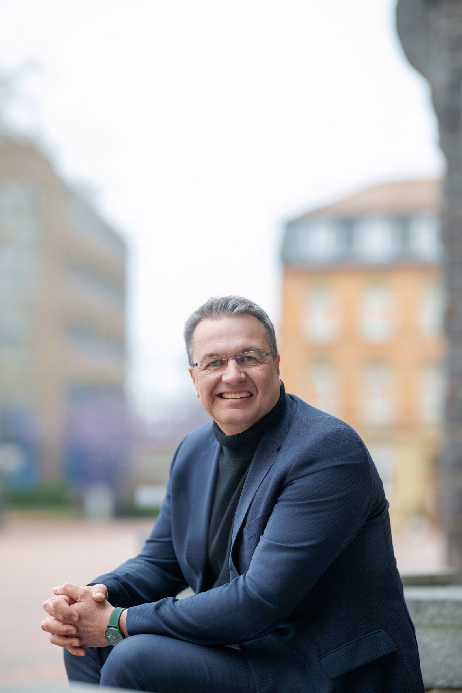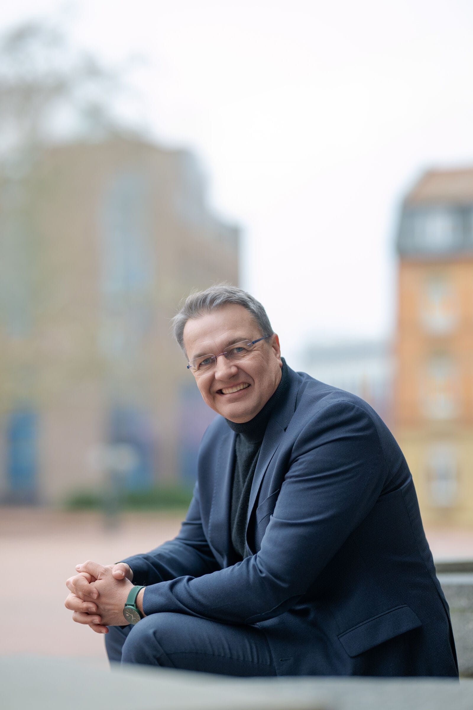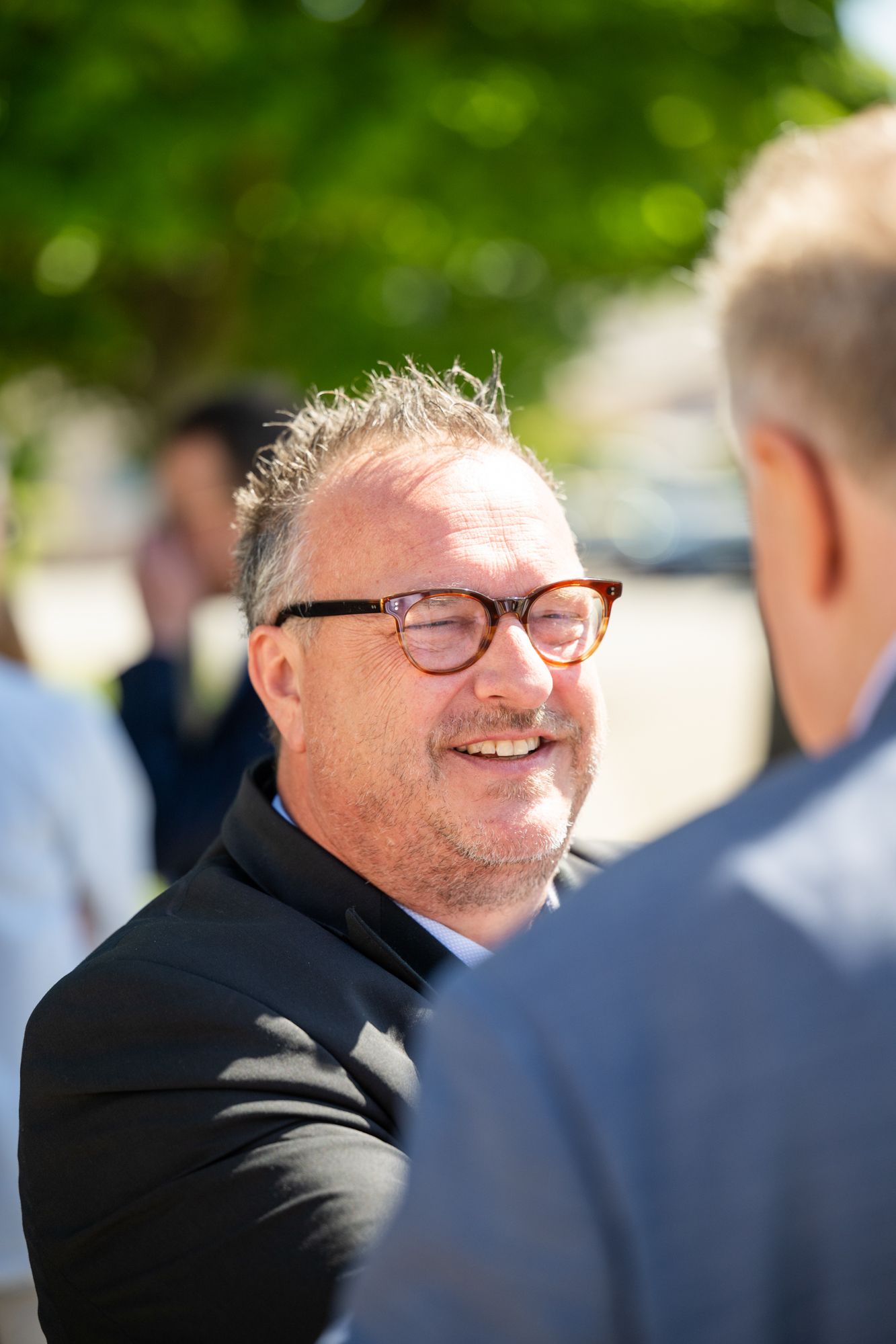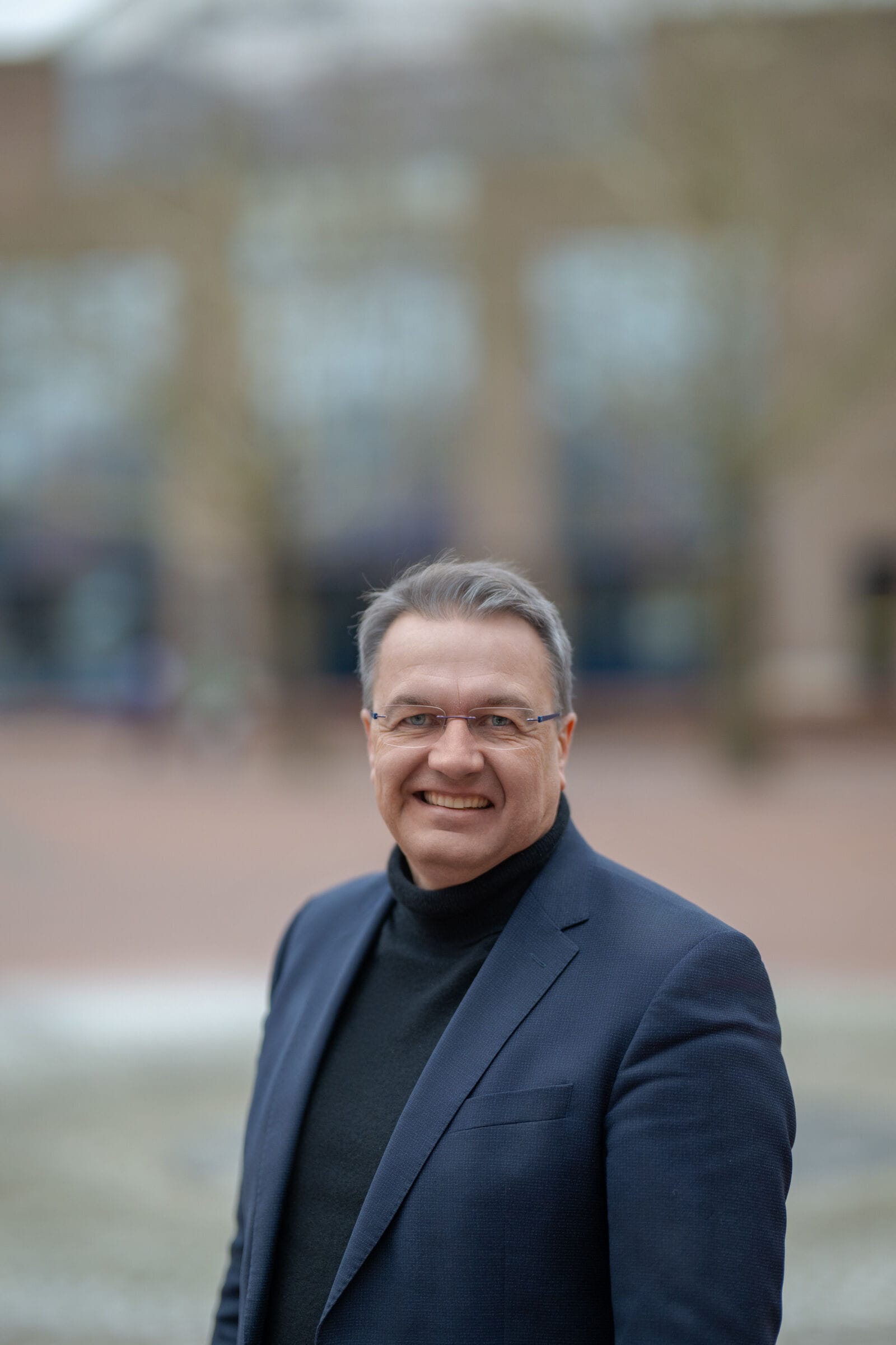 Mann im Anzug lächelnd draußen
