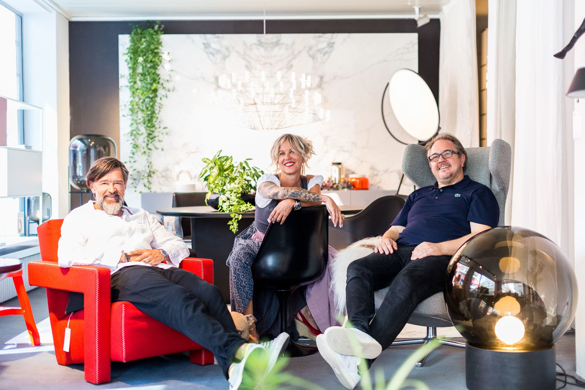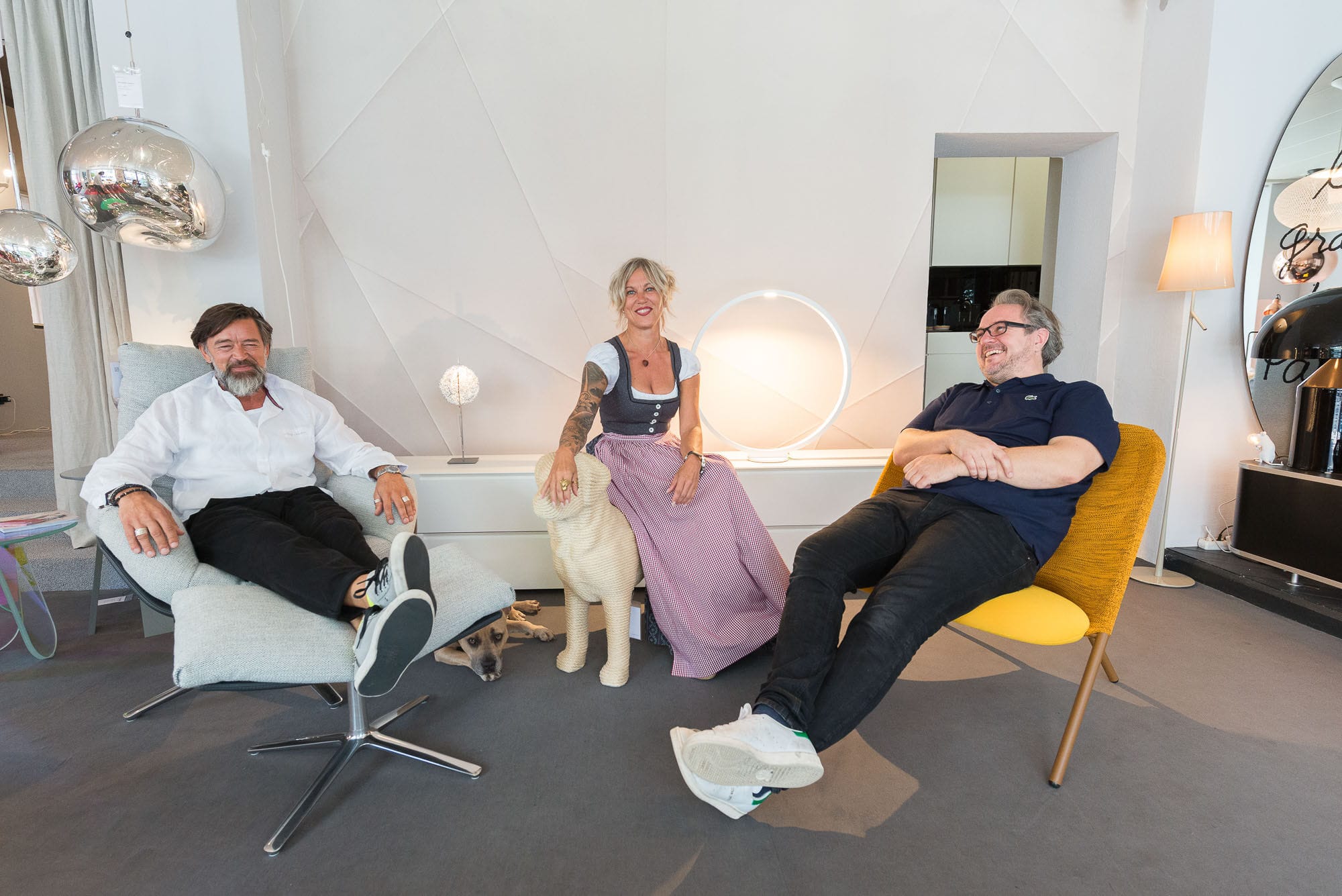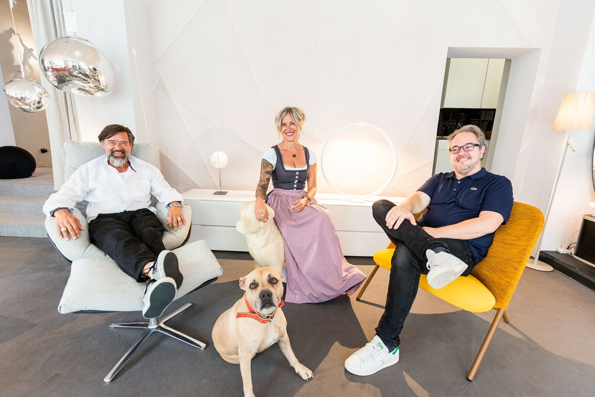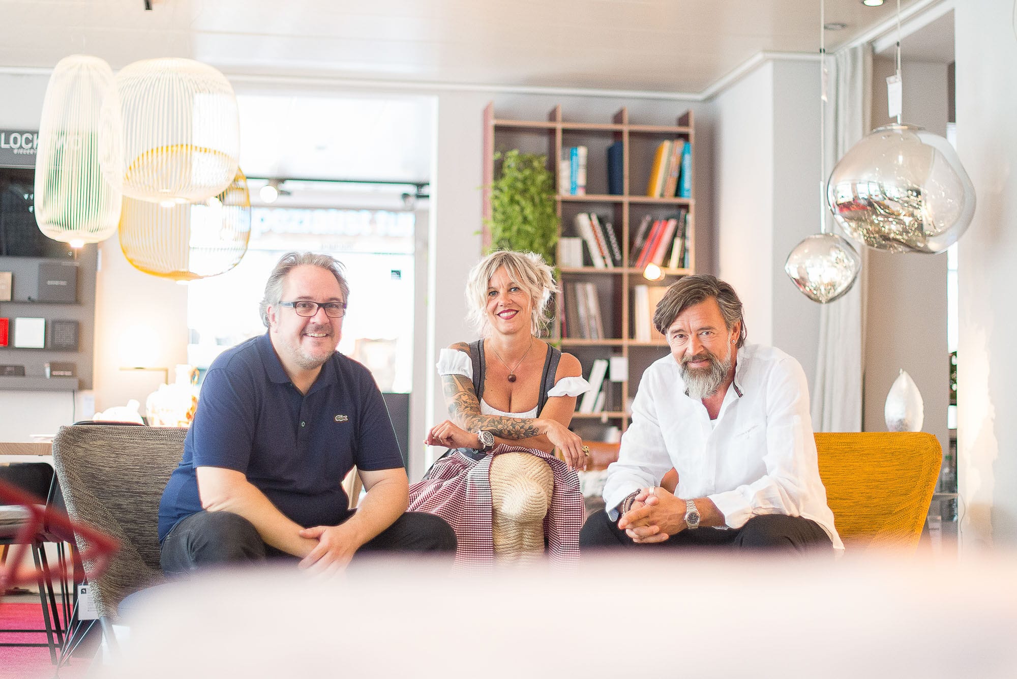 Drei Menschen in einem modernen Wohnzimmer.