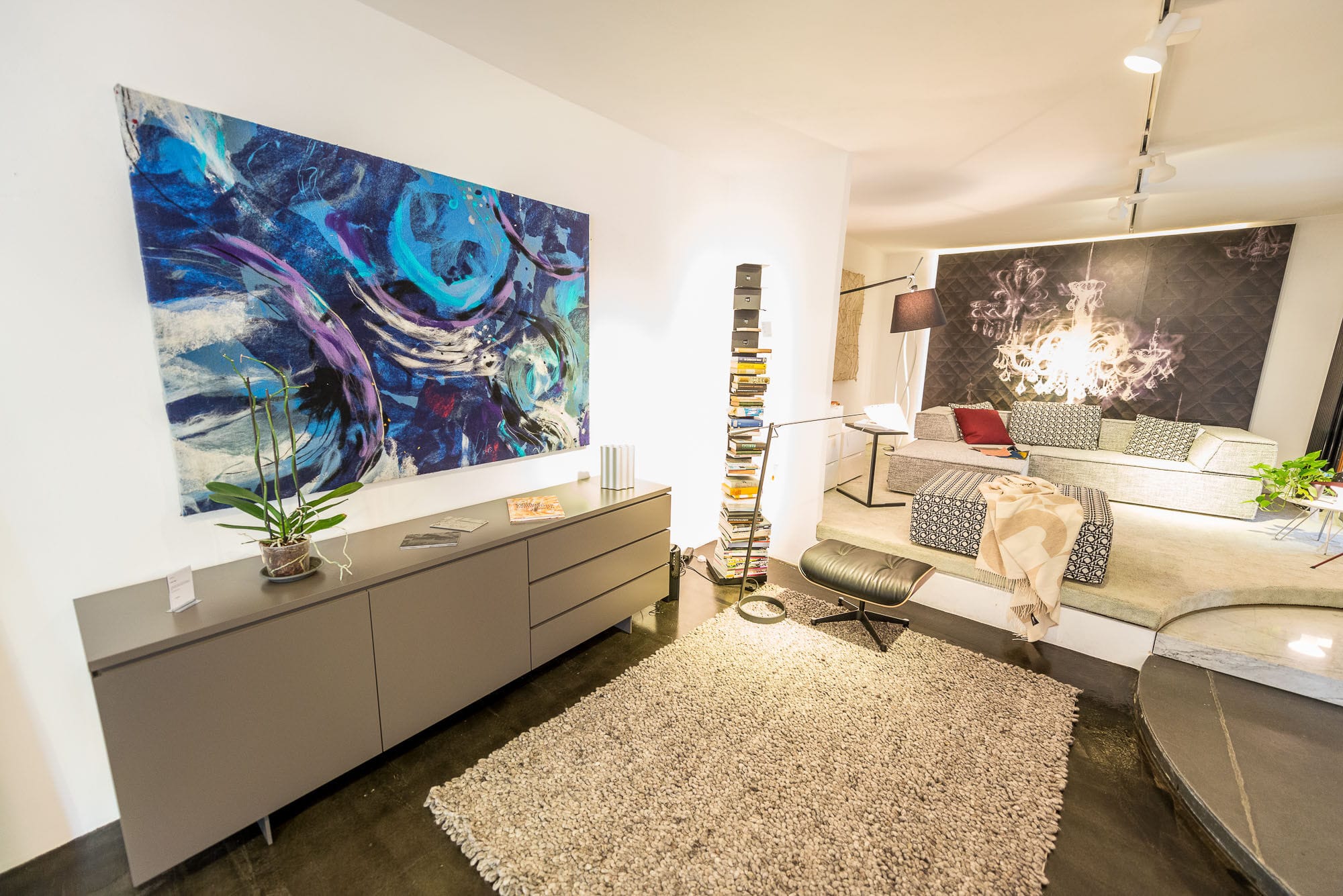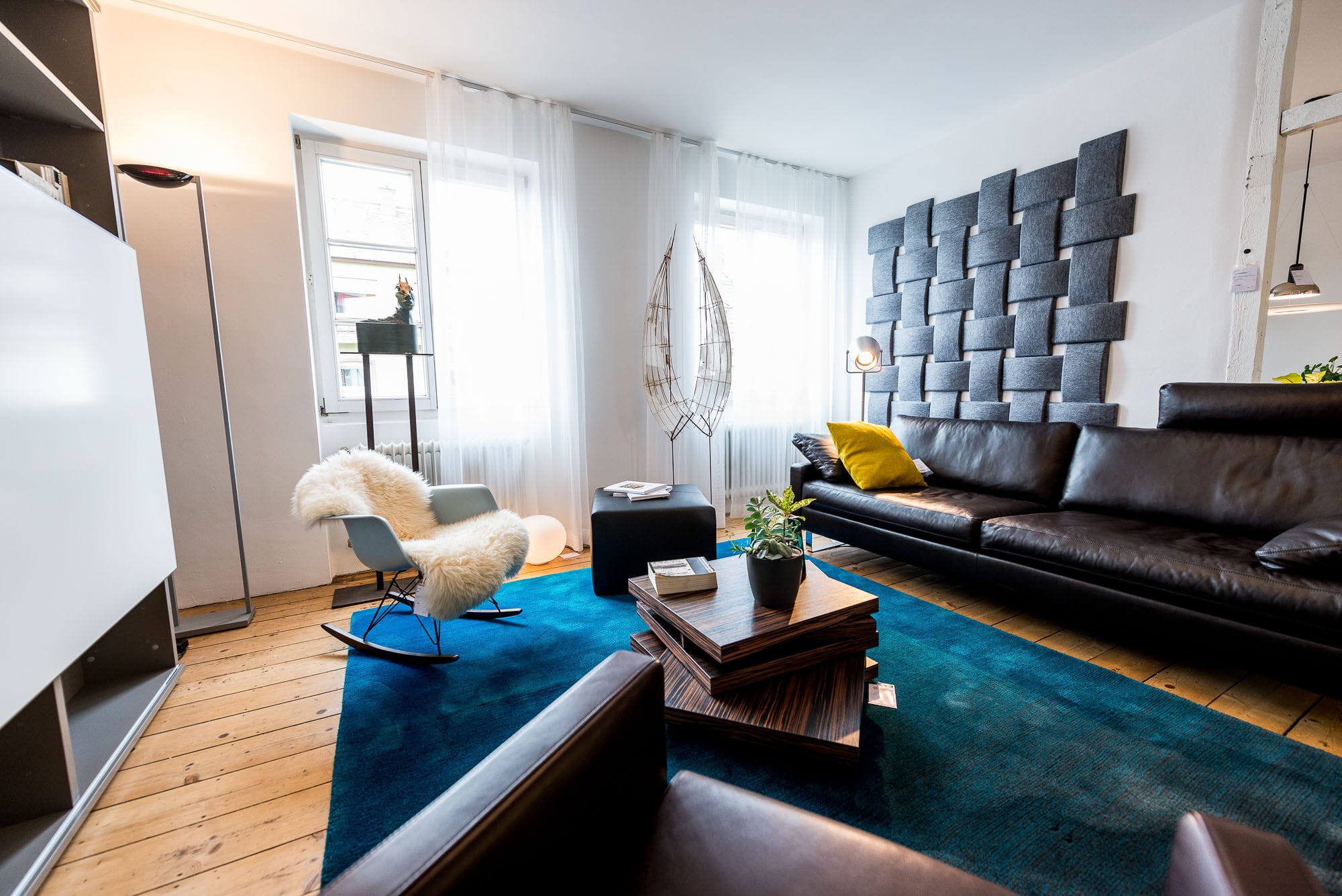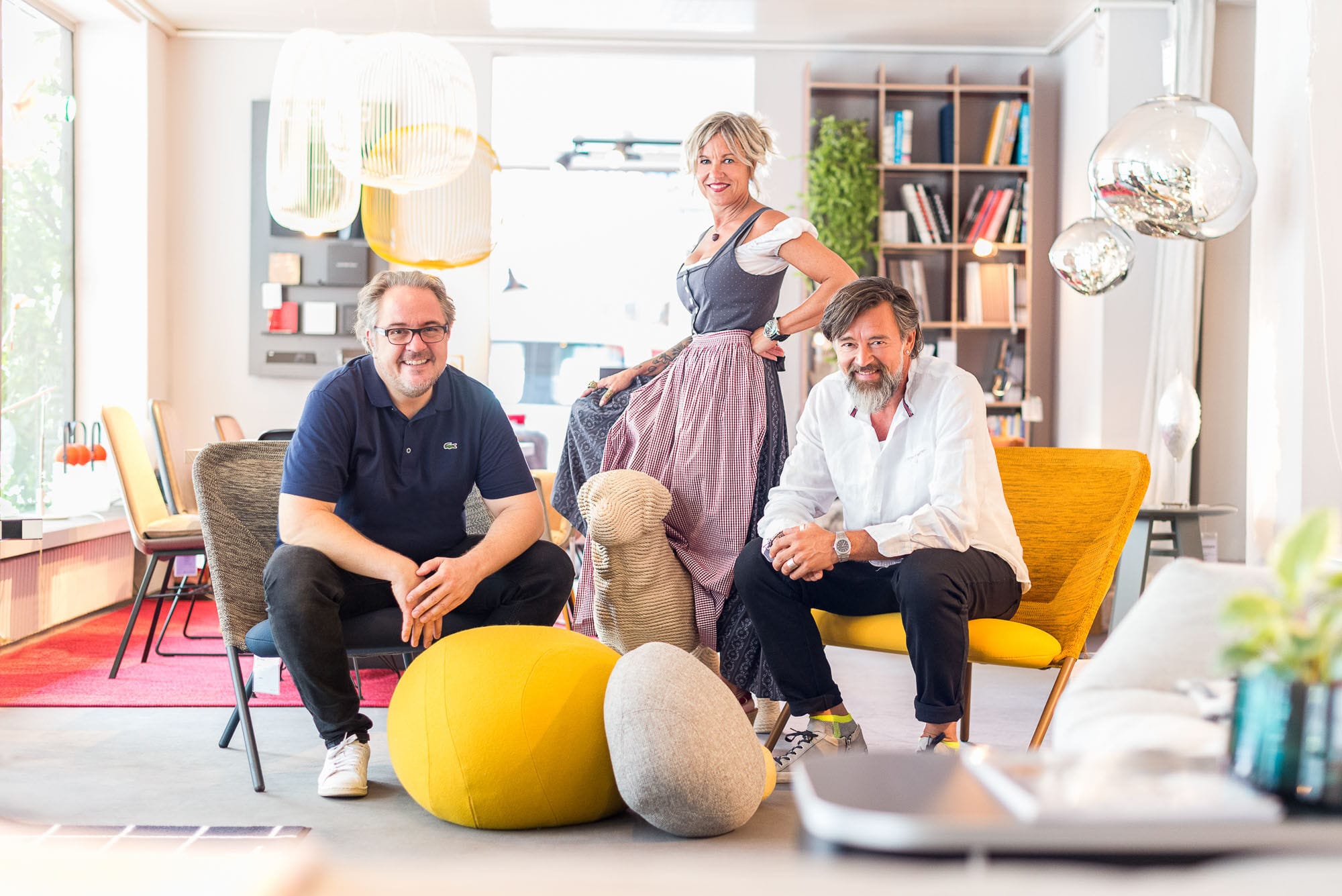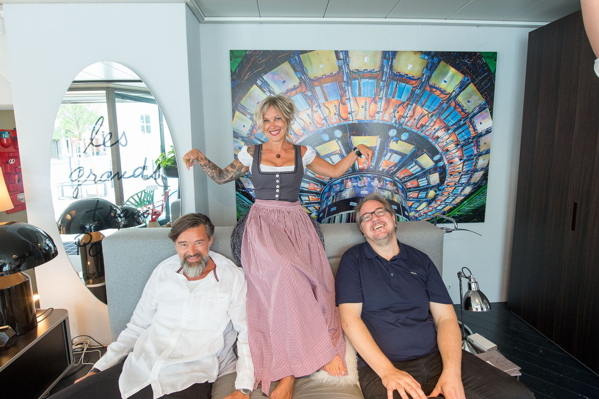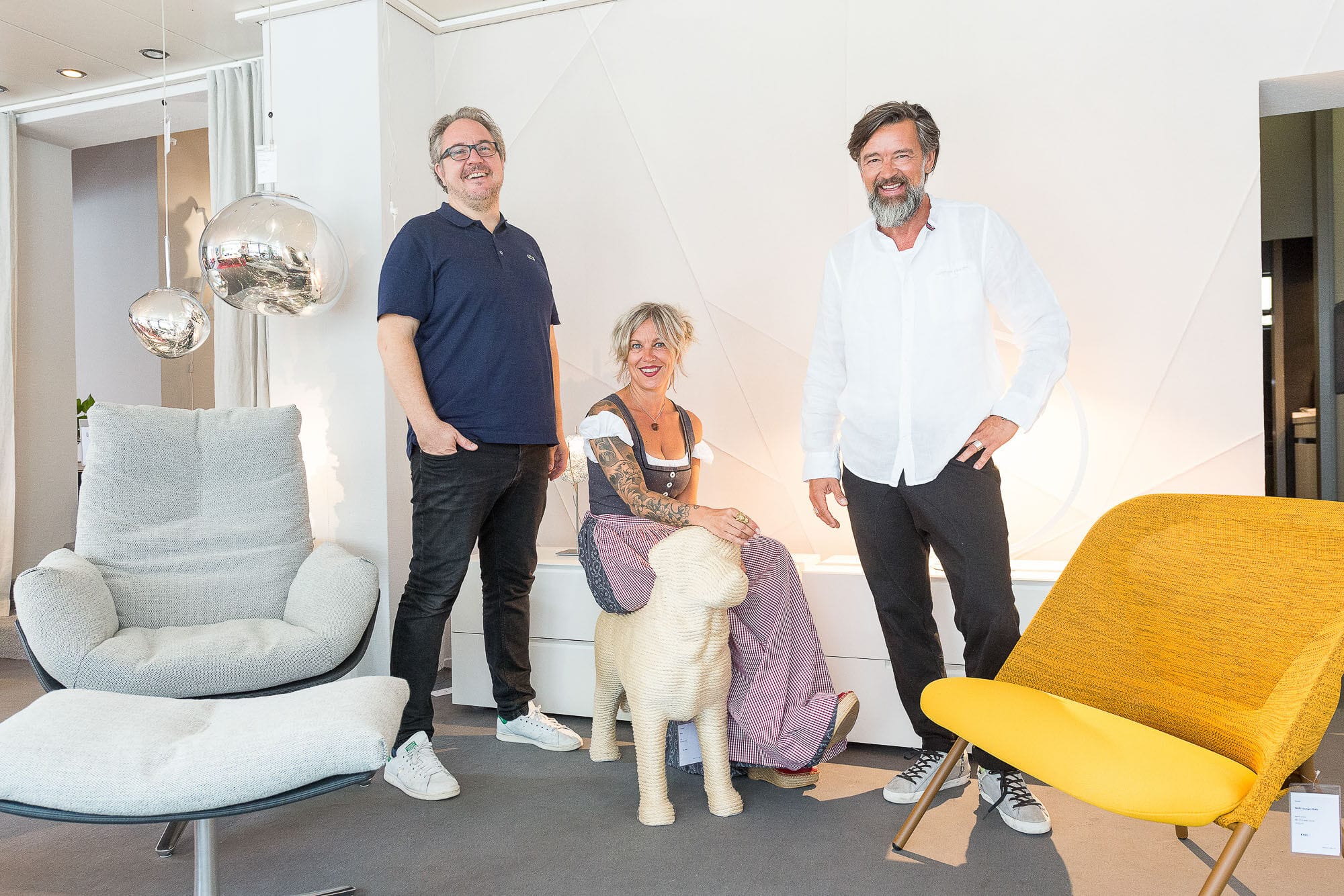 Drei Menschen in einem modernen Wohnzimmer.