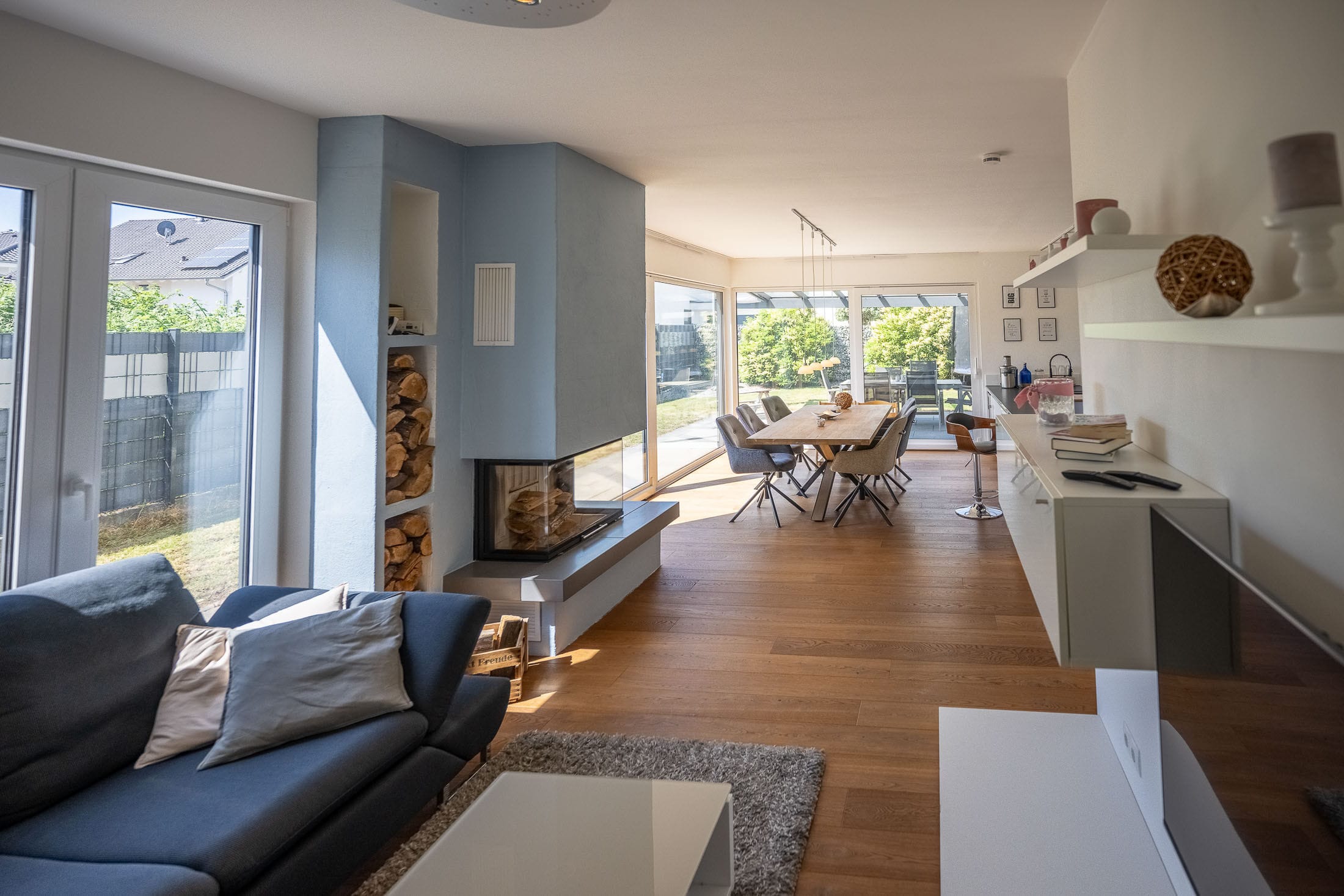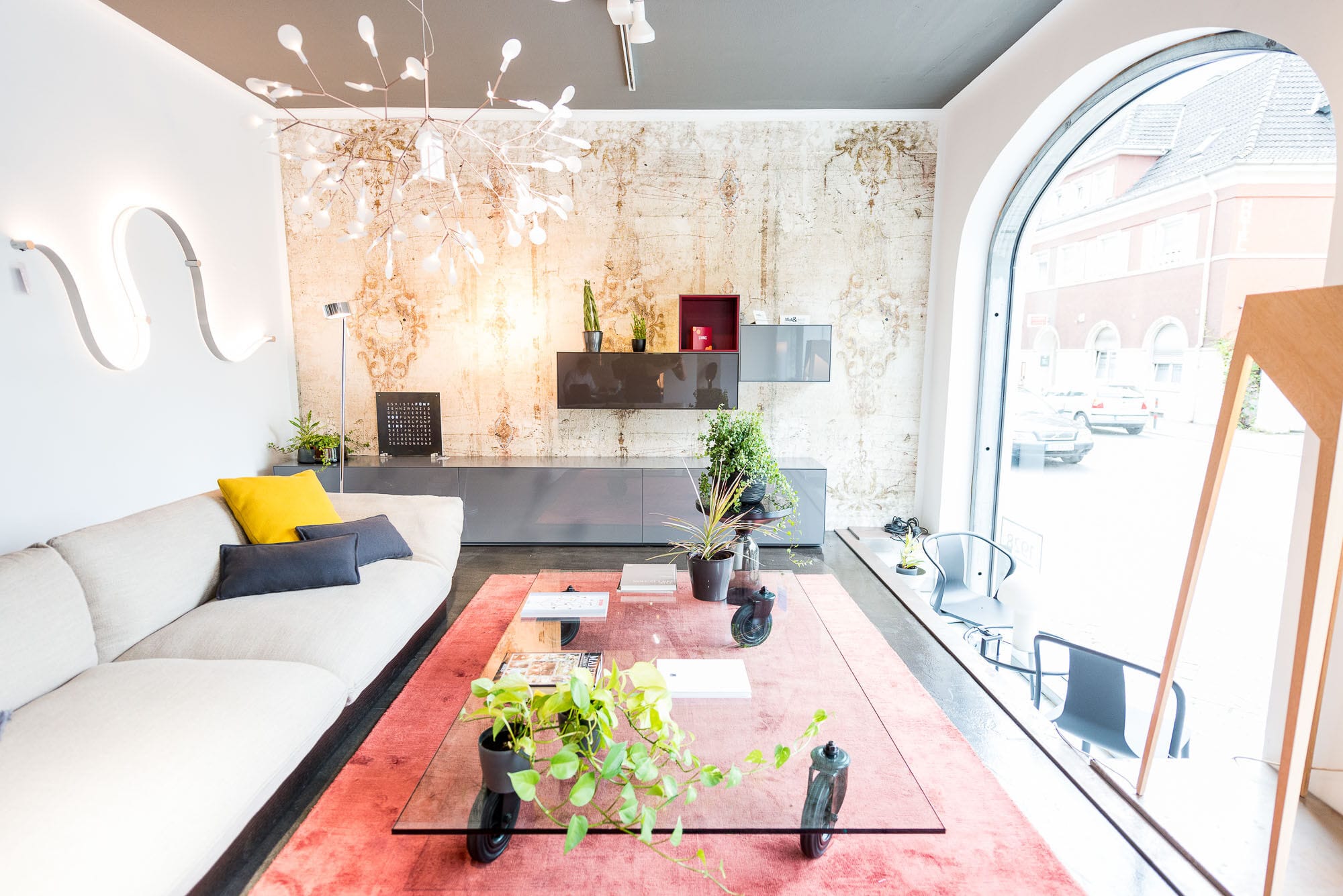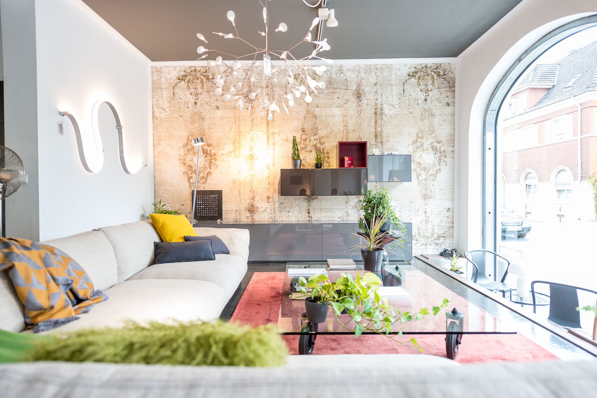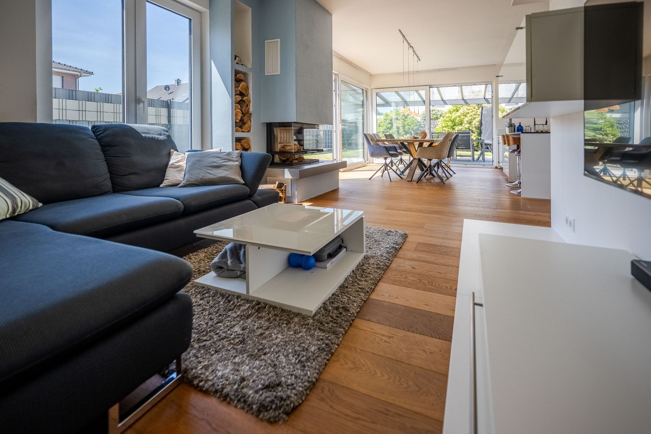 Drei Menschen in einem modernen Wohnzimmer.