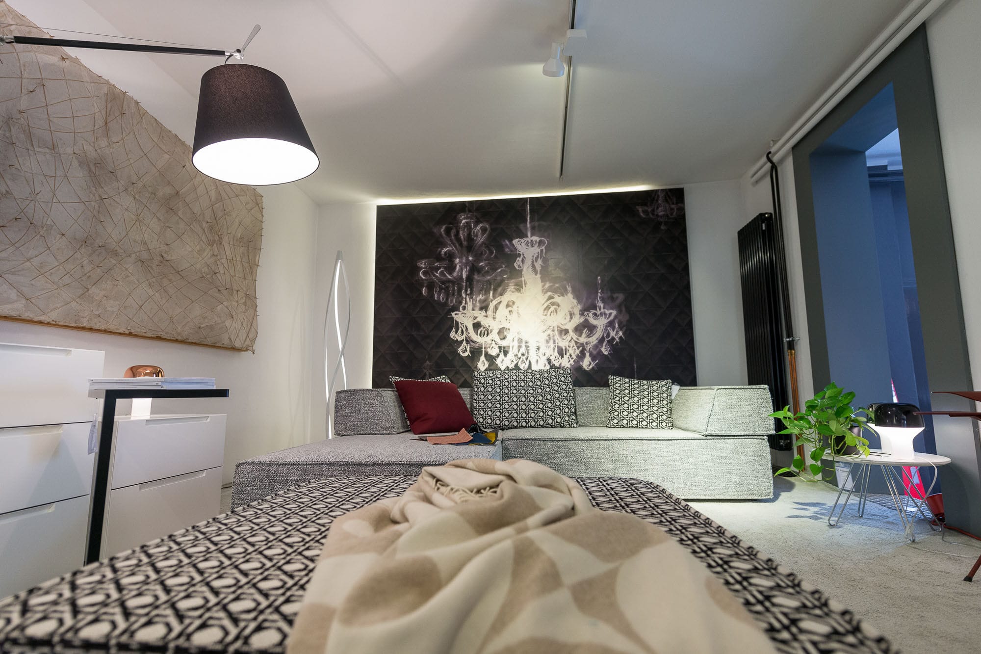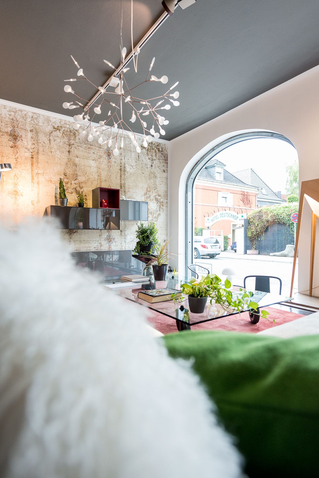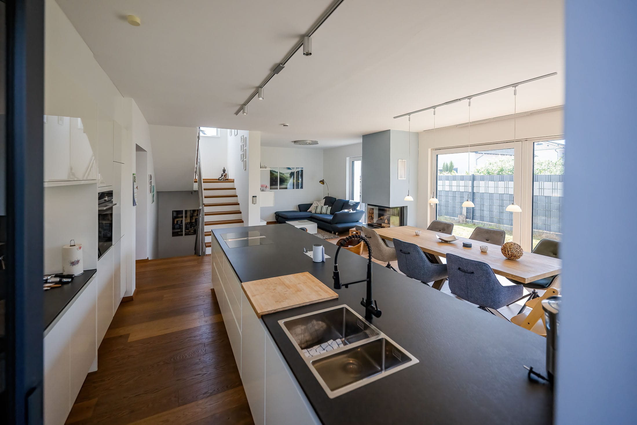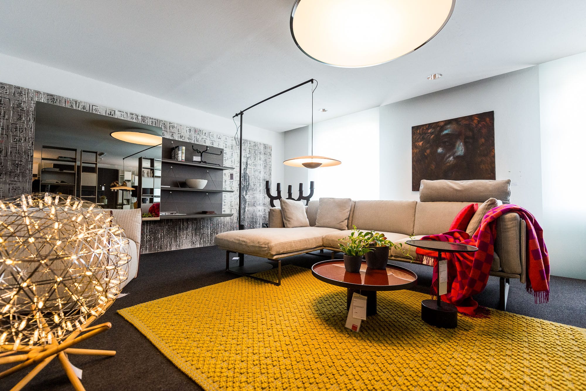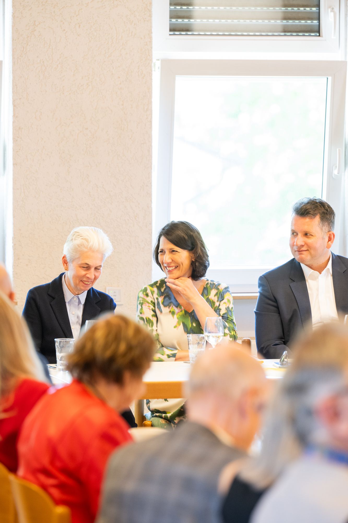 Drei Menschen in einem modernen Wohnzimmer.