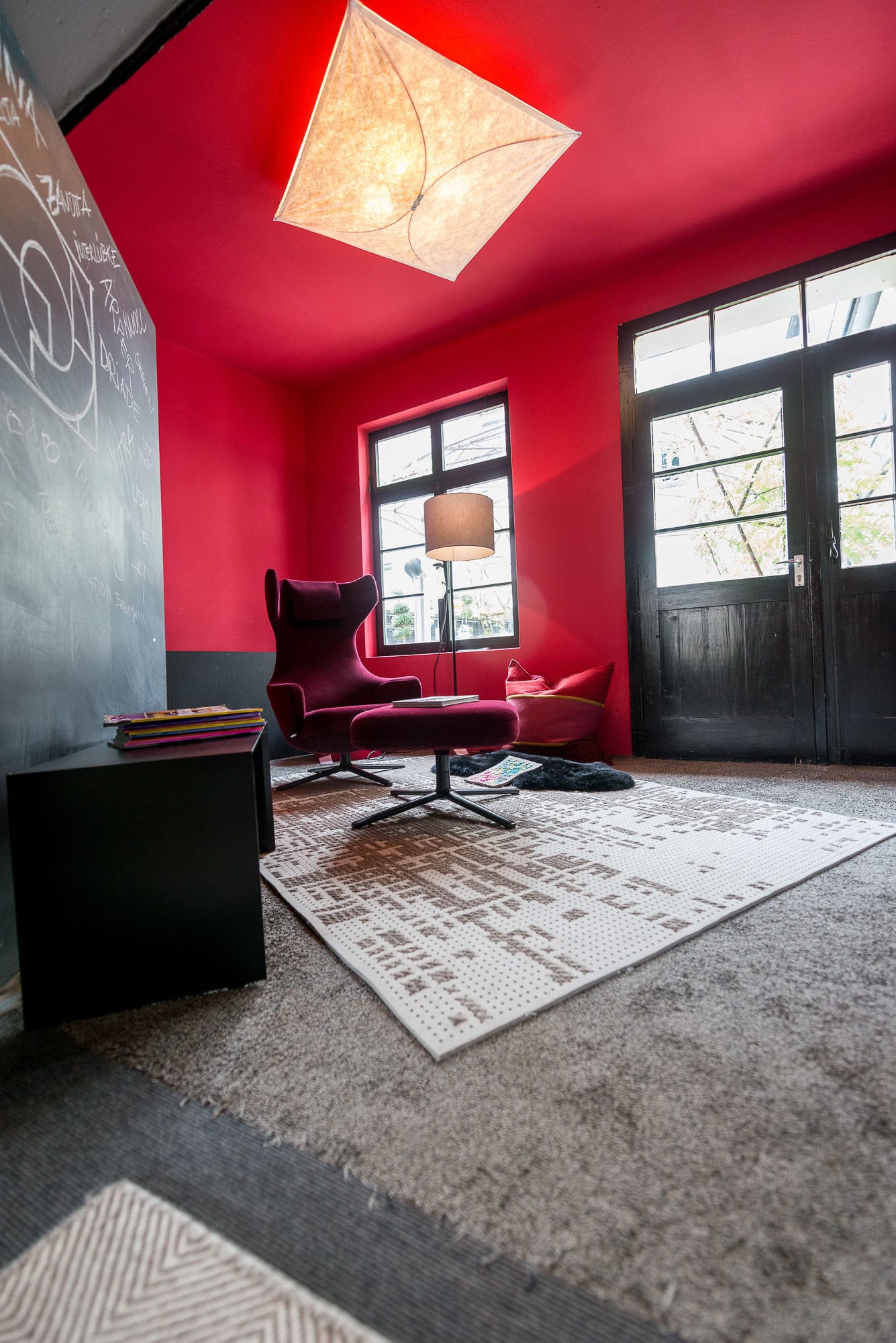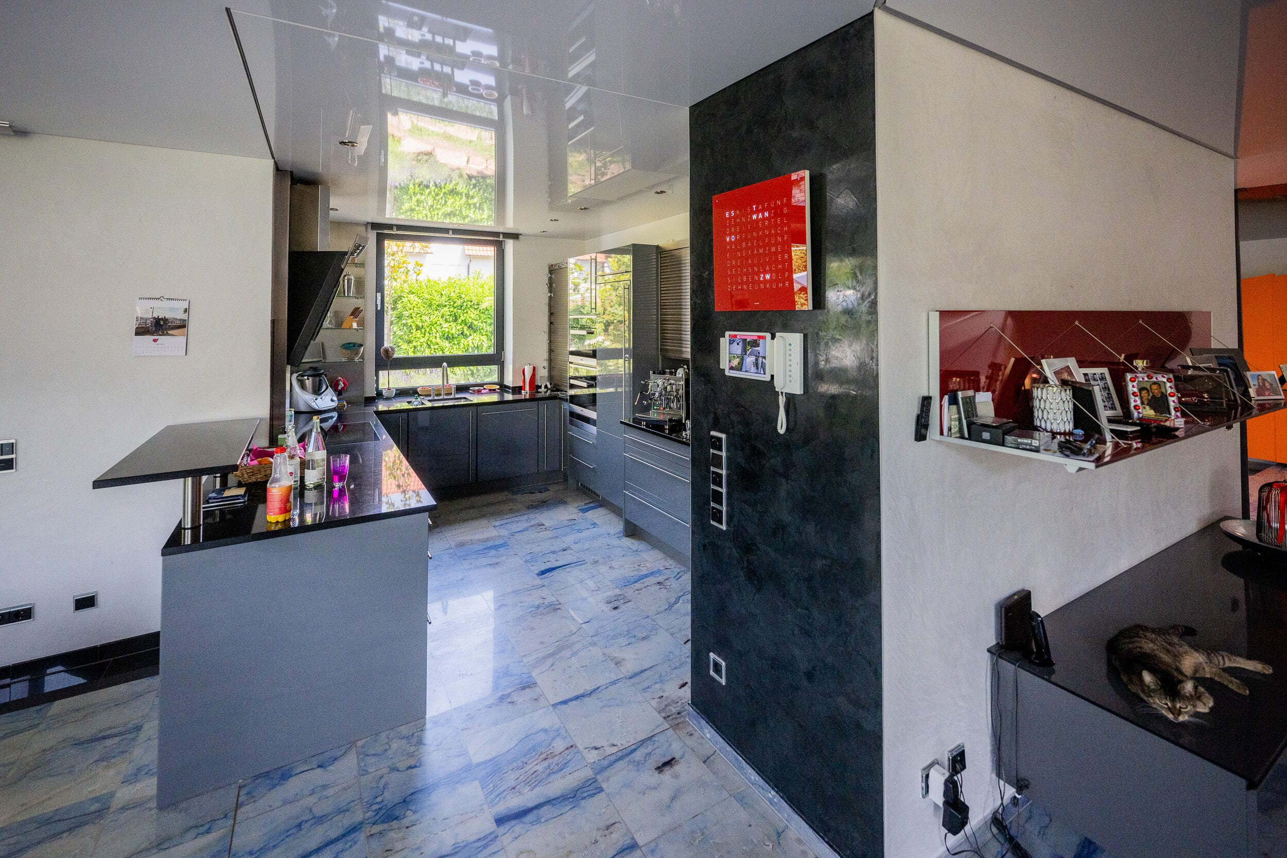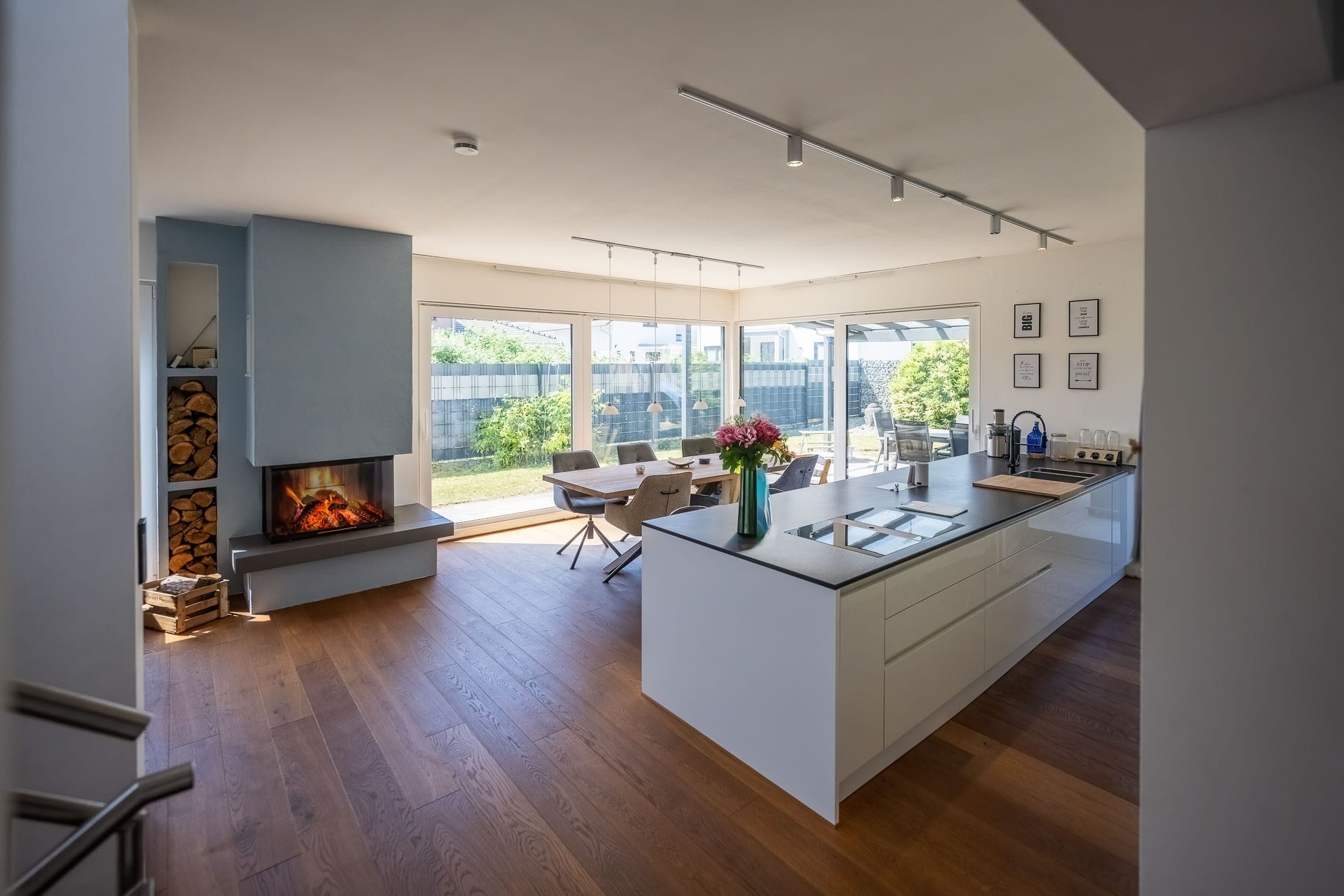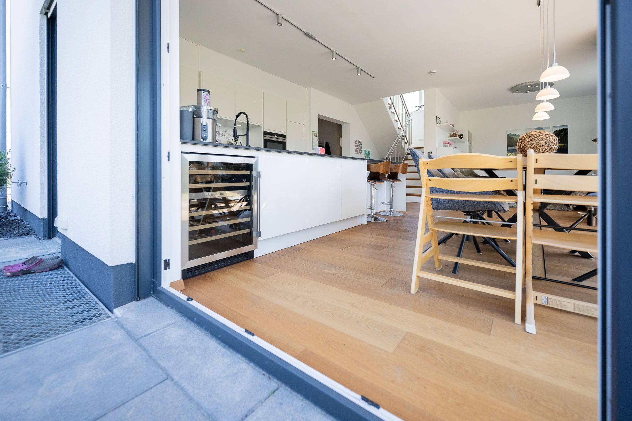 Drei Menschen in einem modernen Wohnzimmer.