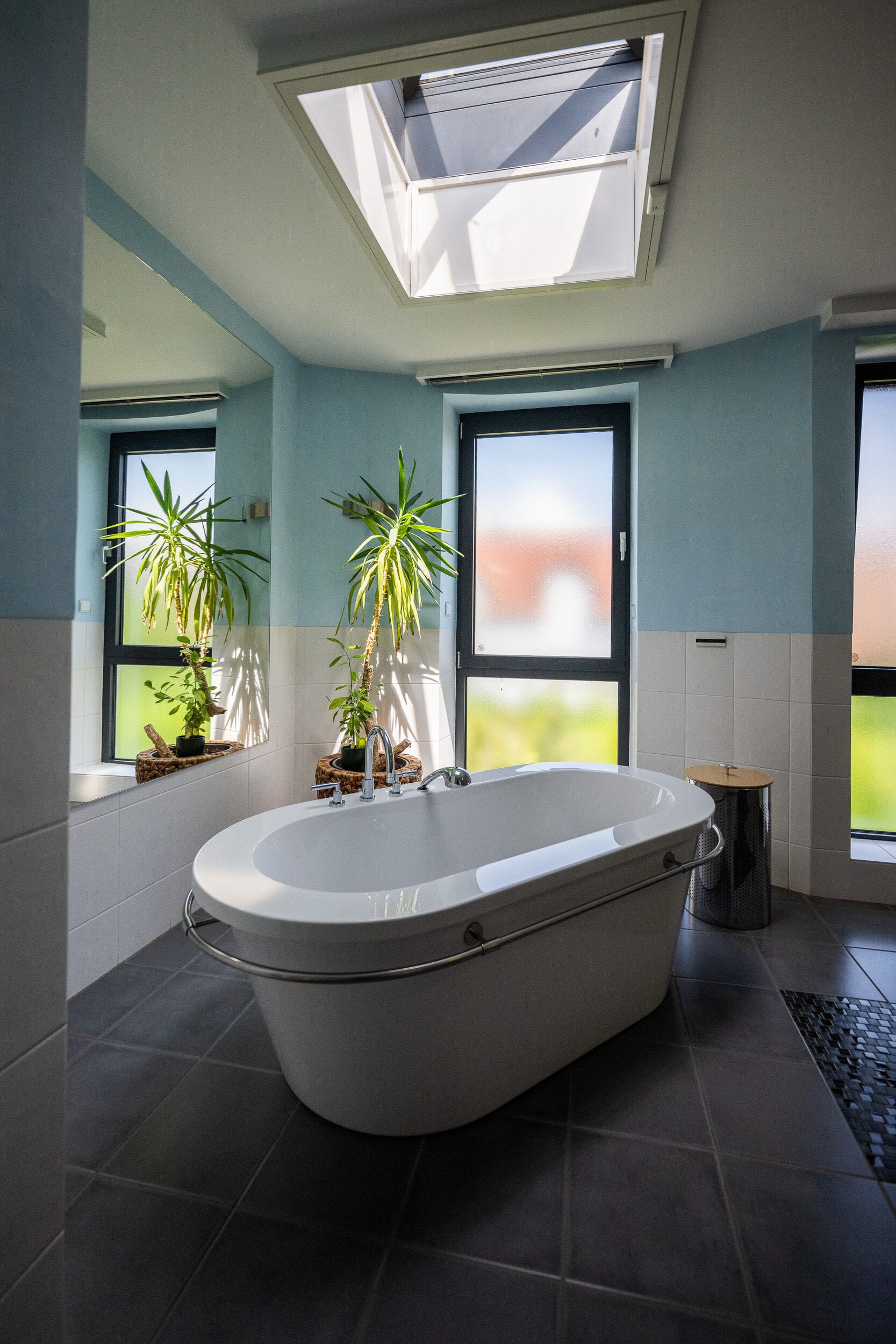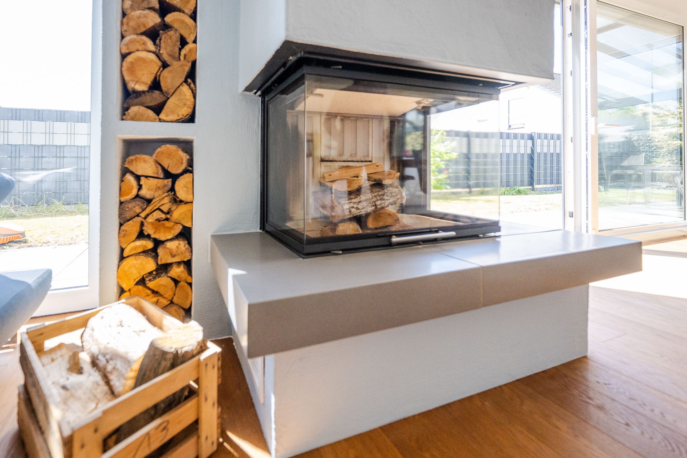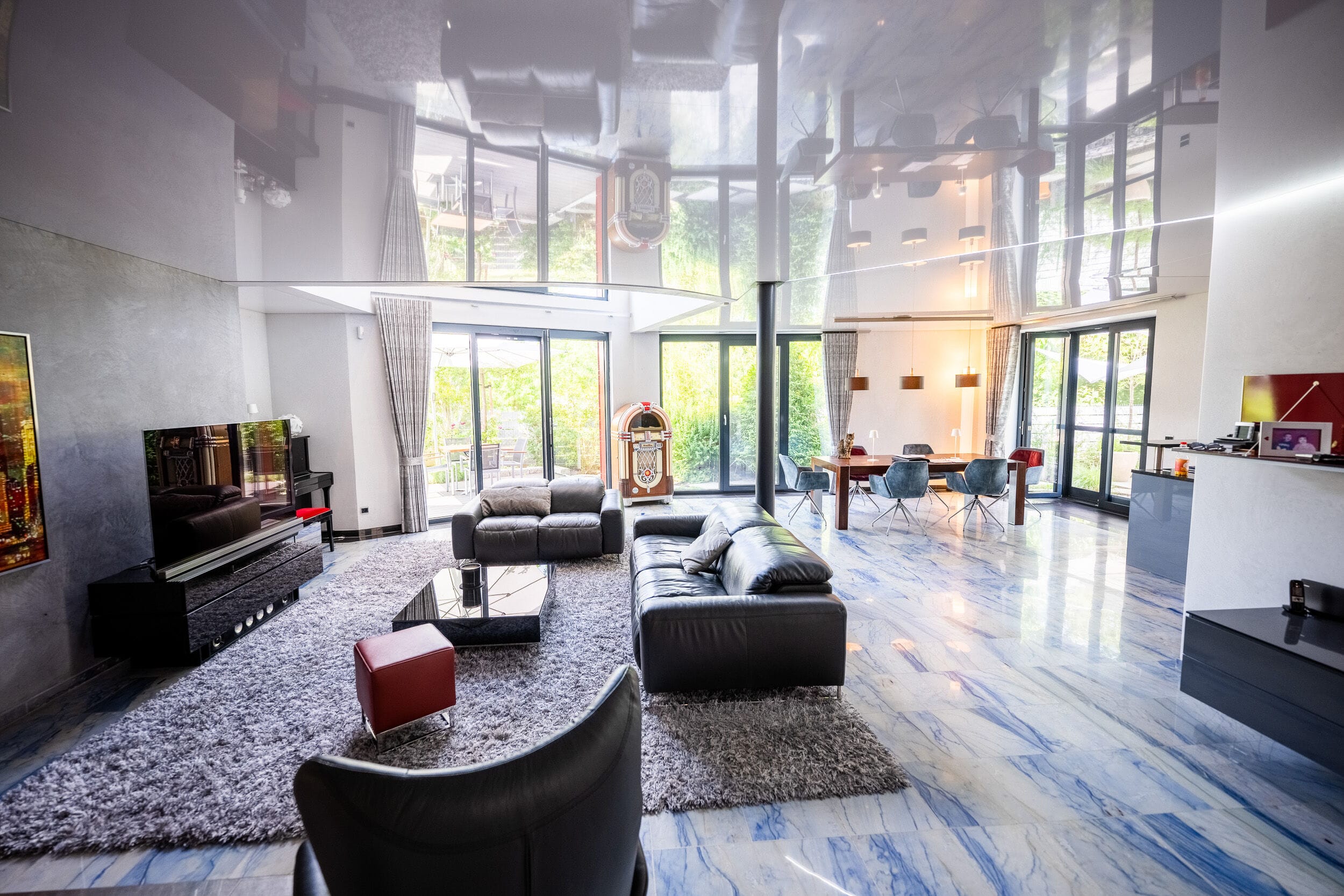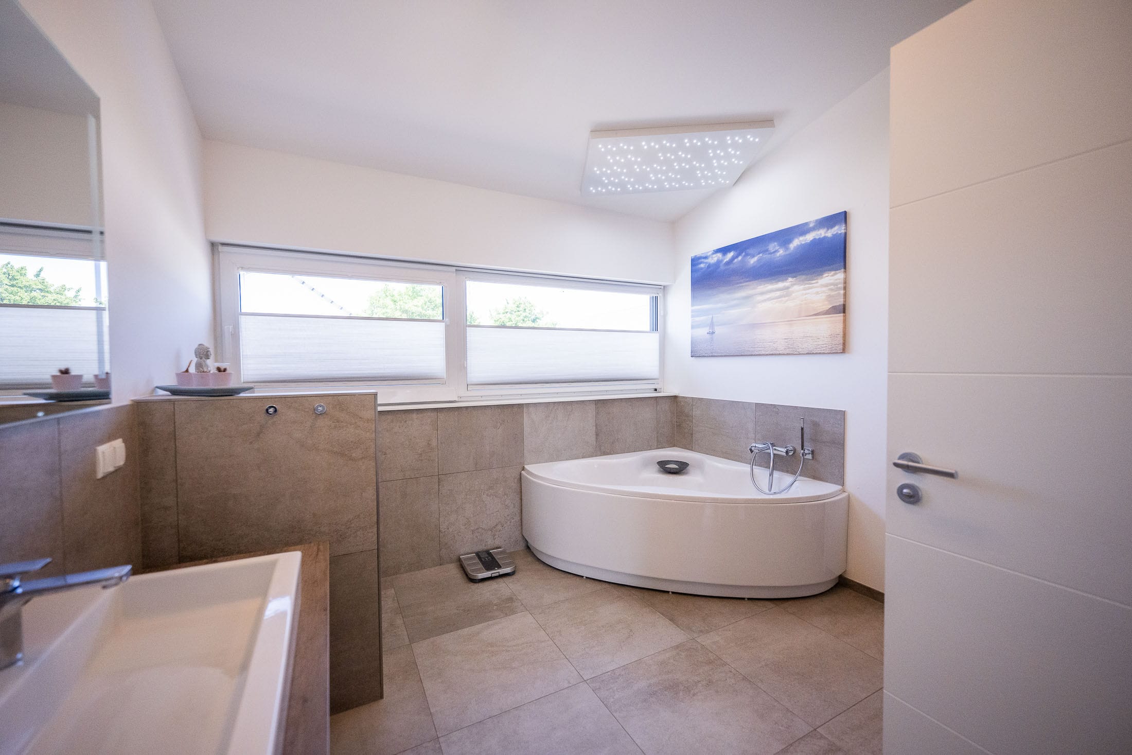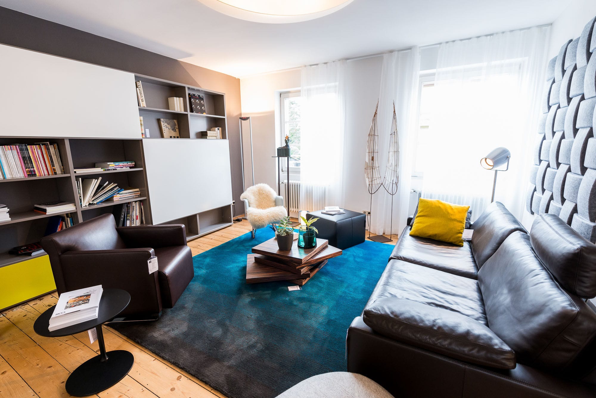 Helles Wohnzimmer mit Ledersofas und großen Fenstern