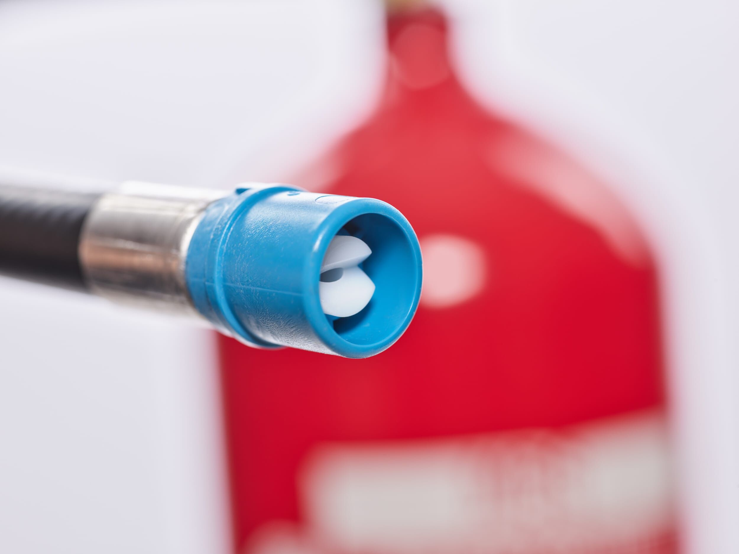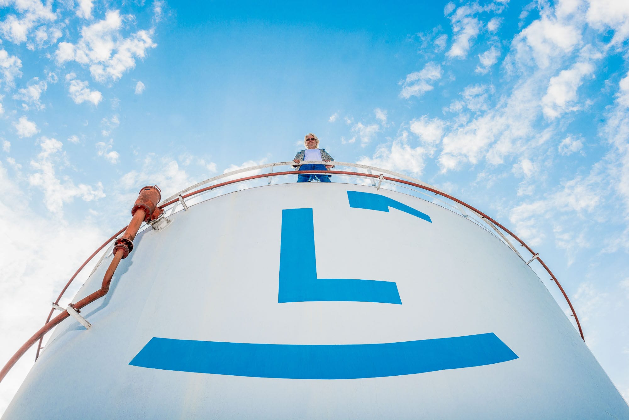 Person oben auf großem Tank mit blauem Himmel