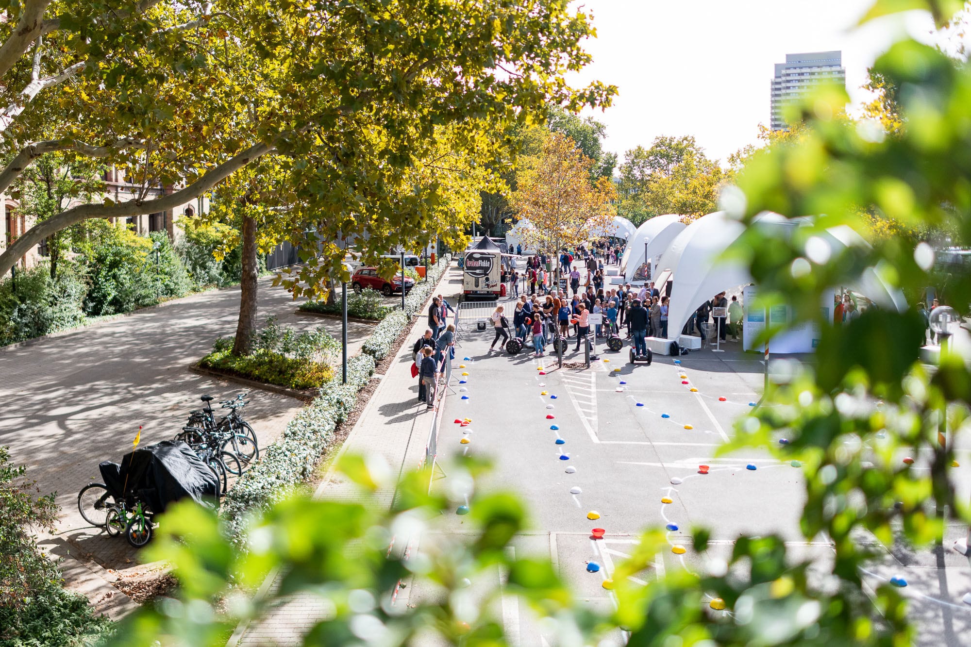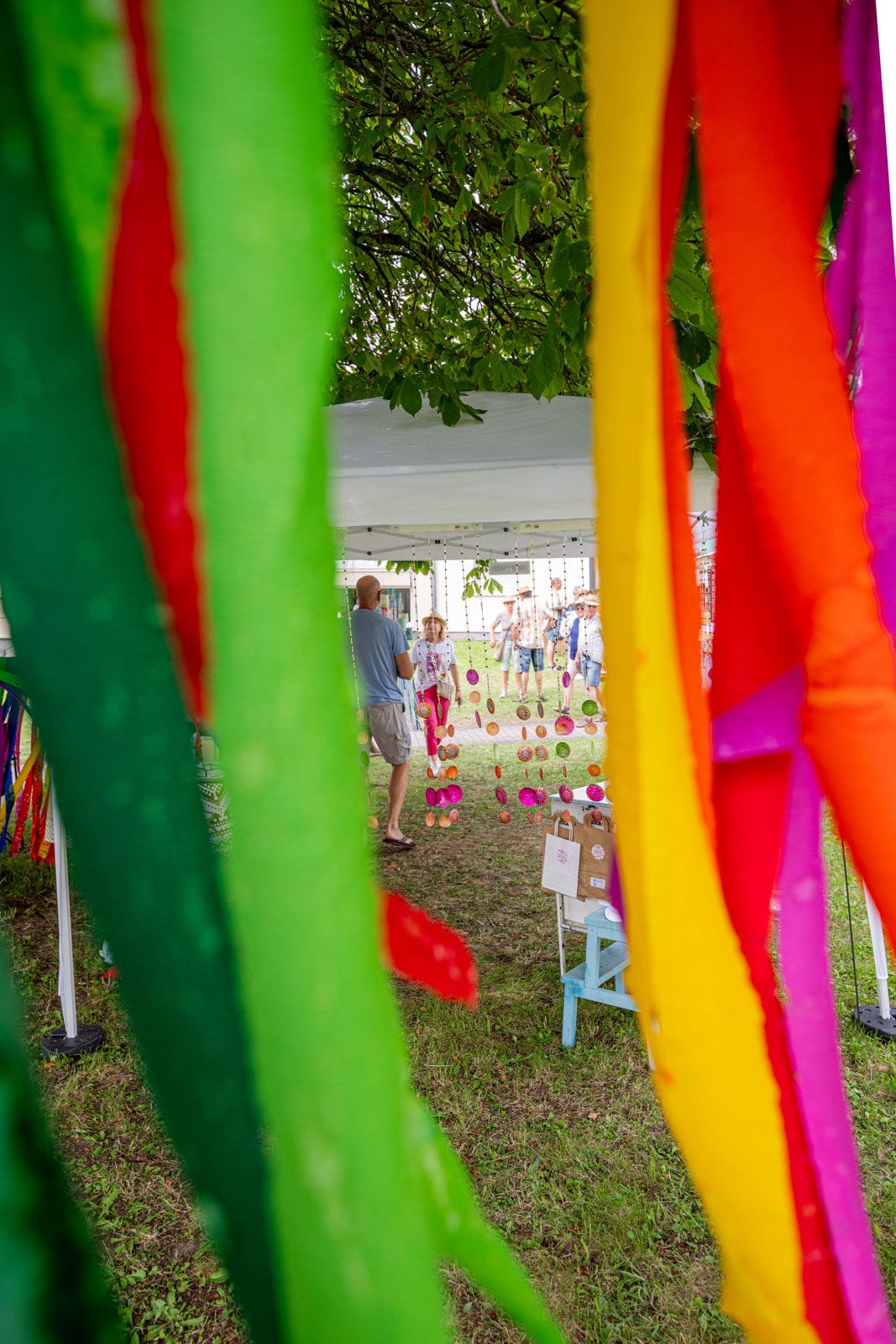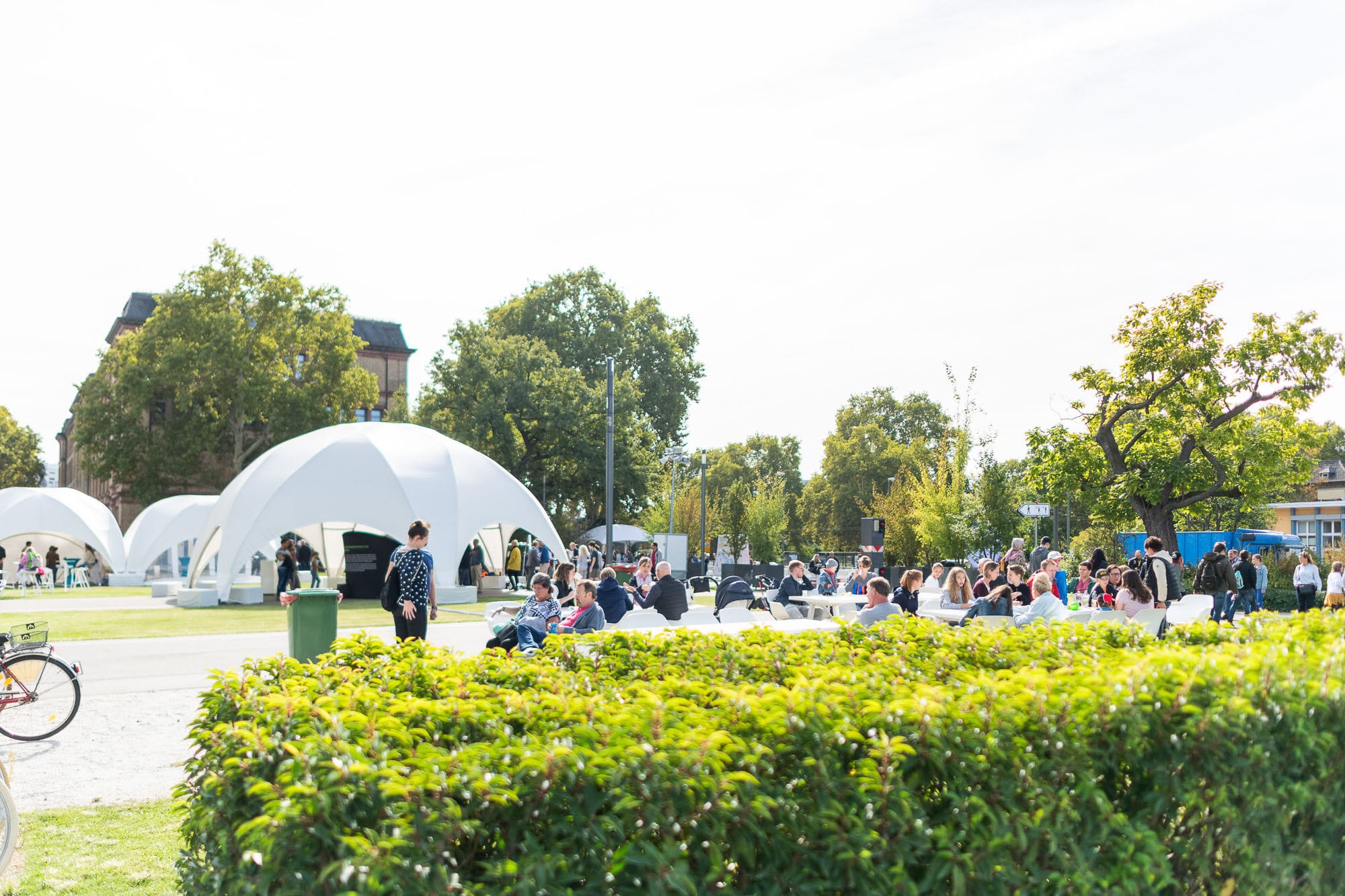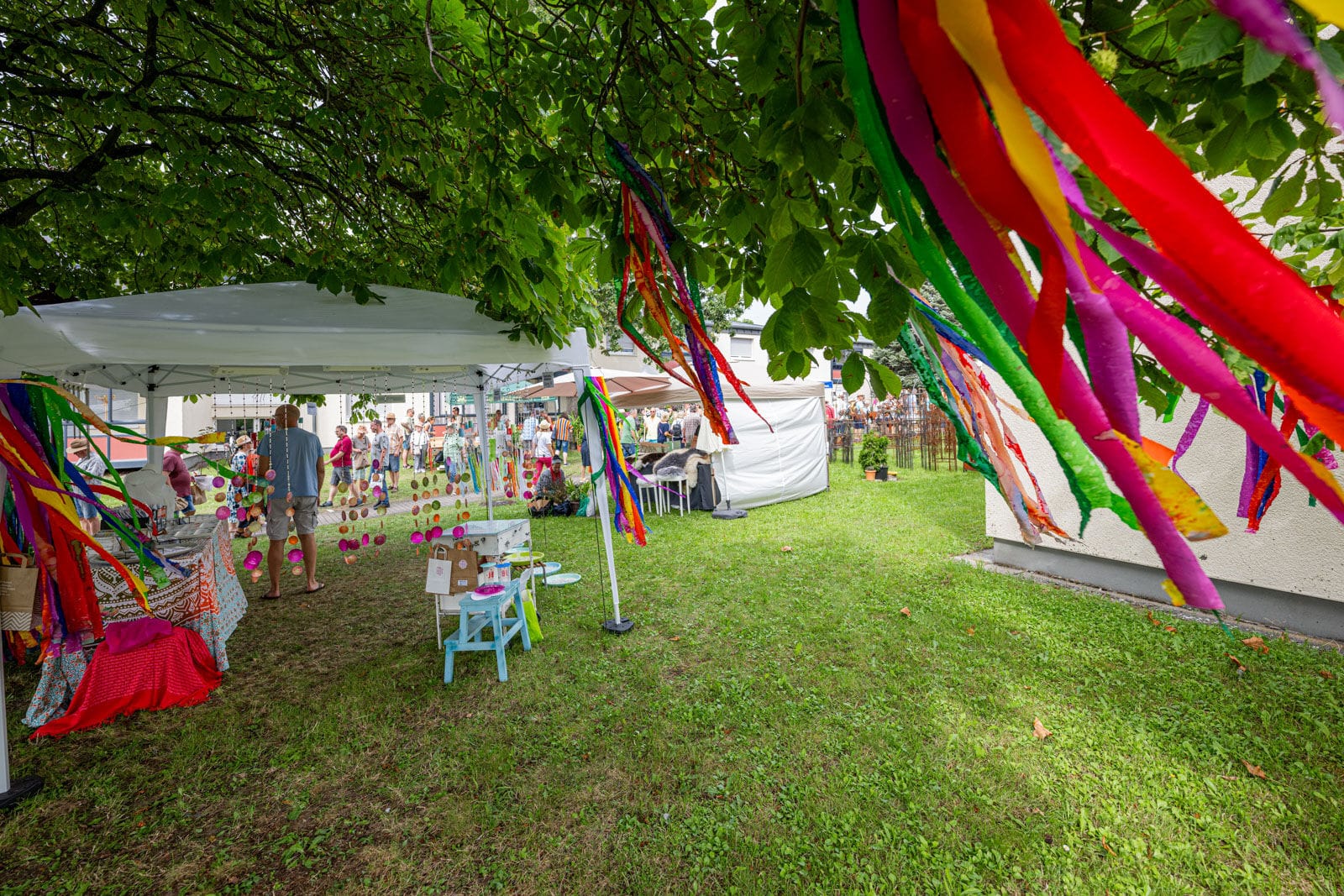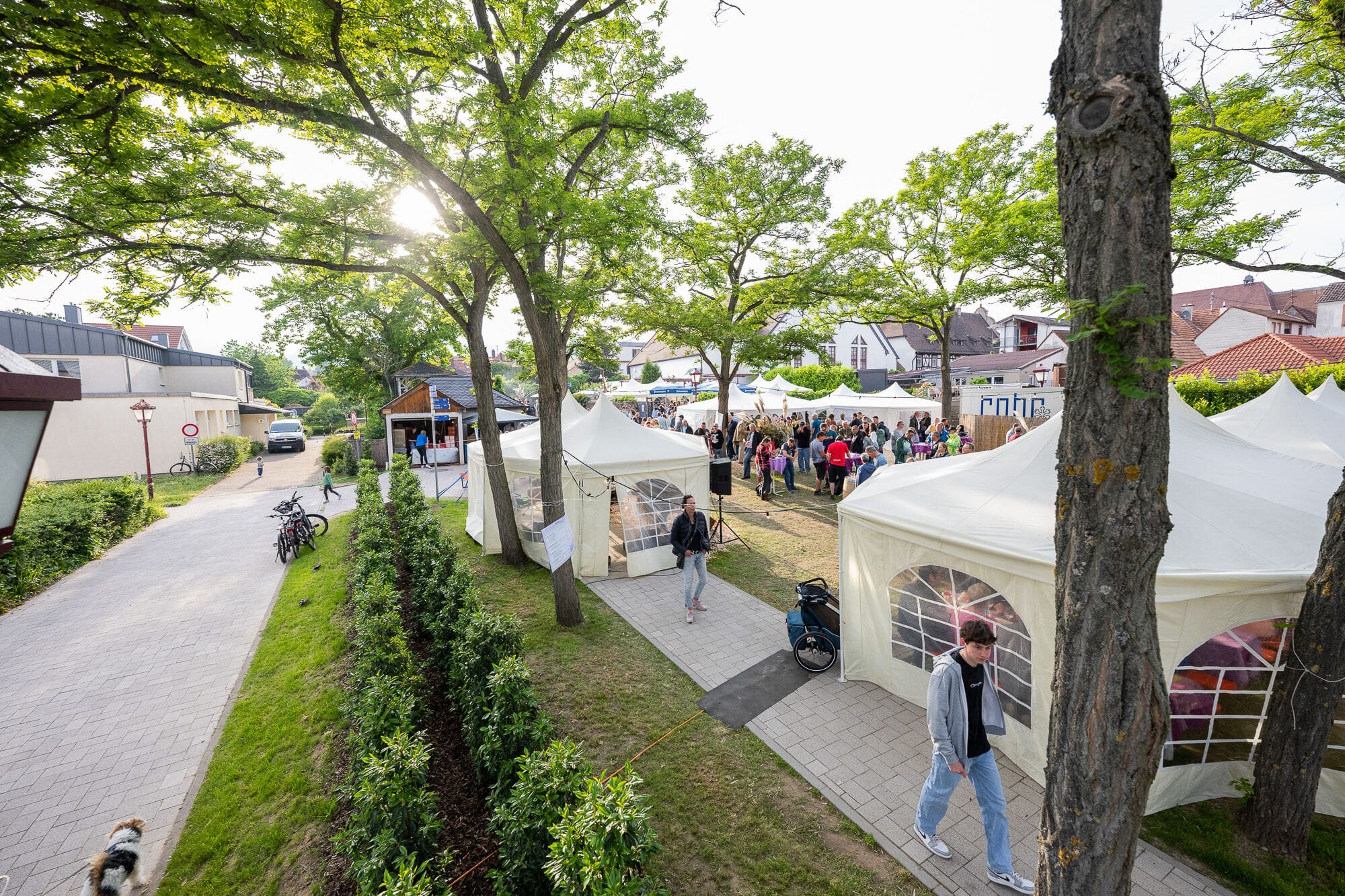 Outdoor-Event mit Menschen und Zelten, sonniger Tag.