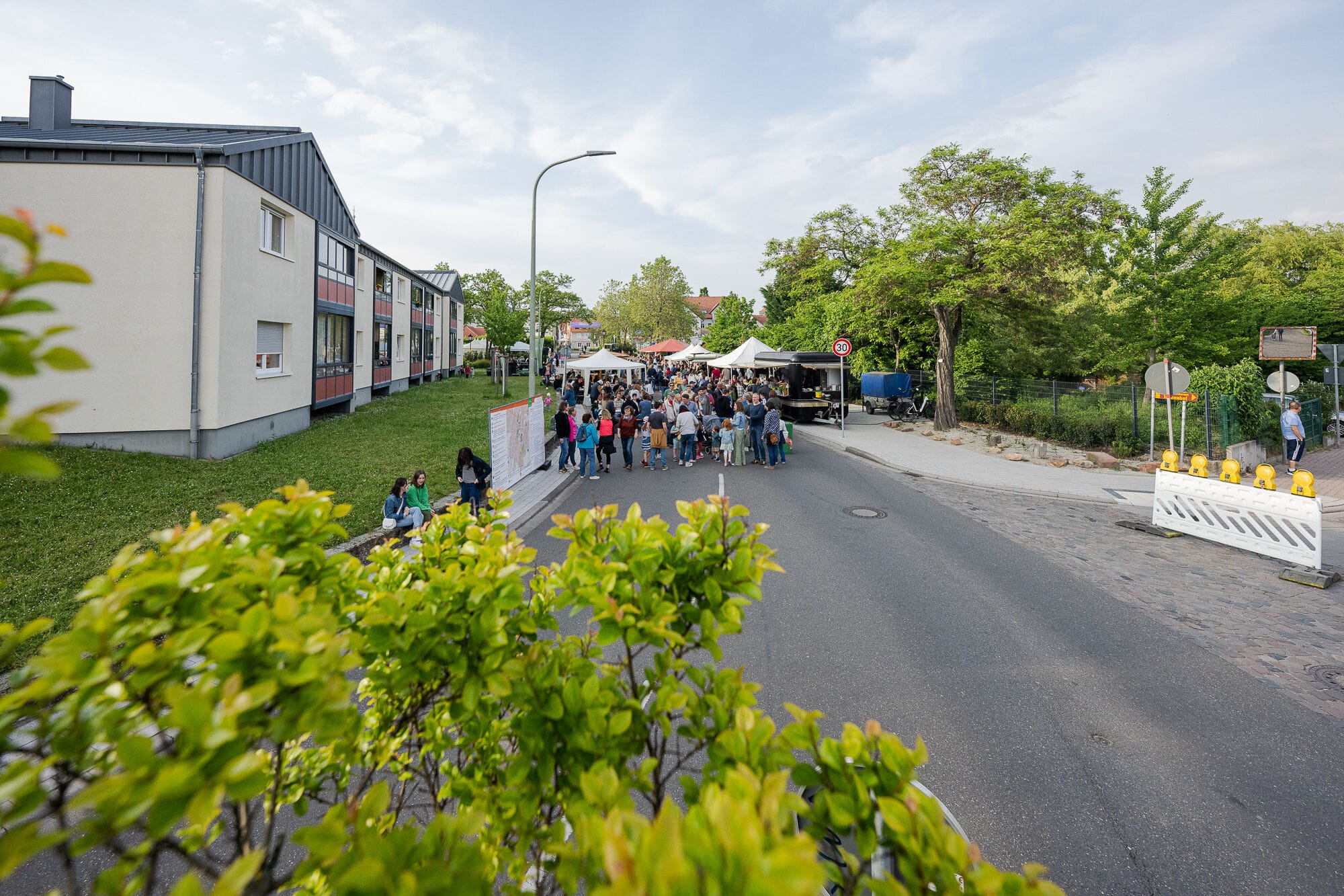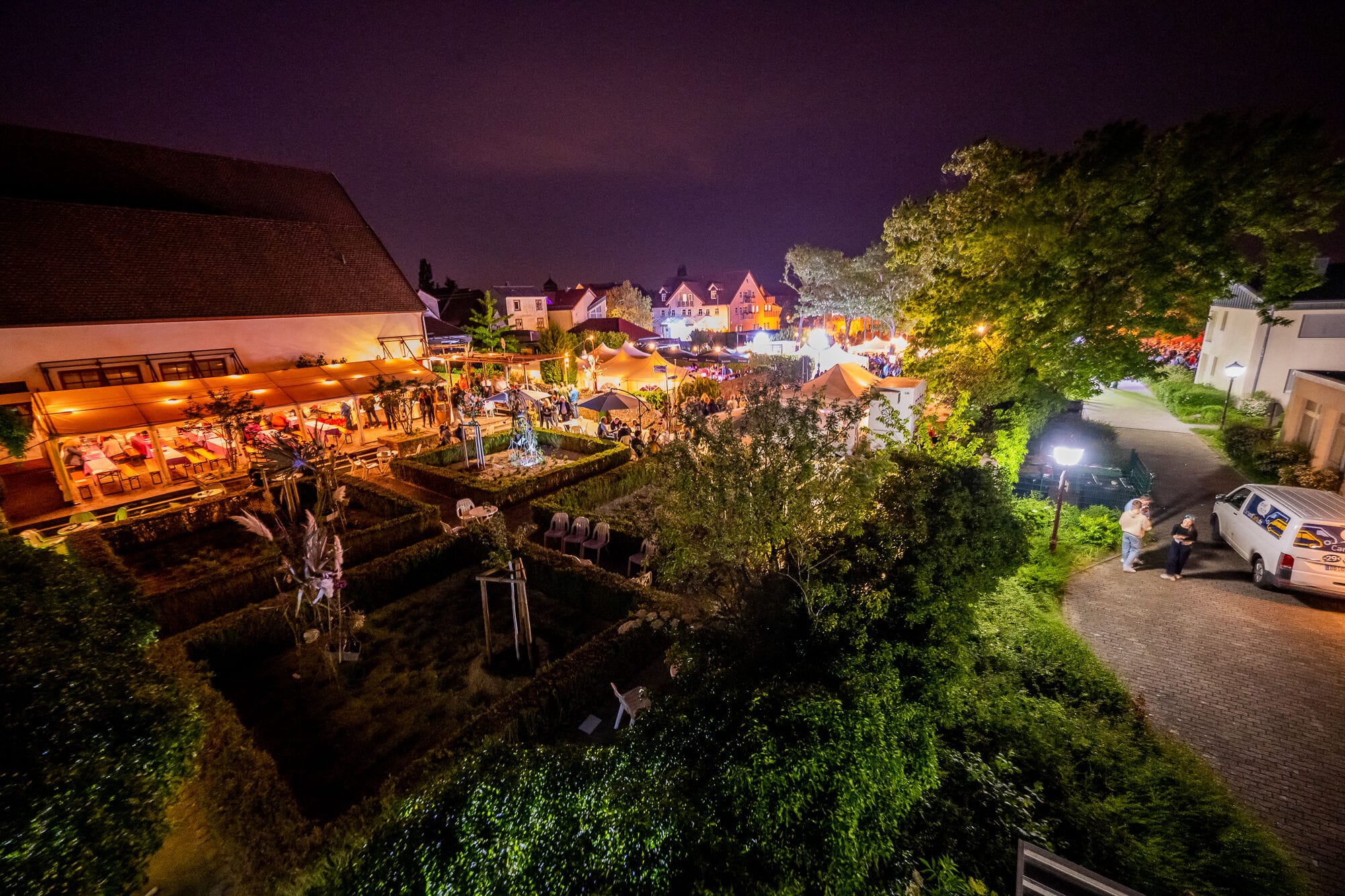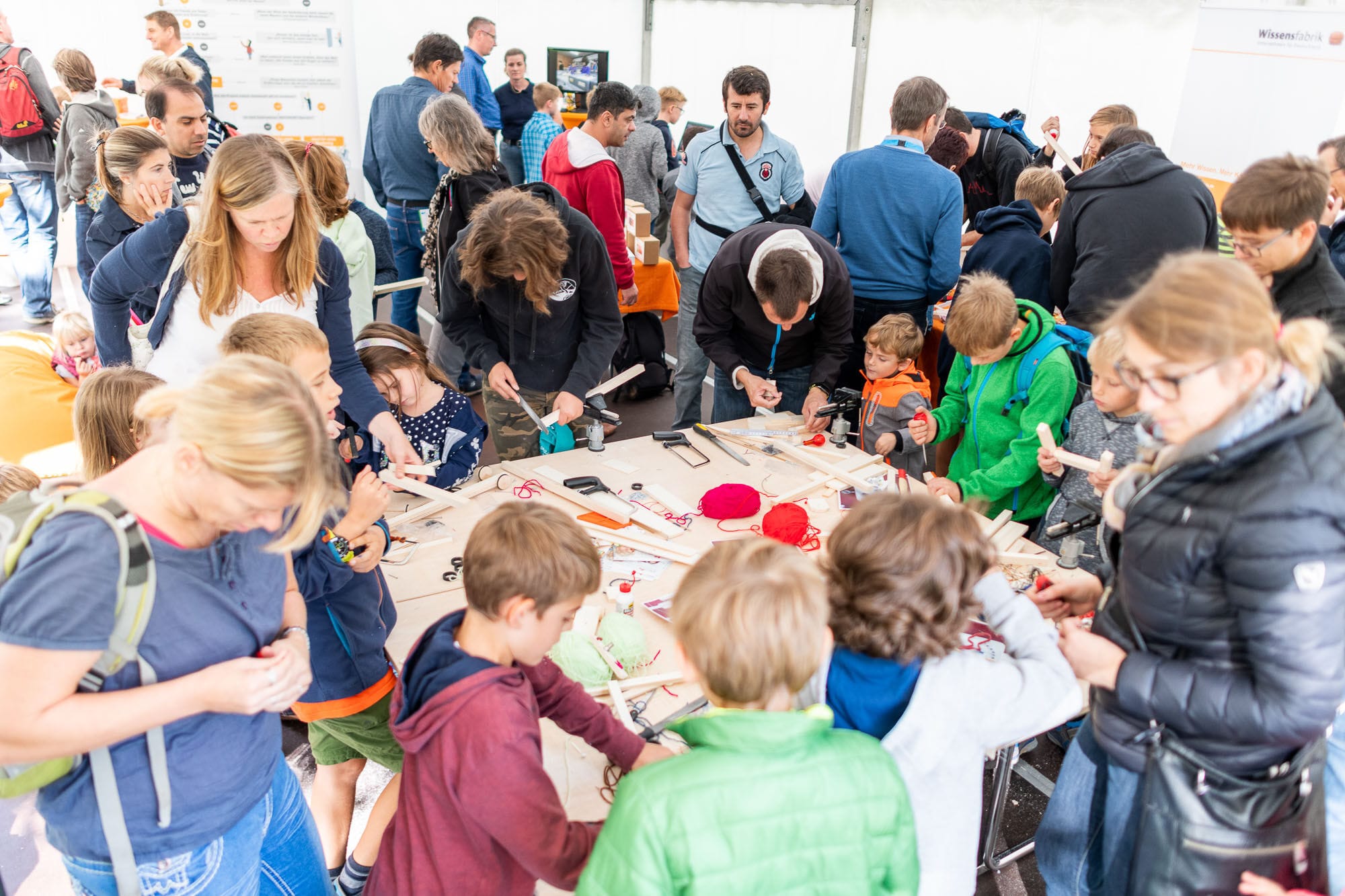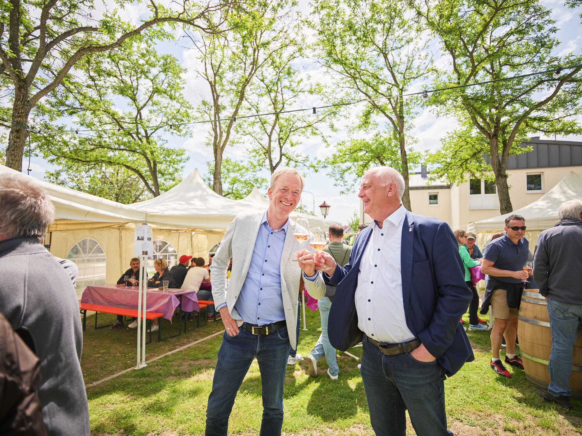Outdoor-Event mit Menschen und Zelten, sonniger Tag.
