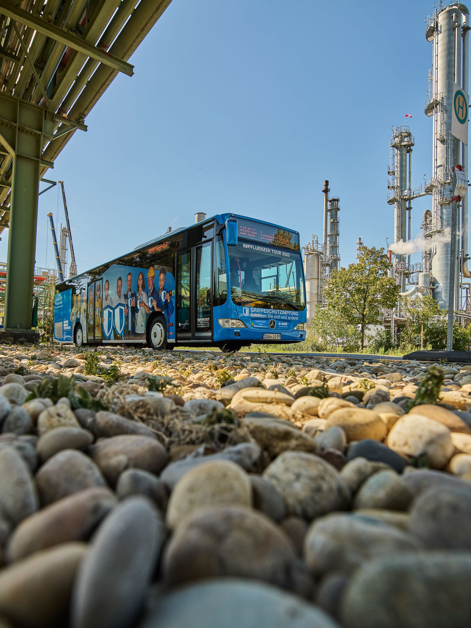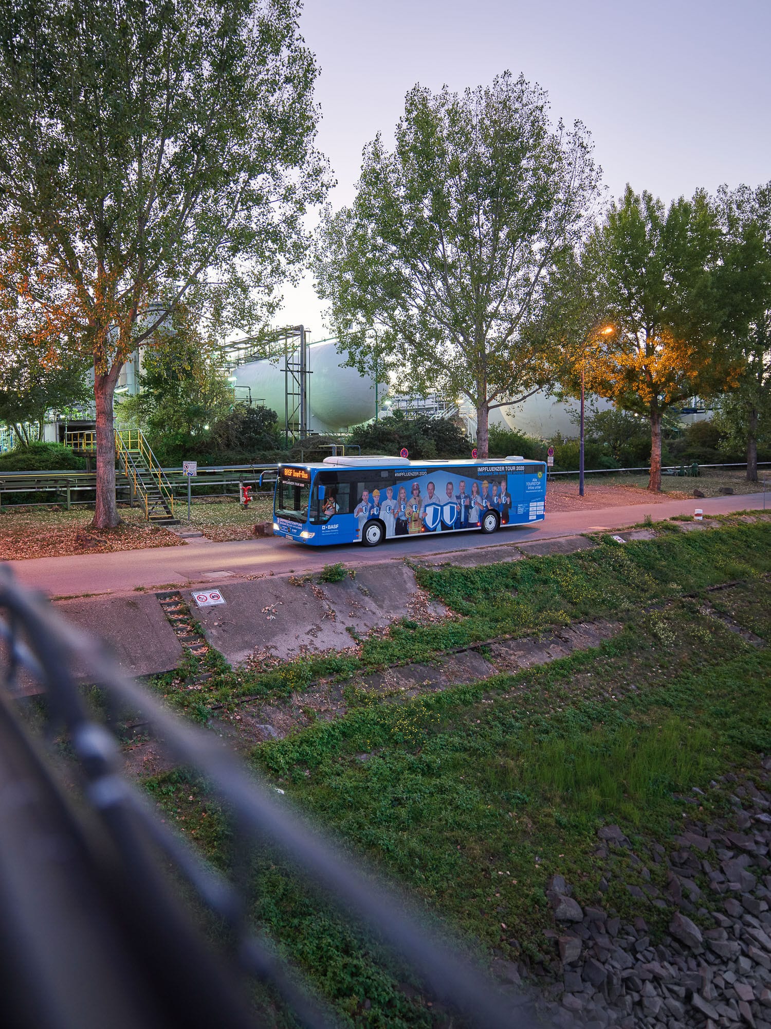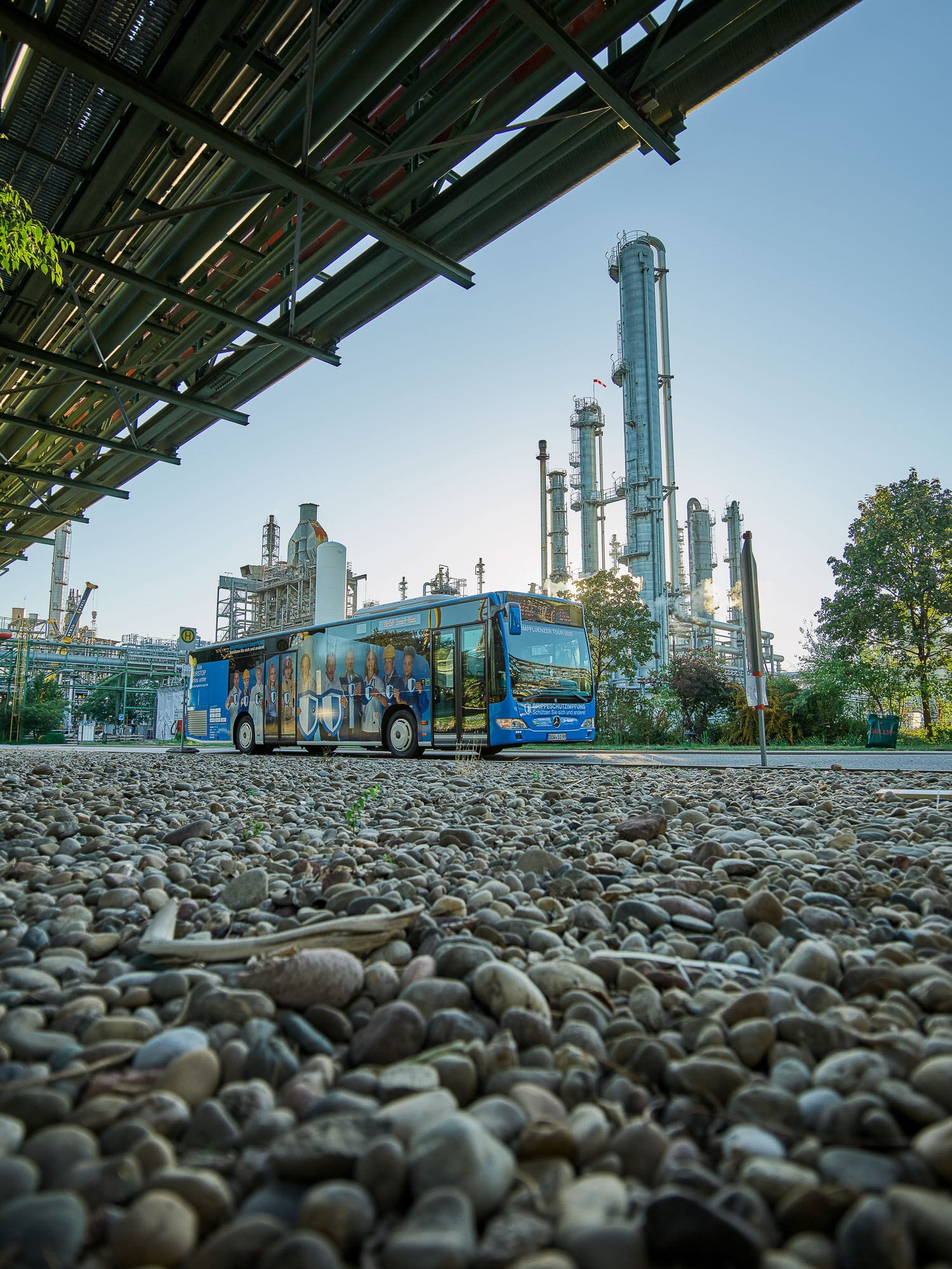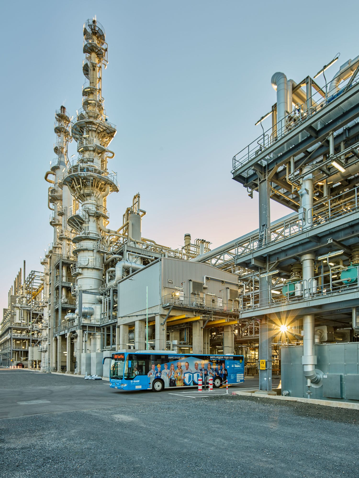 Industriegelände mit Werksbus im Vordergrund