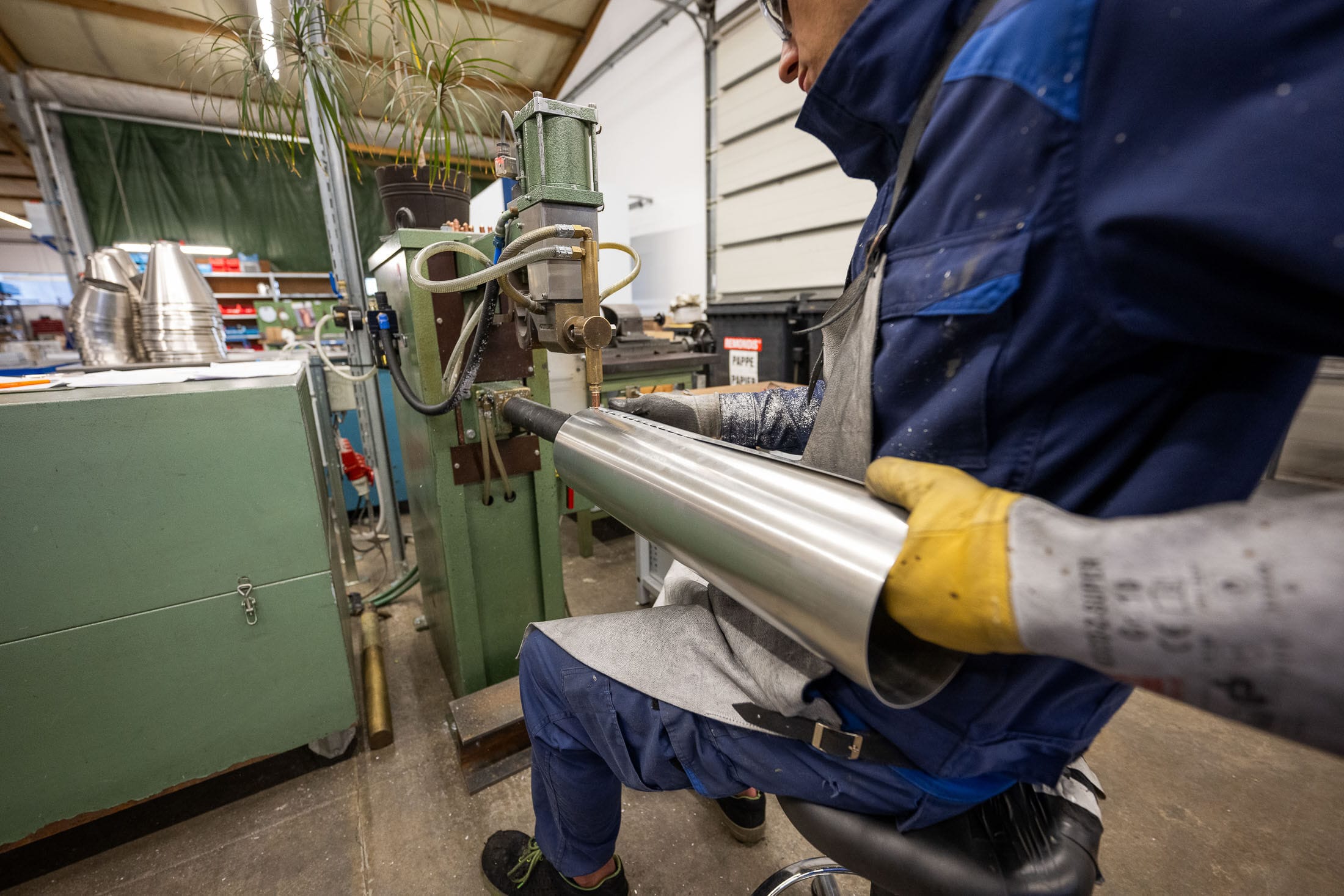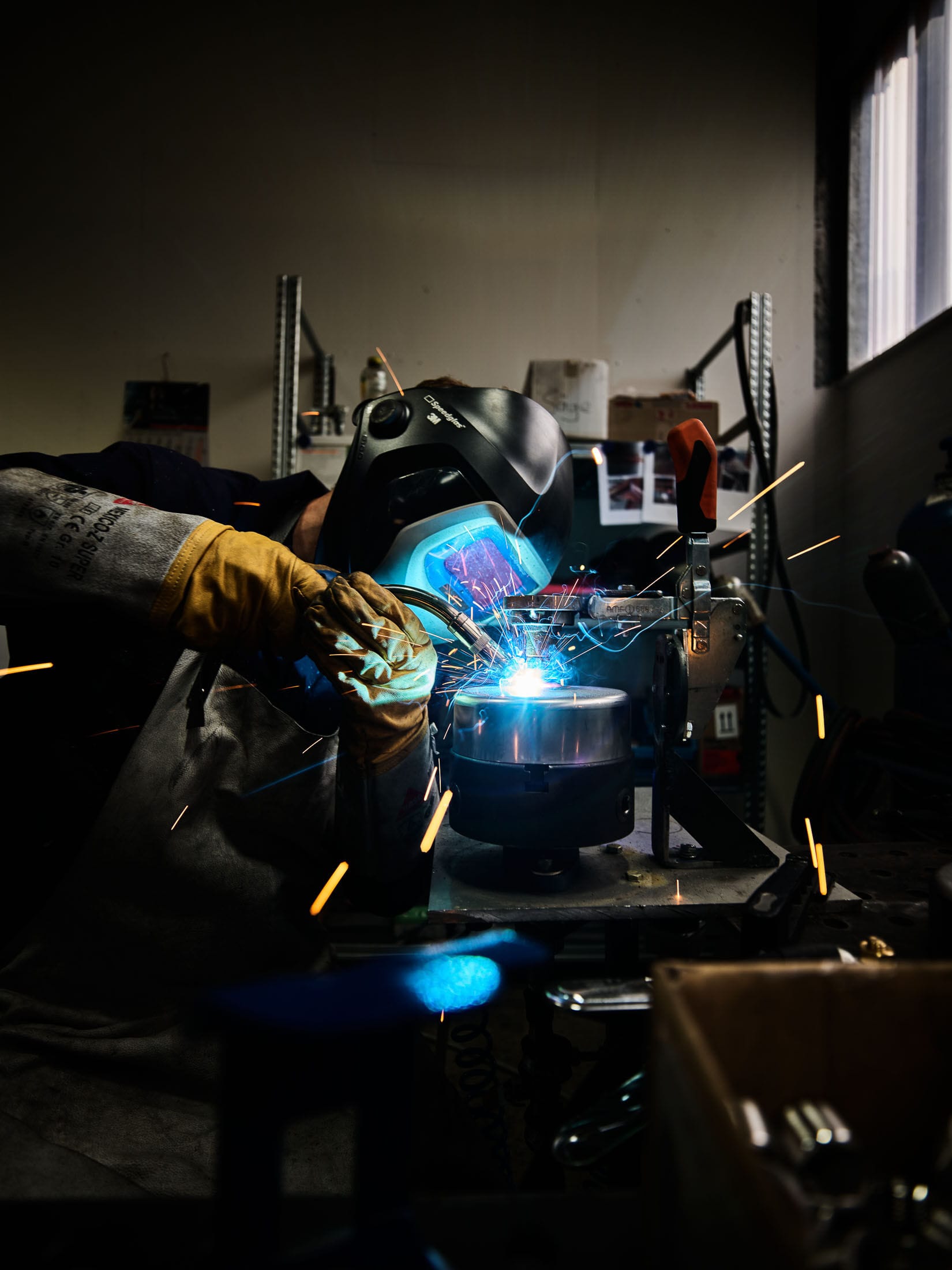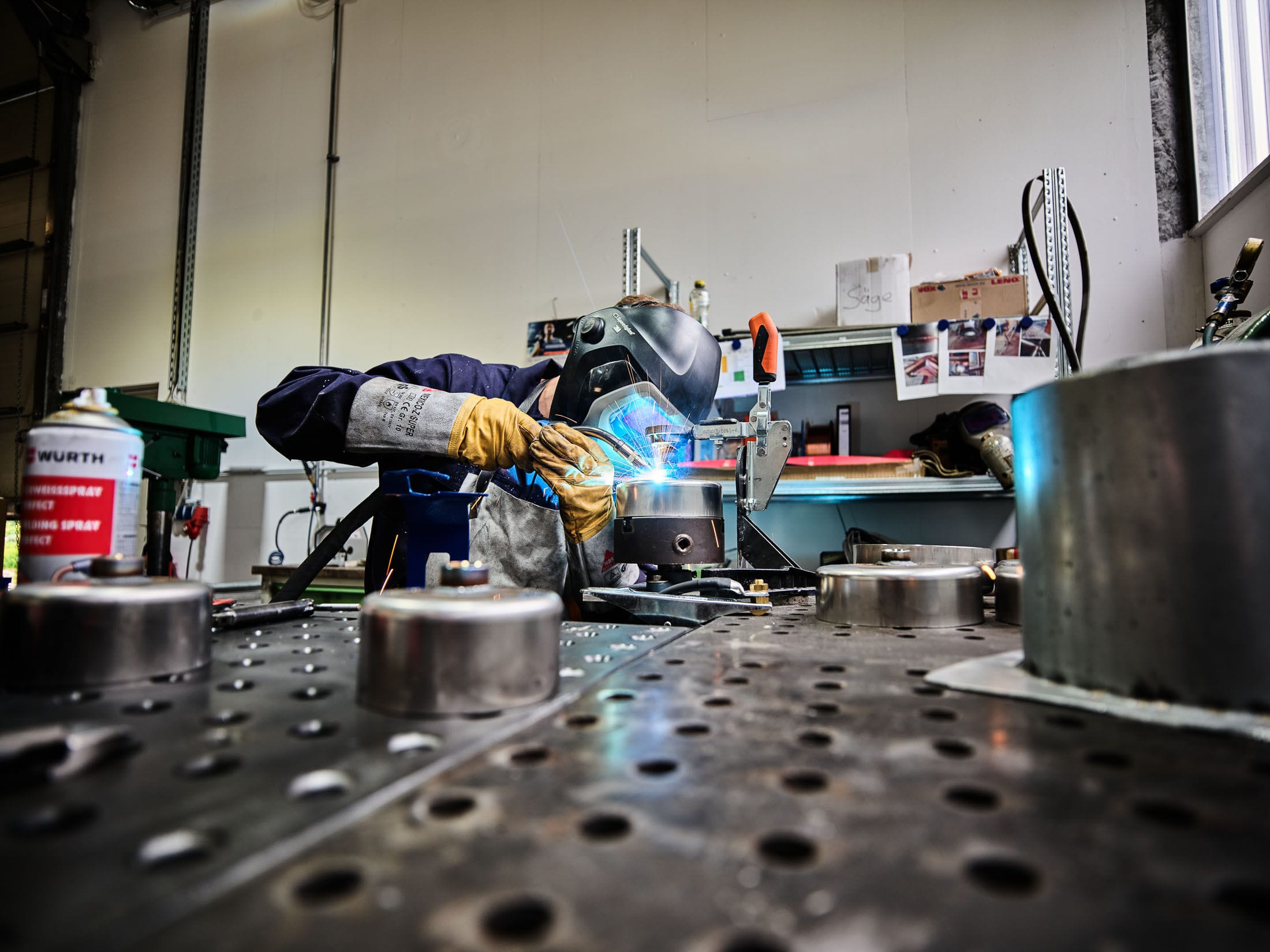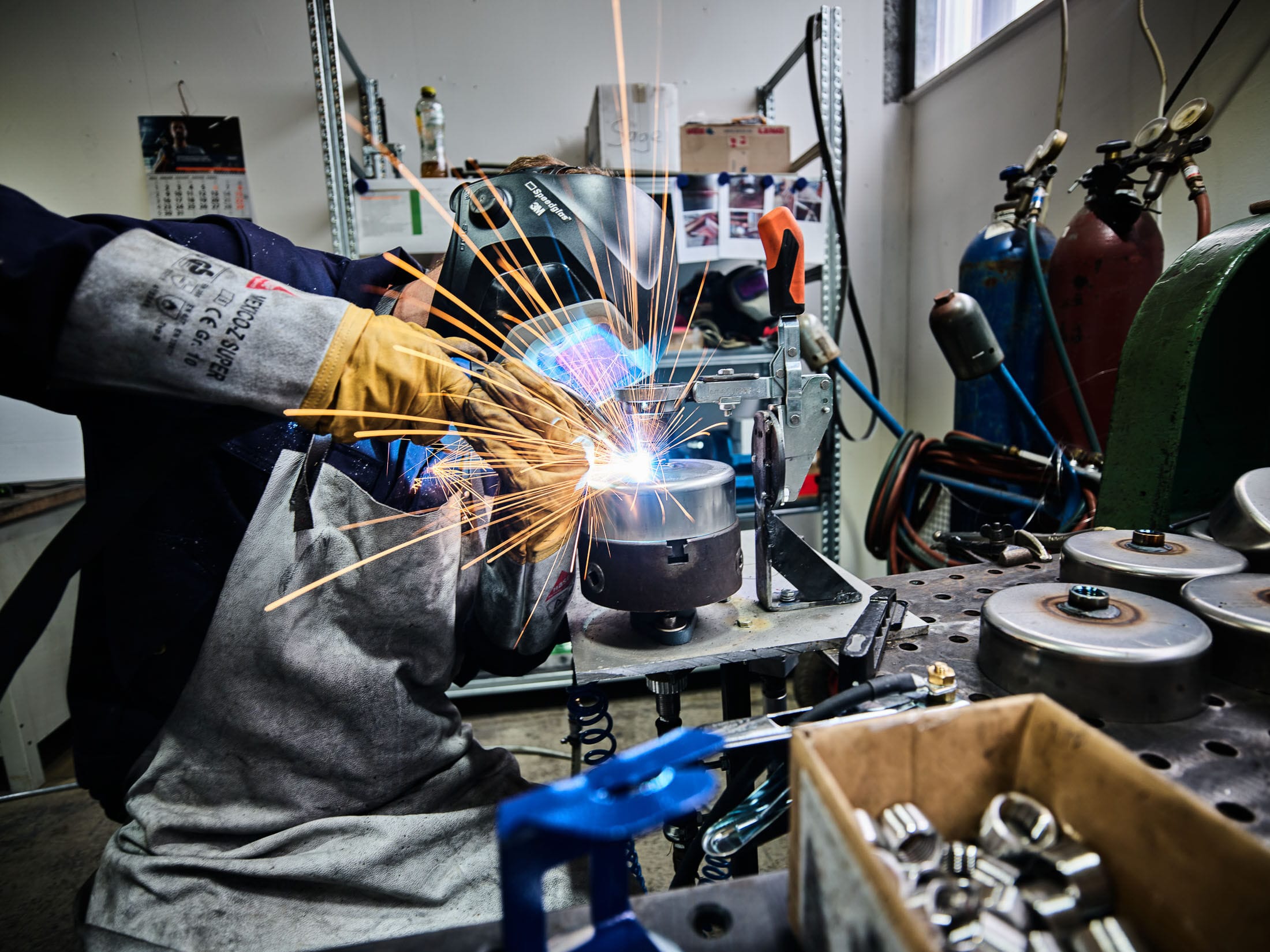 Handwerkliche Schweißarbeit mit Funkenflug in einer Werkstatt mit Maschinen und Werkzeugen