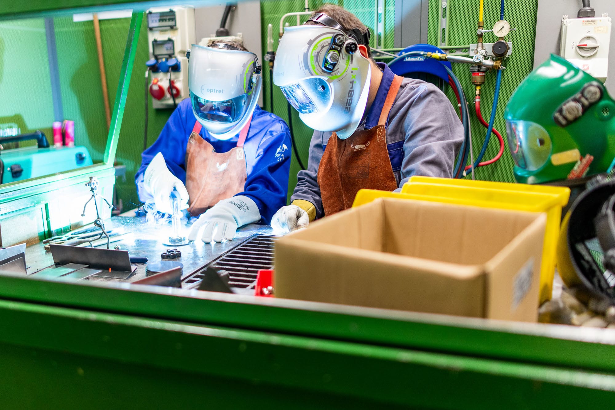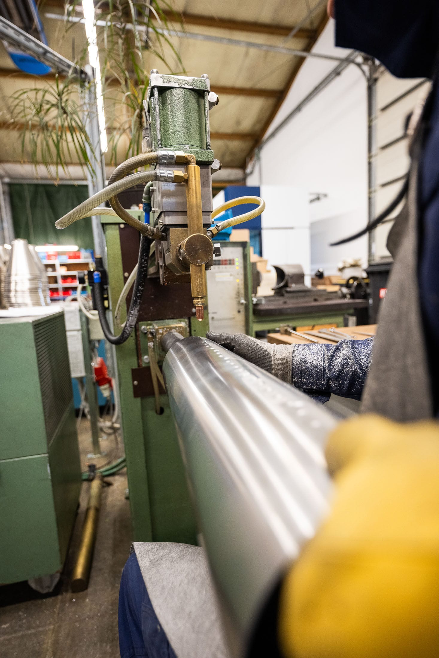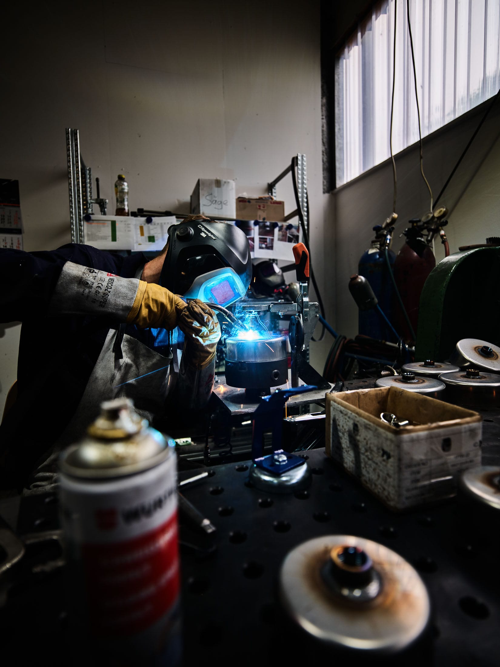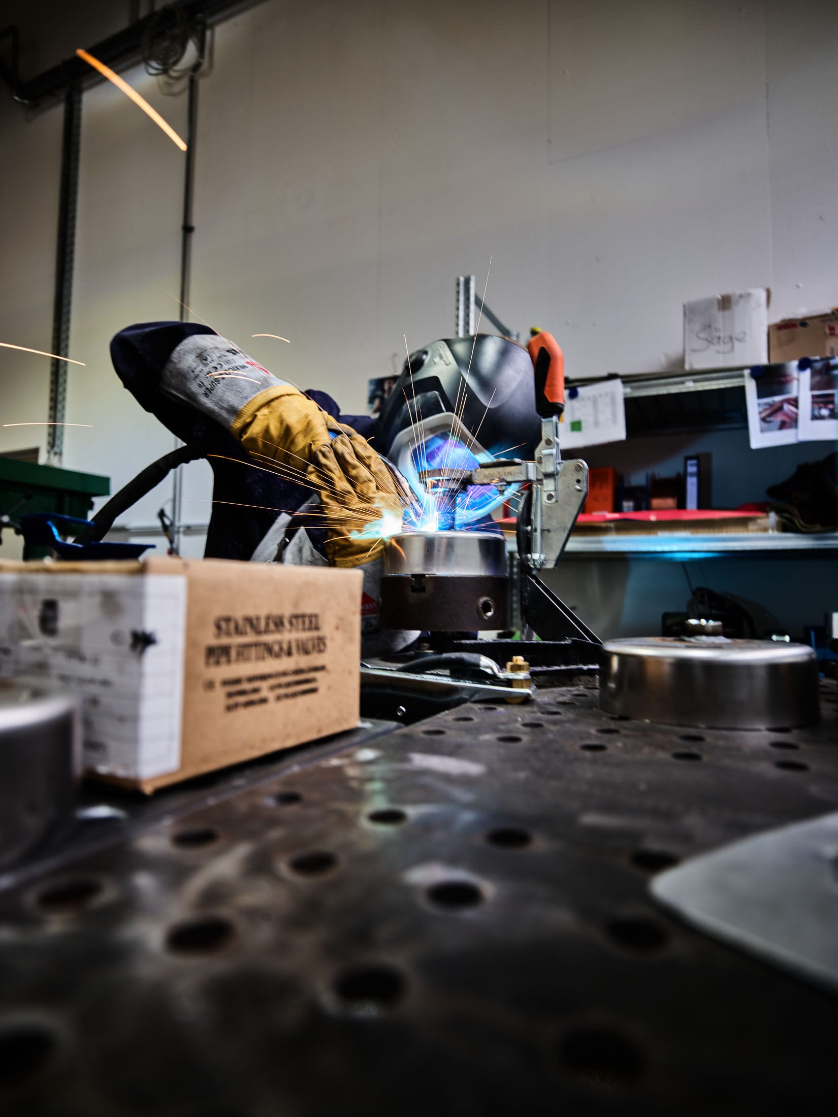 Handwerkliche Schweißarbeit mit Funkenflug in einer Werkstatt mit Maschinen und Werkzeugen