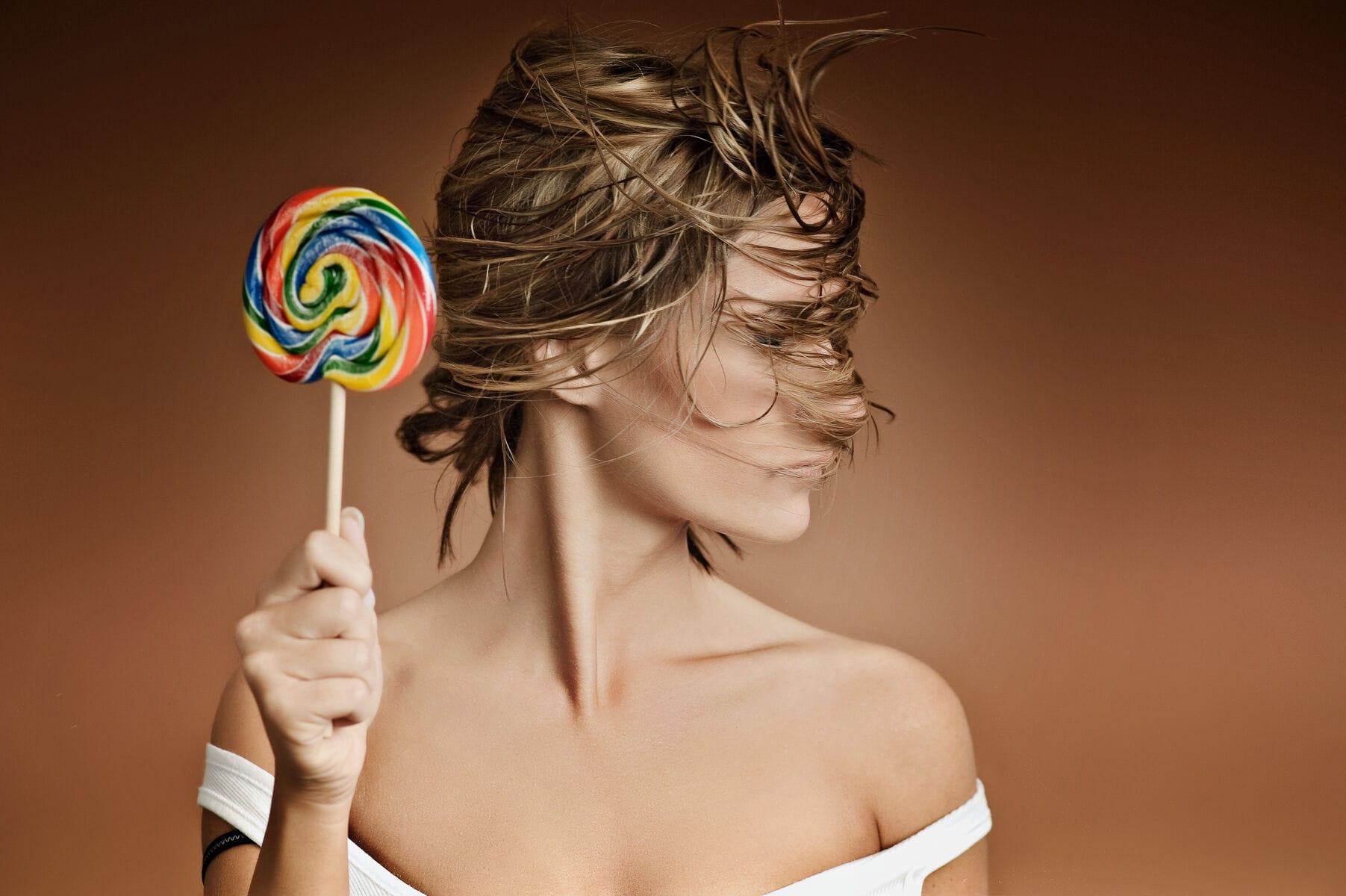 Frau mit Lutscher und verwehten Haaren.