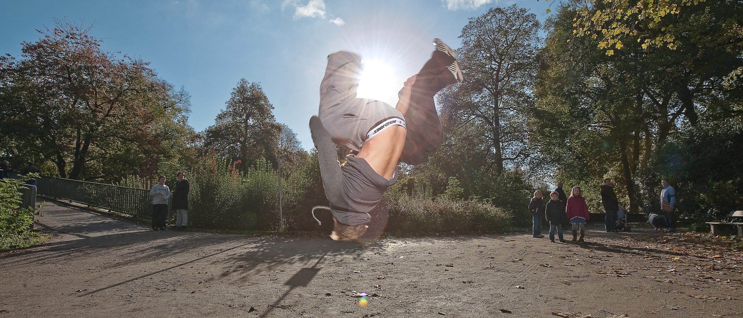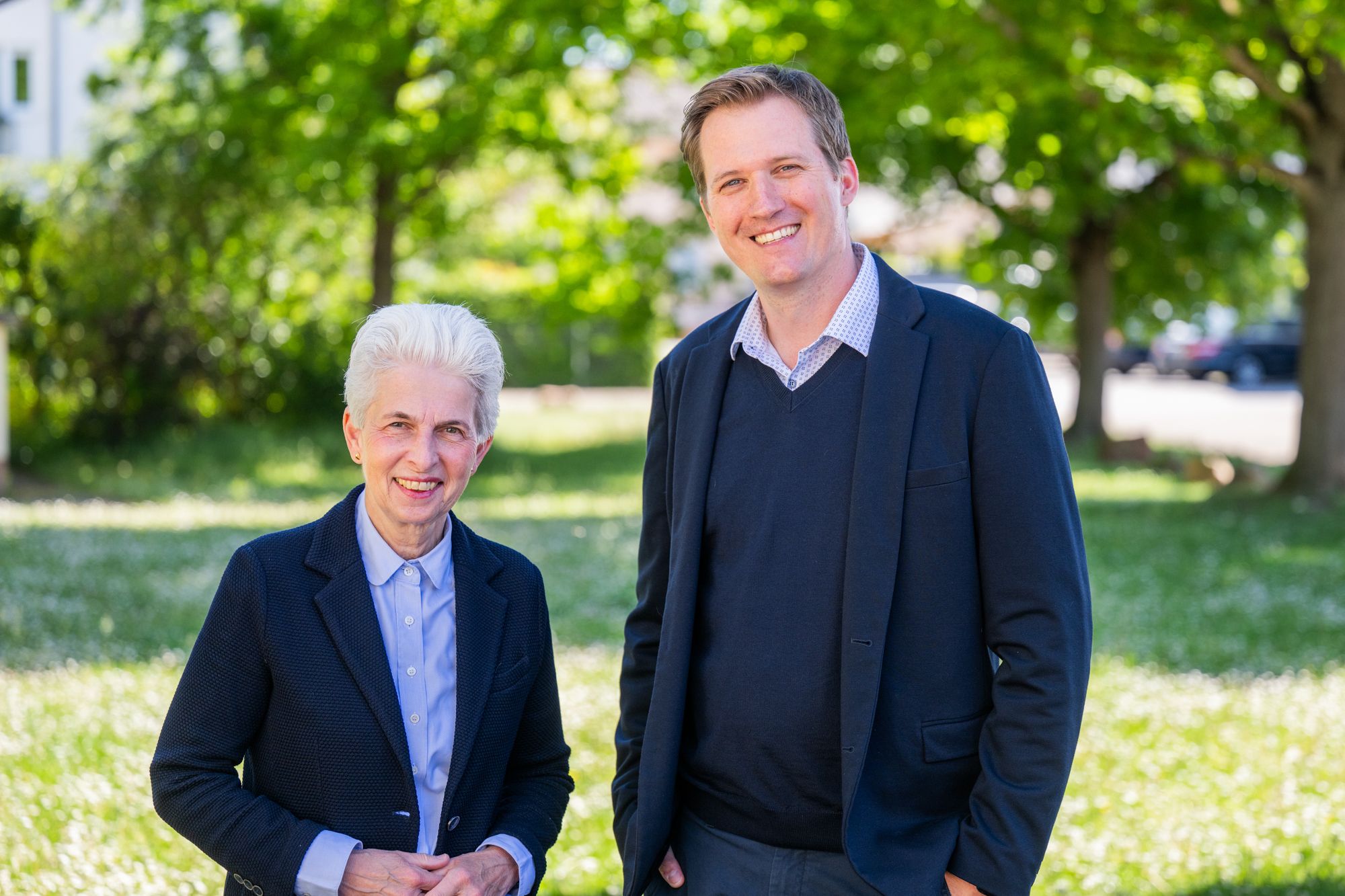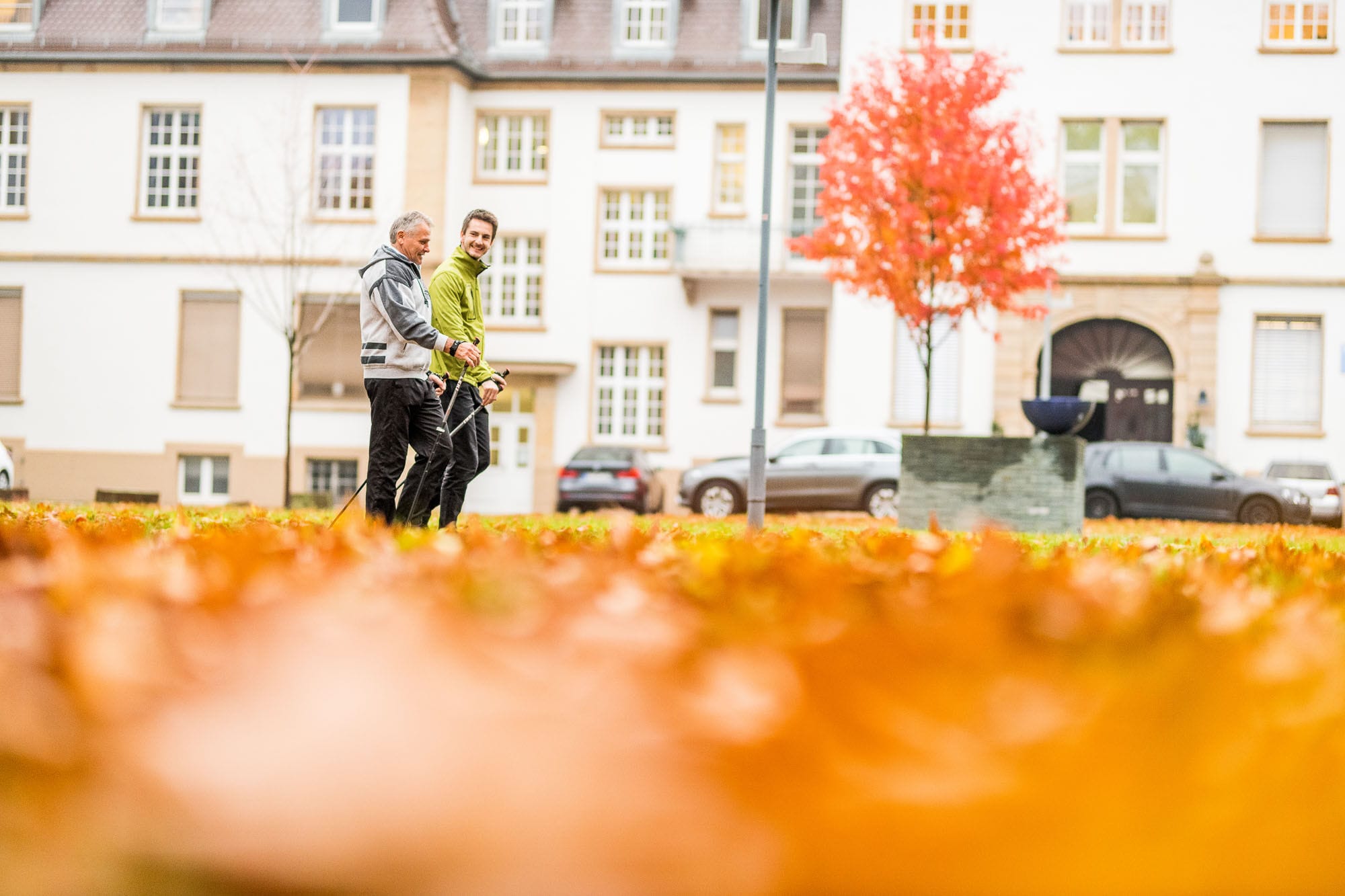 Zwei Männer spazieren durch herbstliche Stadtlandschaft.