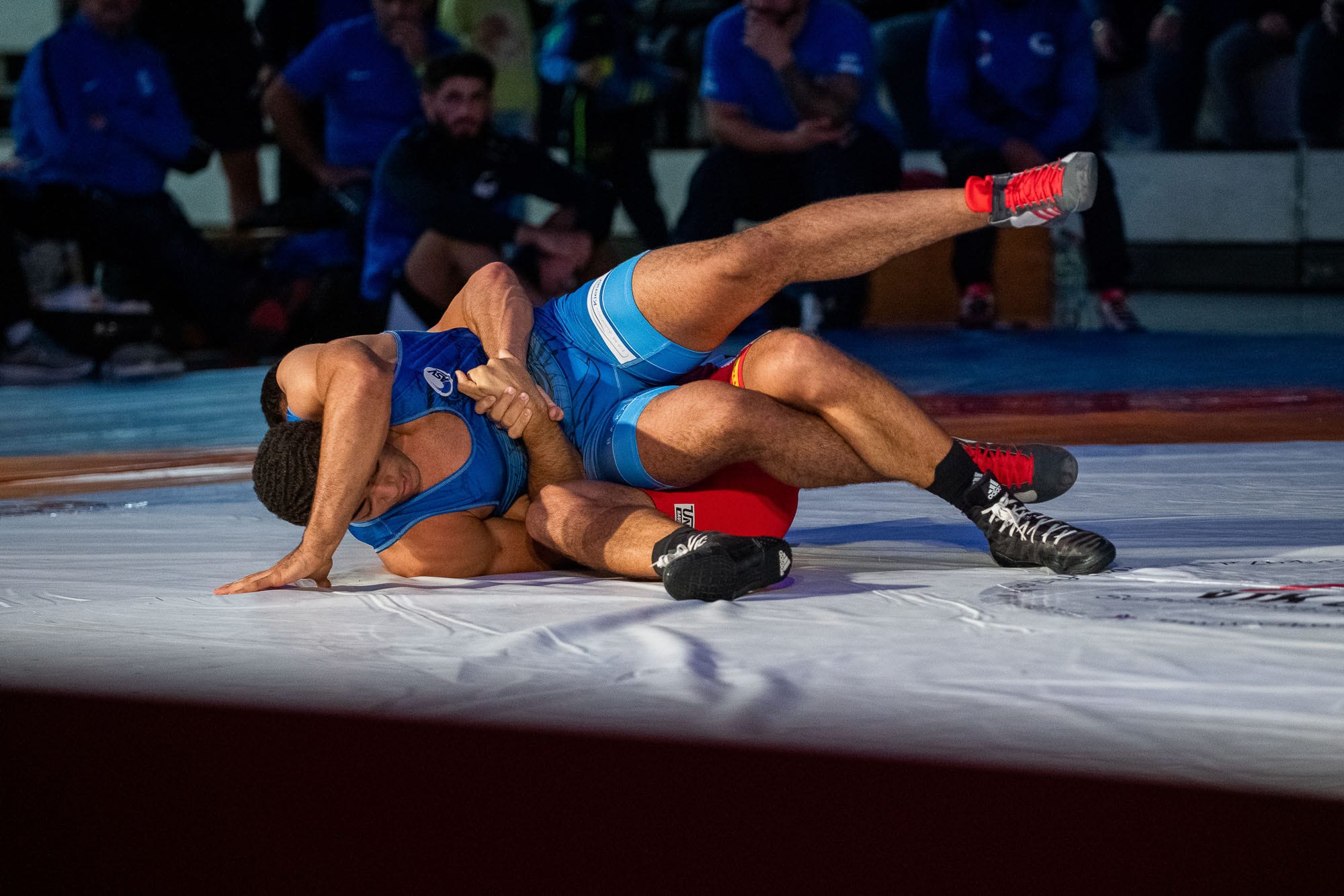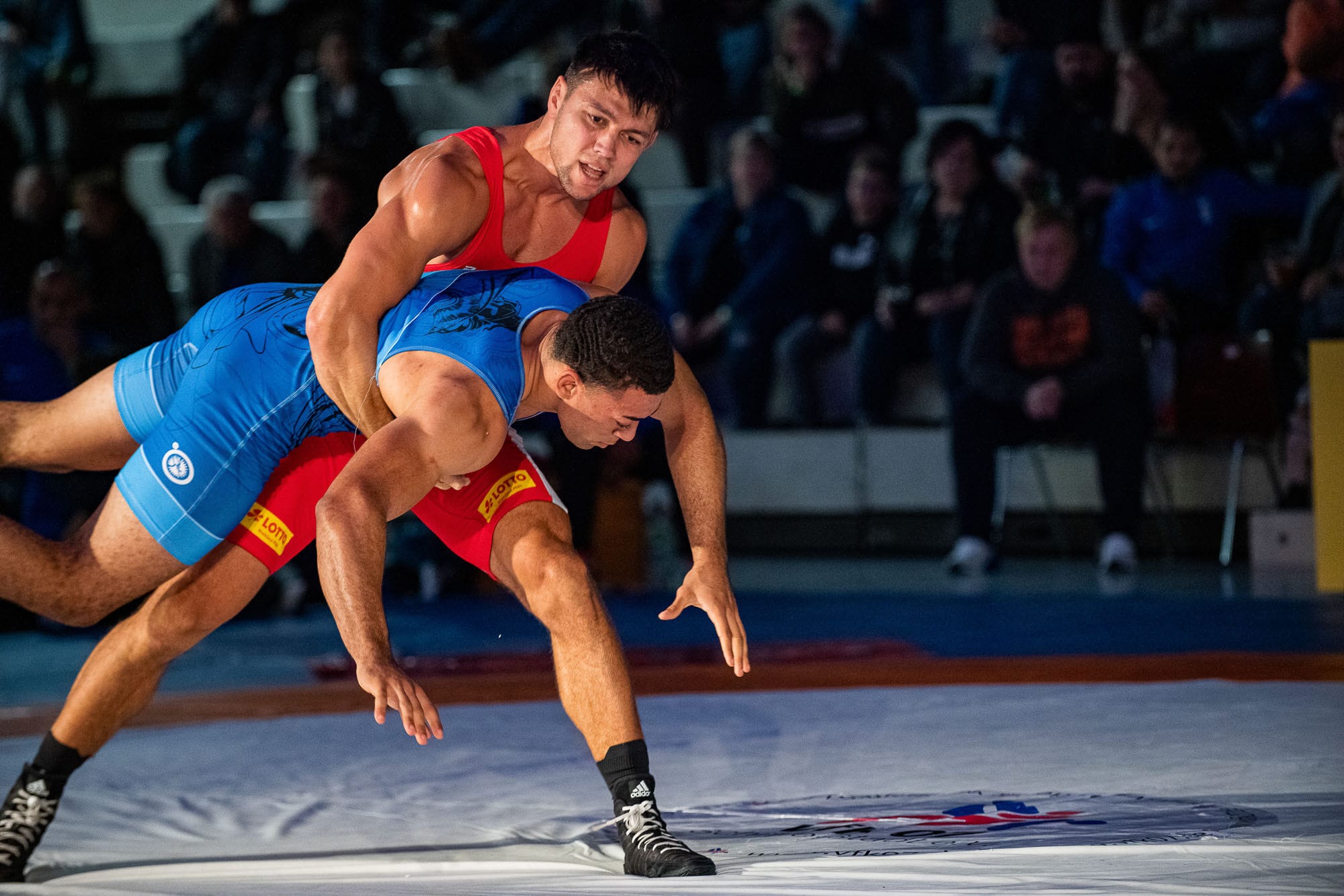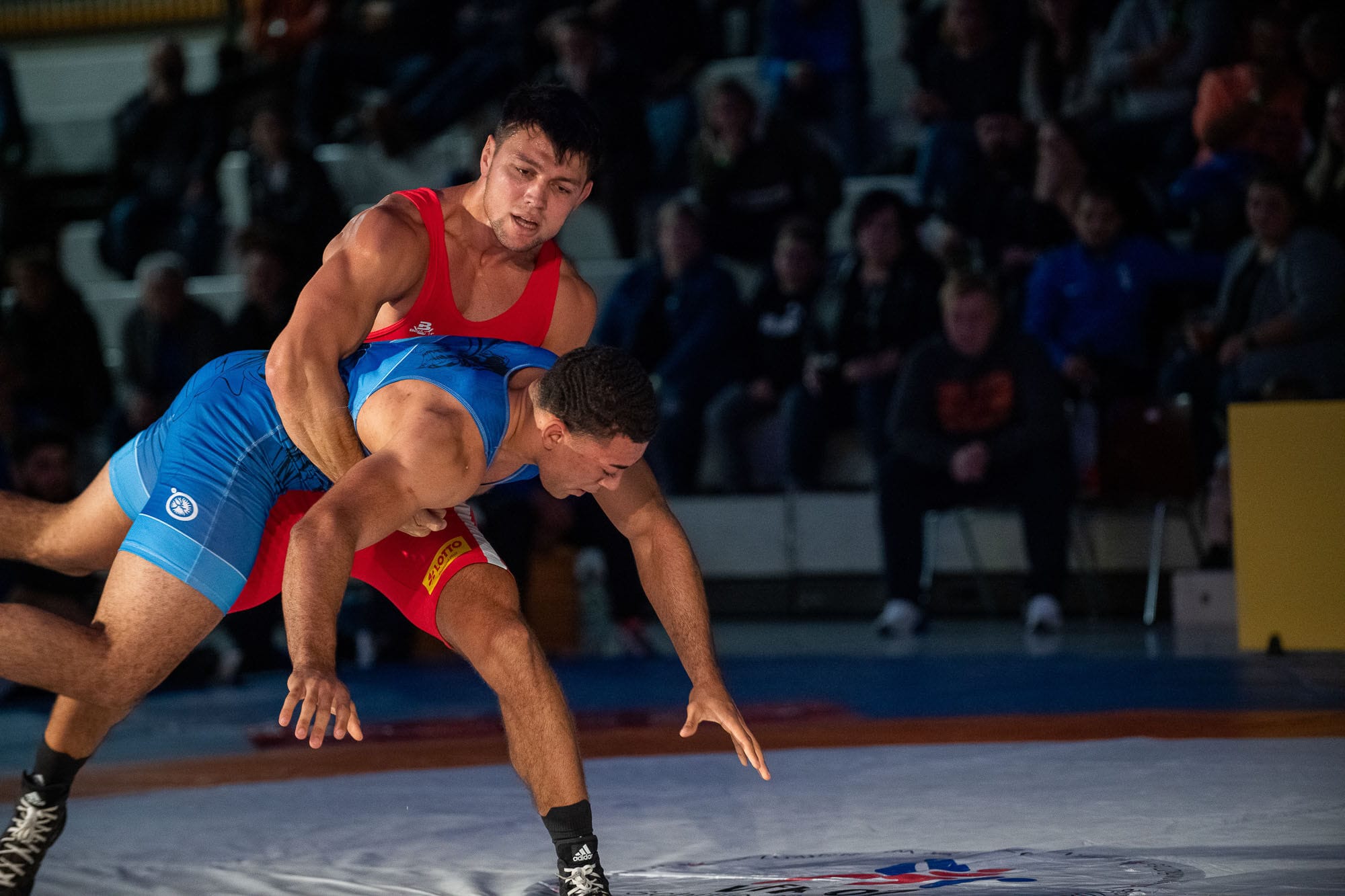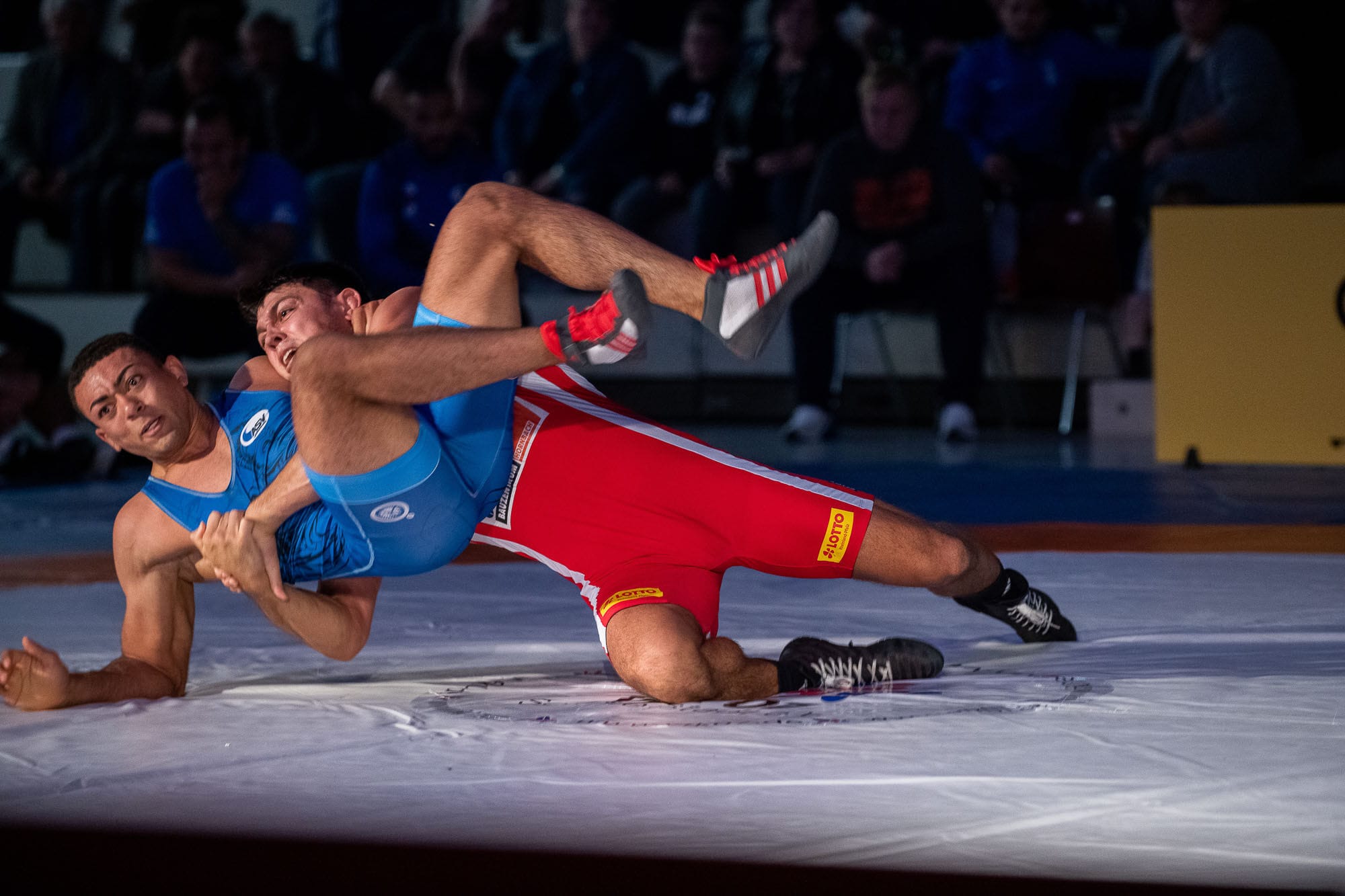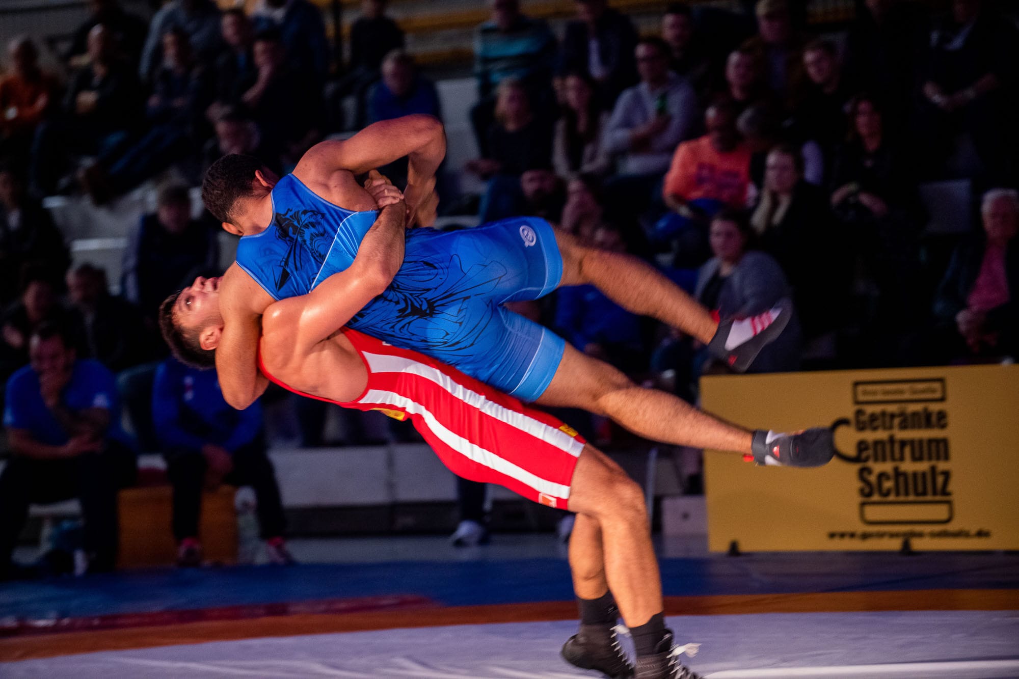 Zwei Ringer im Wettkampf auf der Matte.