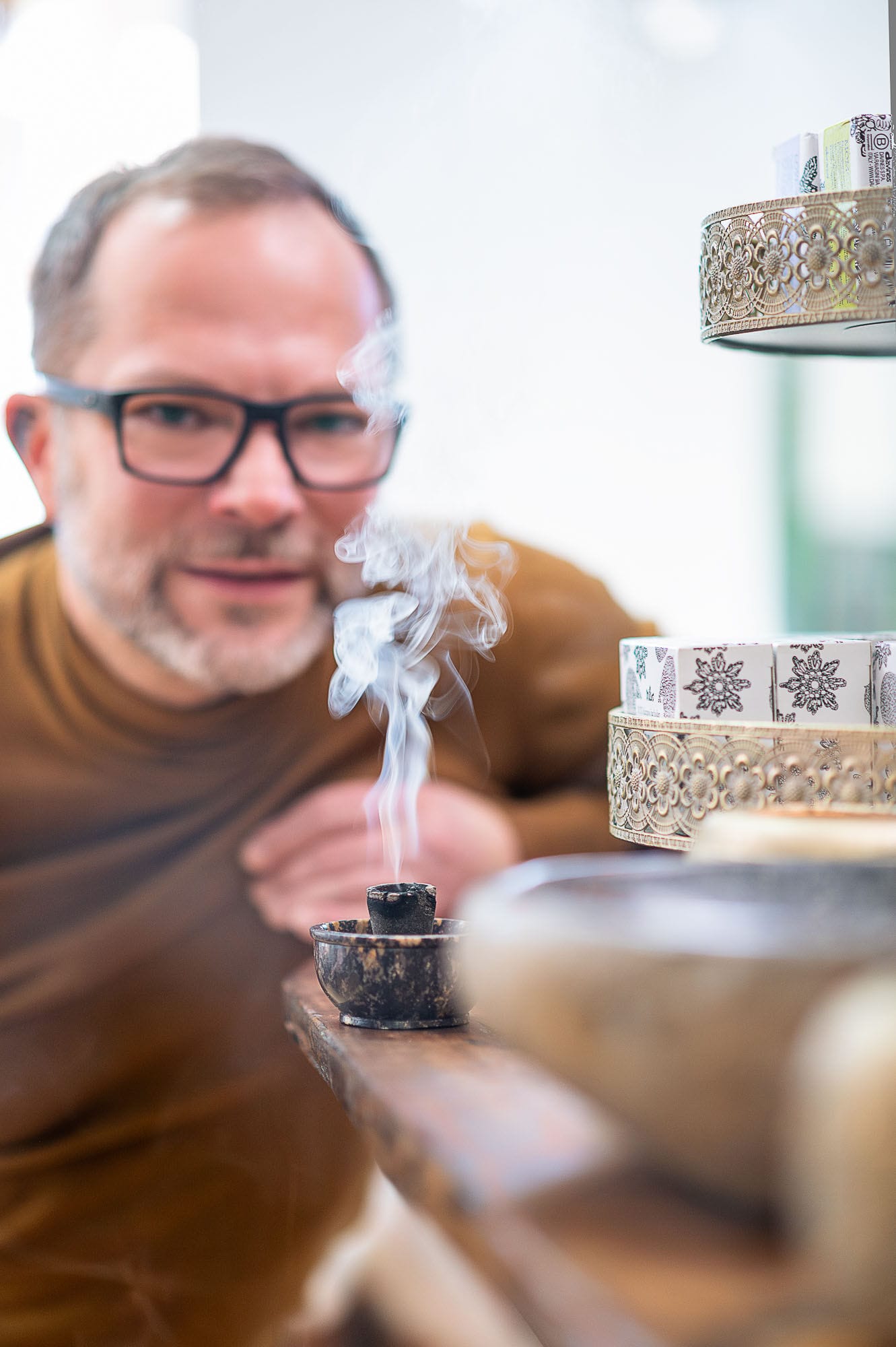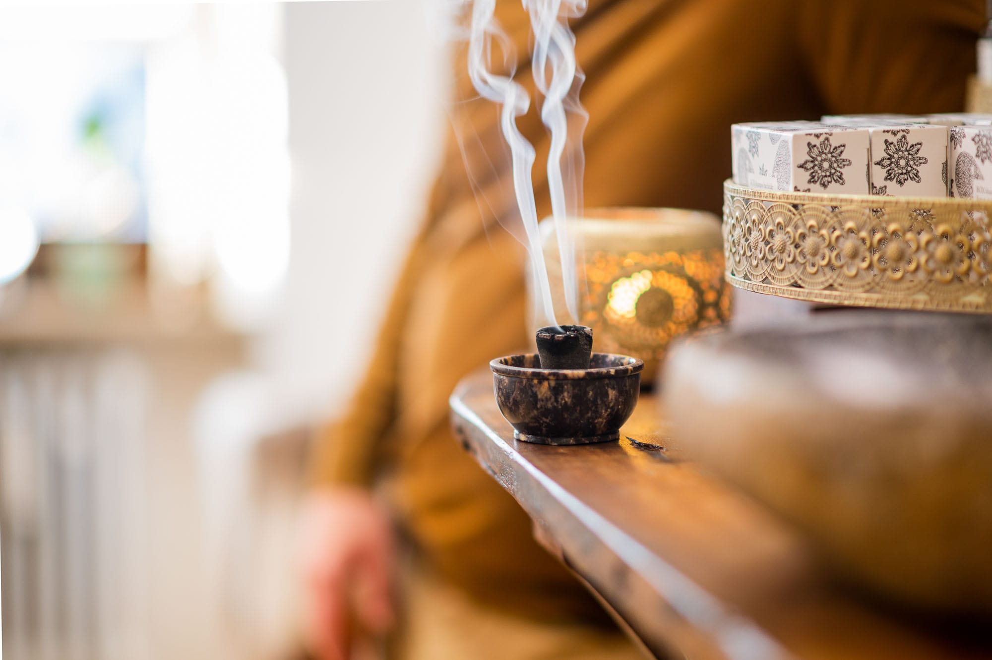 Duftende Räucherschale auf Holztisch
