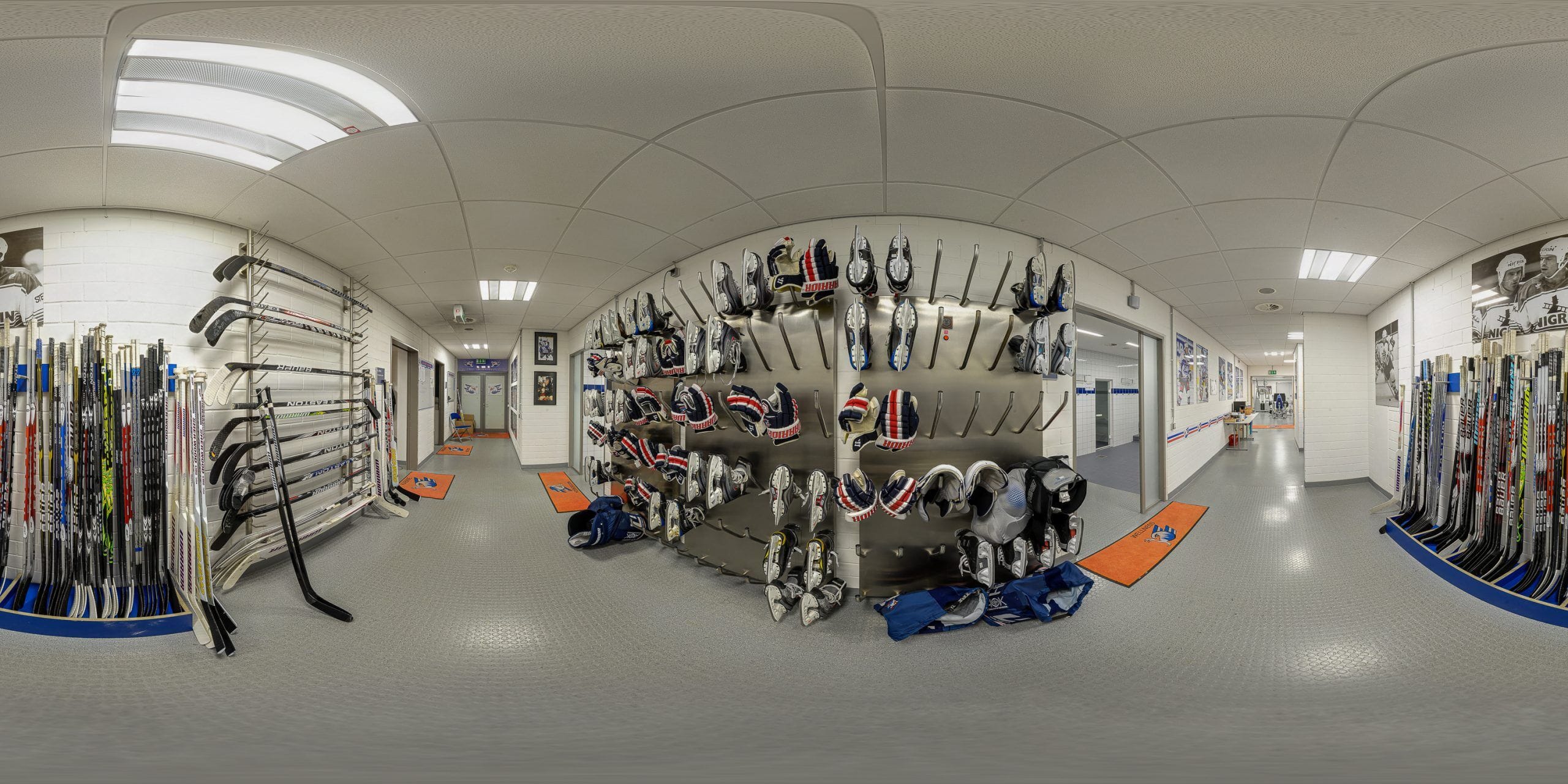 Leere Eishockeyarena mit buntem Eis.