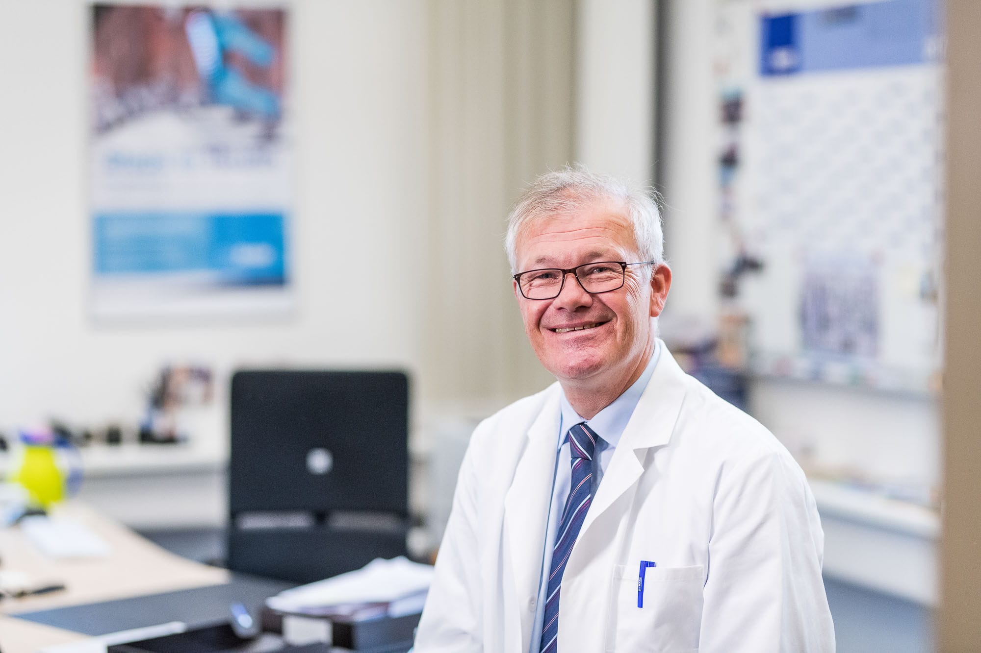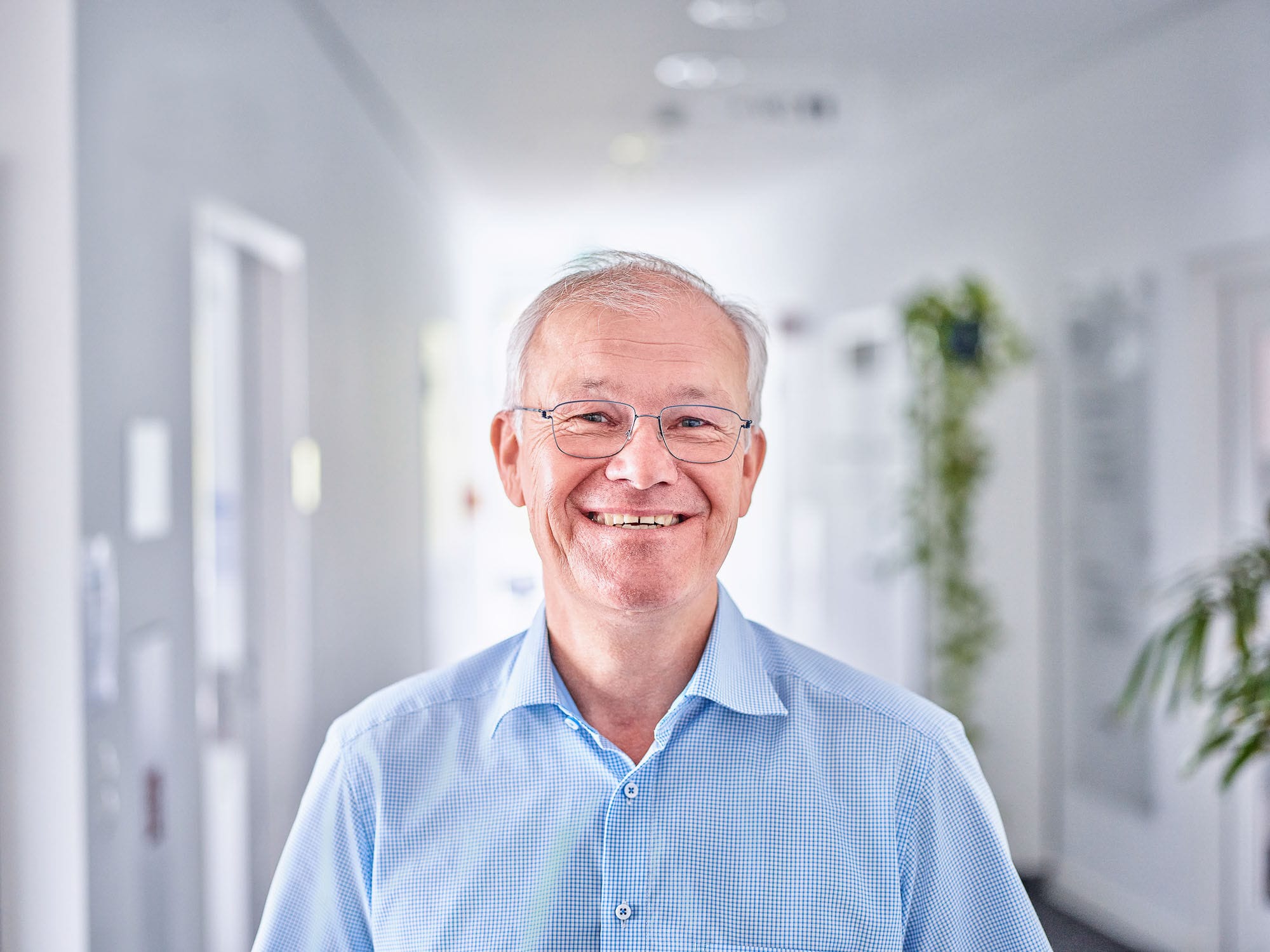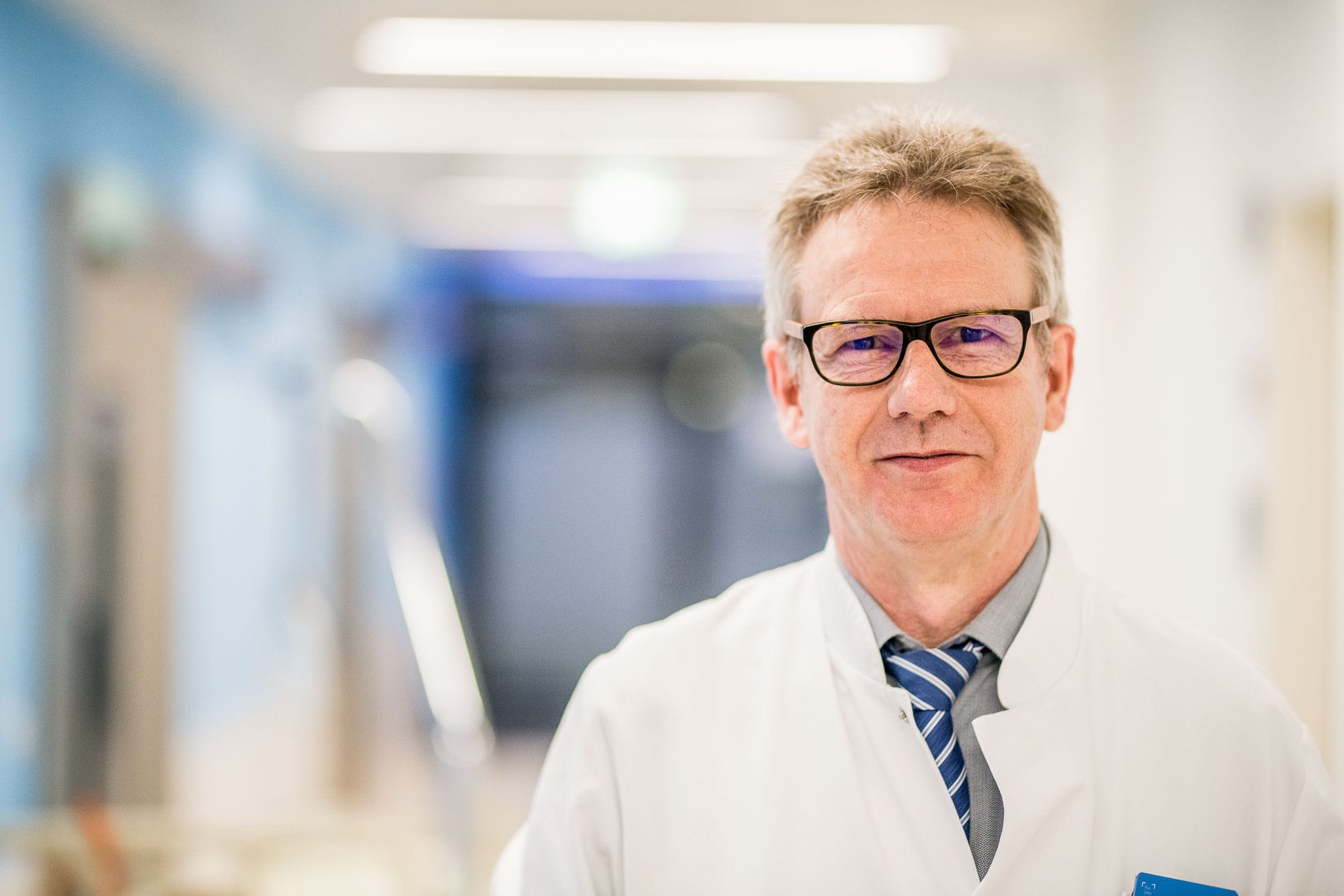 Arzt im Krankenhausflur mit Brille und Krawatte