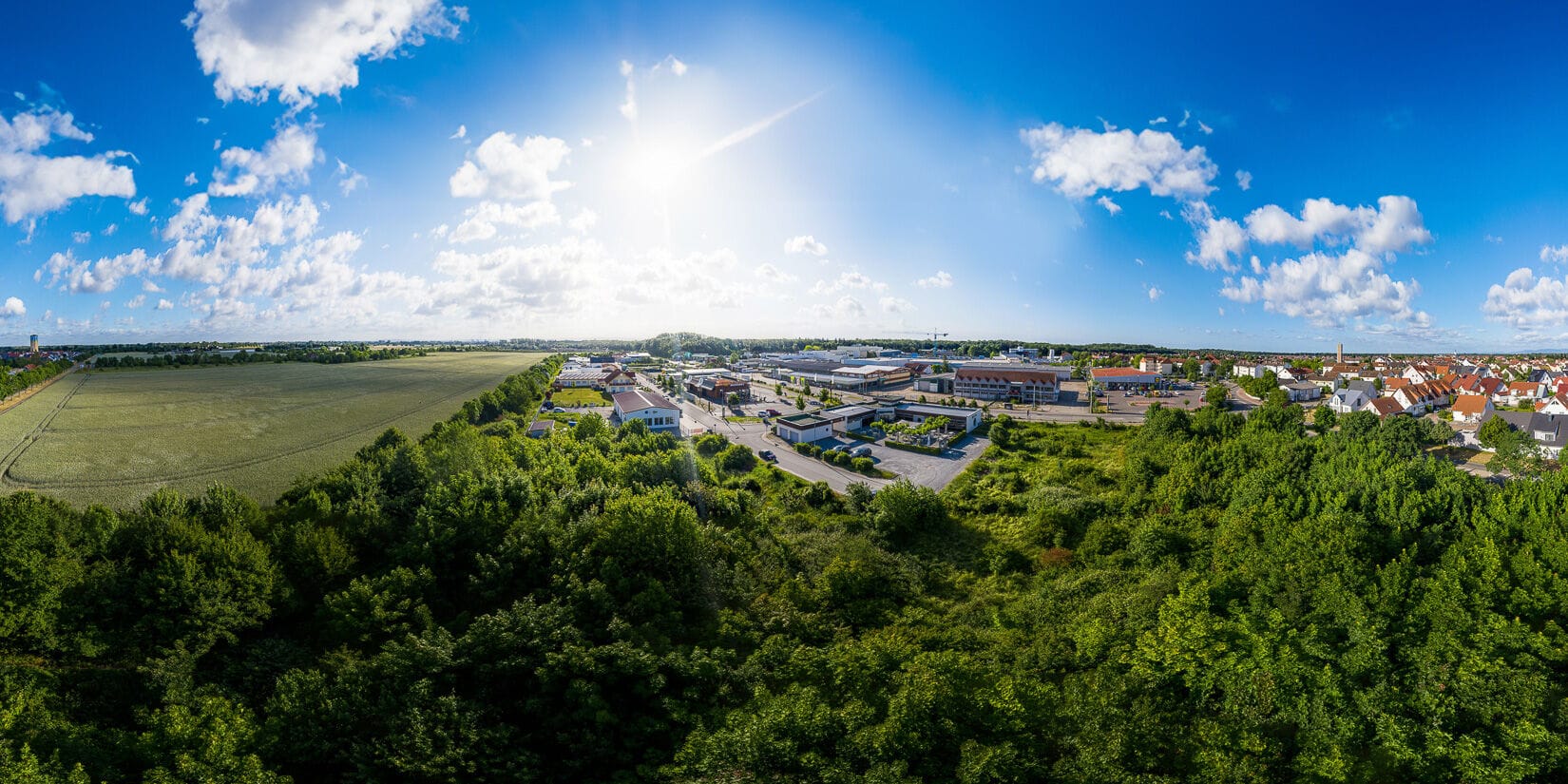 Luftbild einer Stadt mit Feldern und Wald.