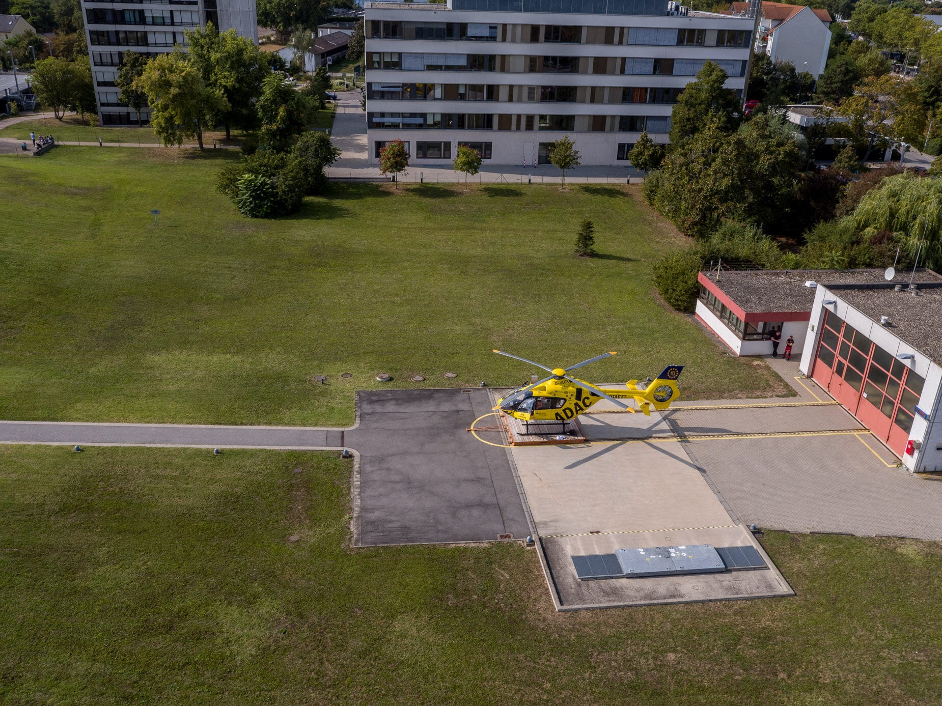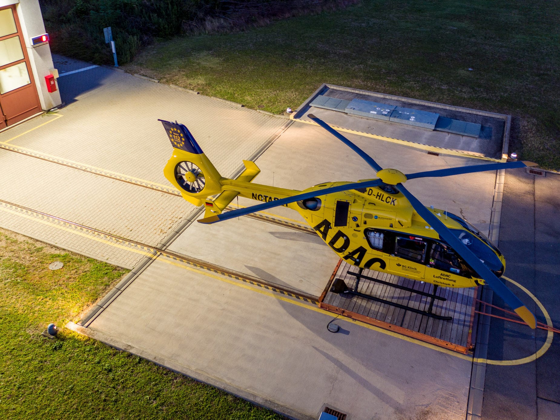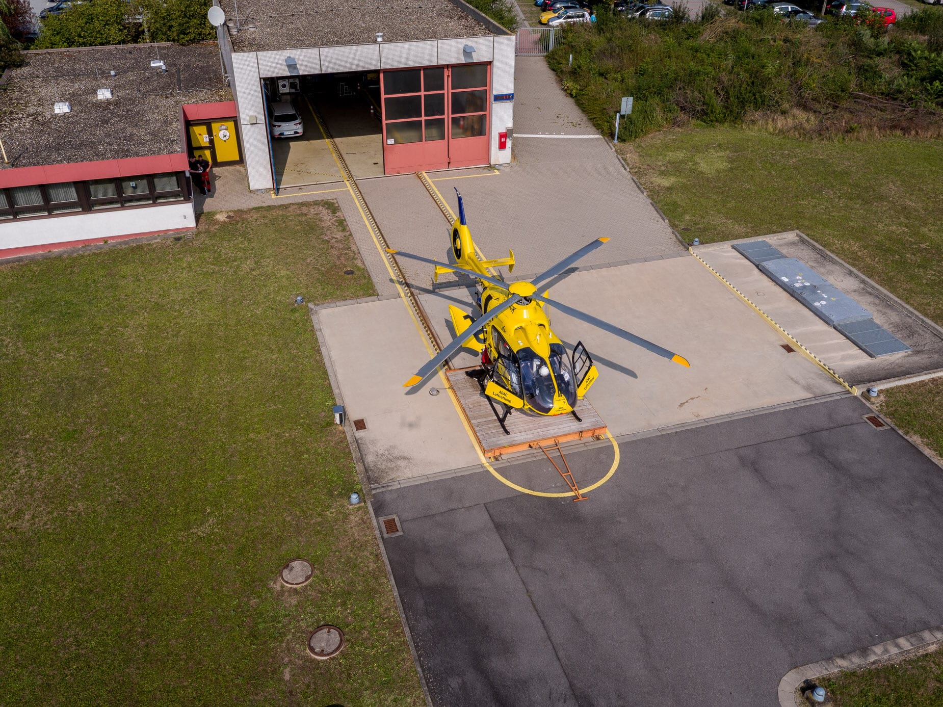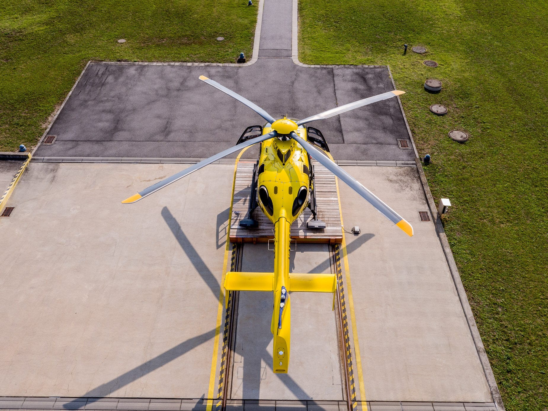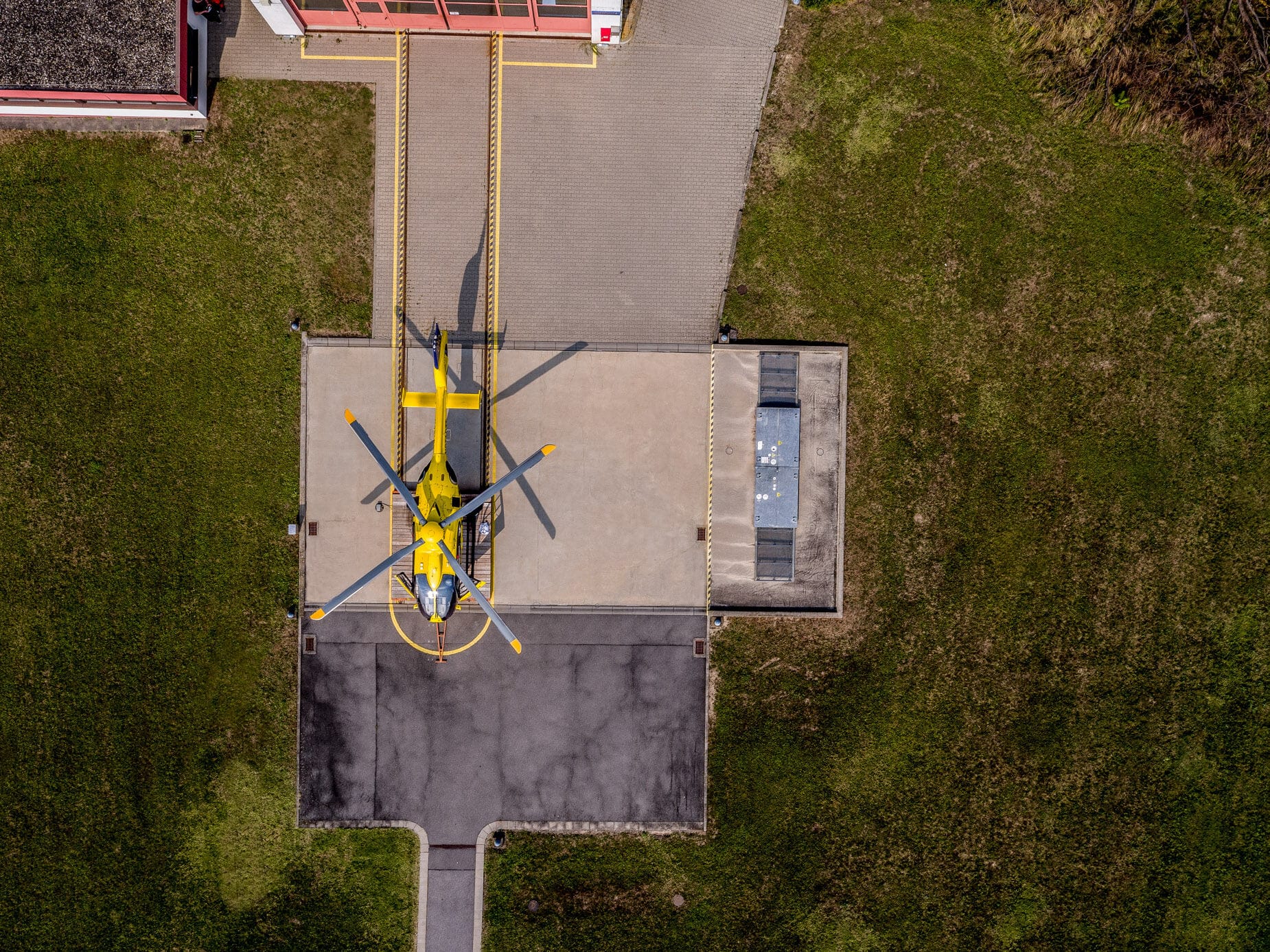 Gelber Helikopter von oben auf Landeplatz