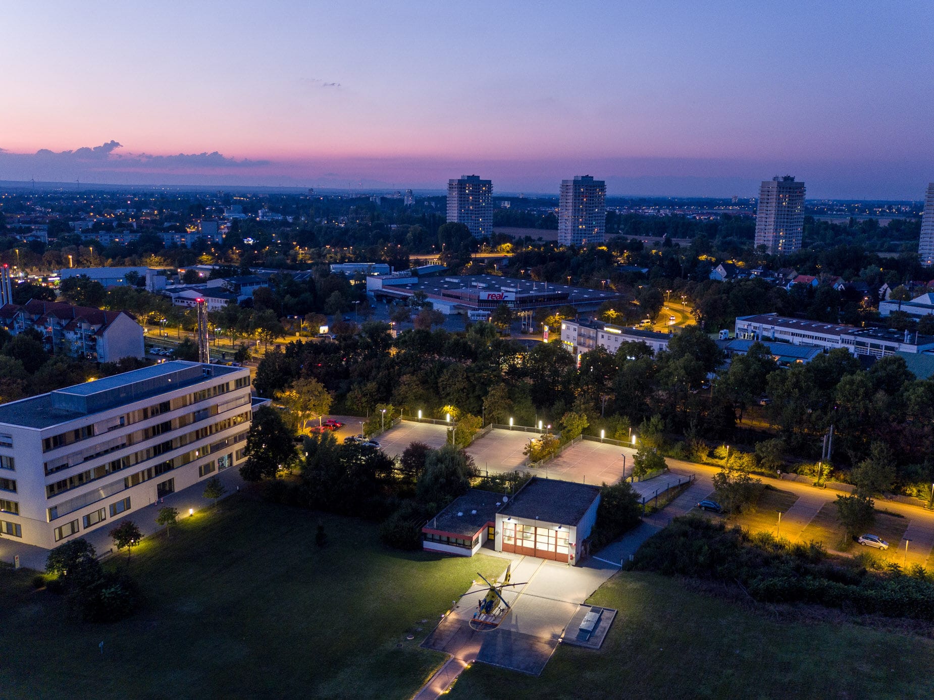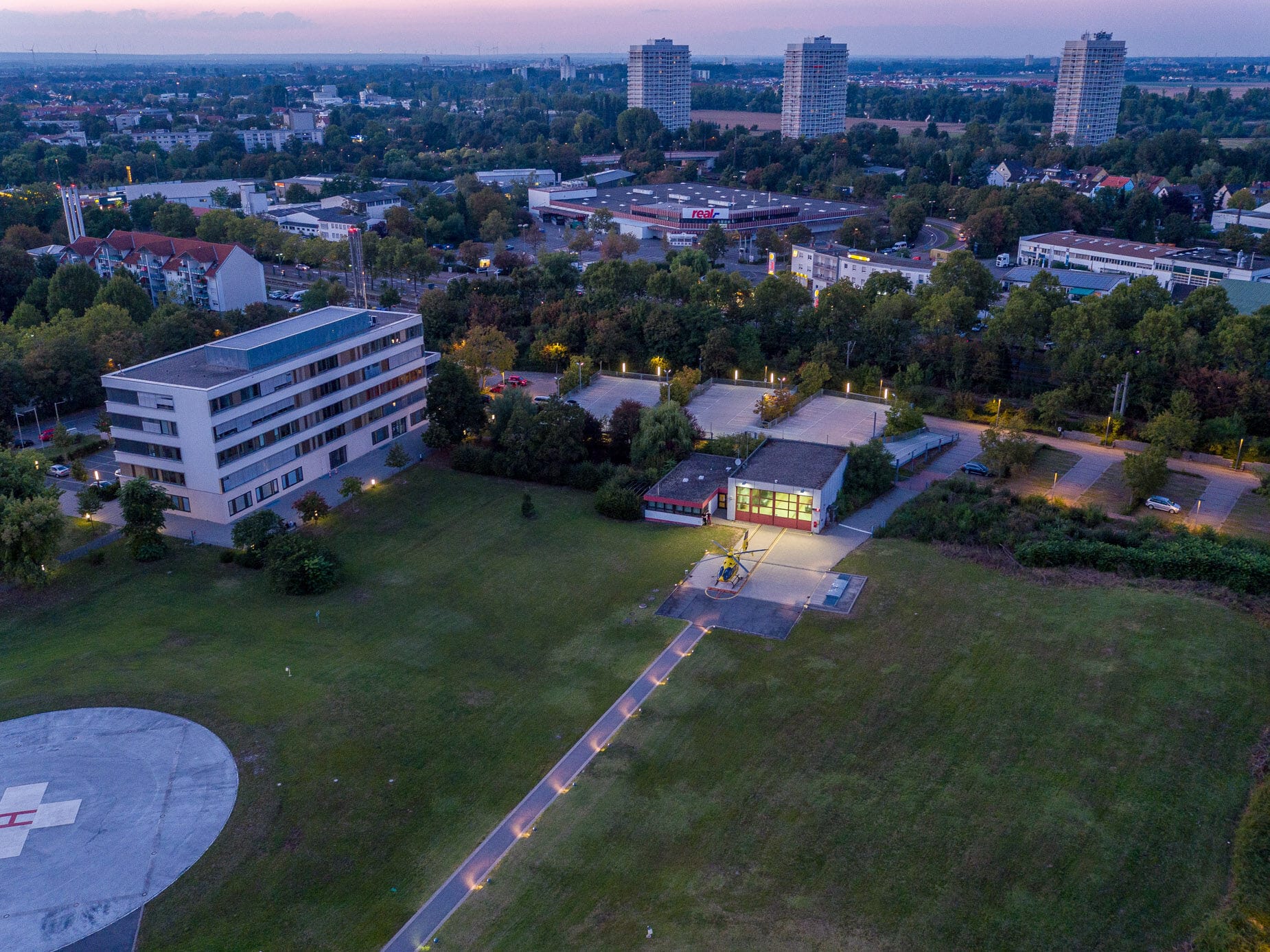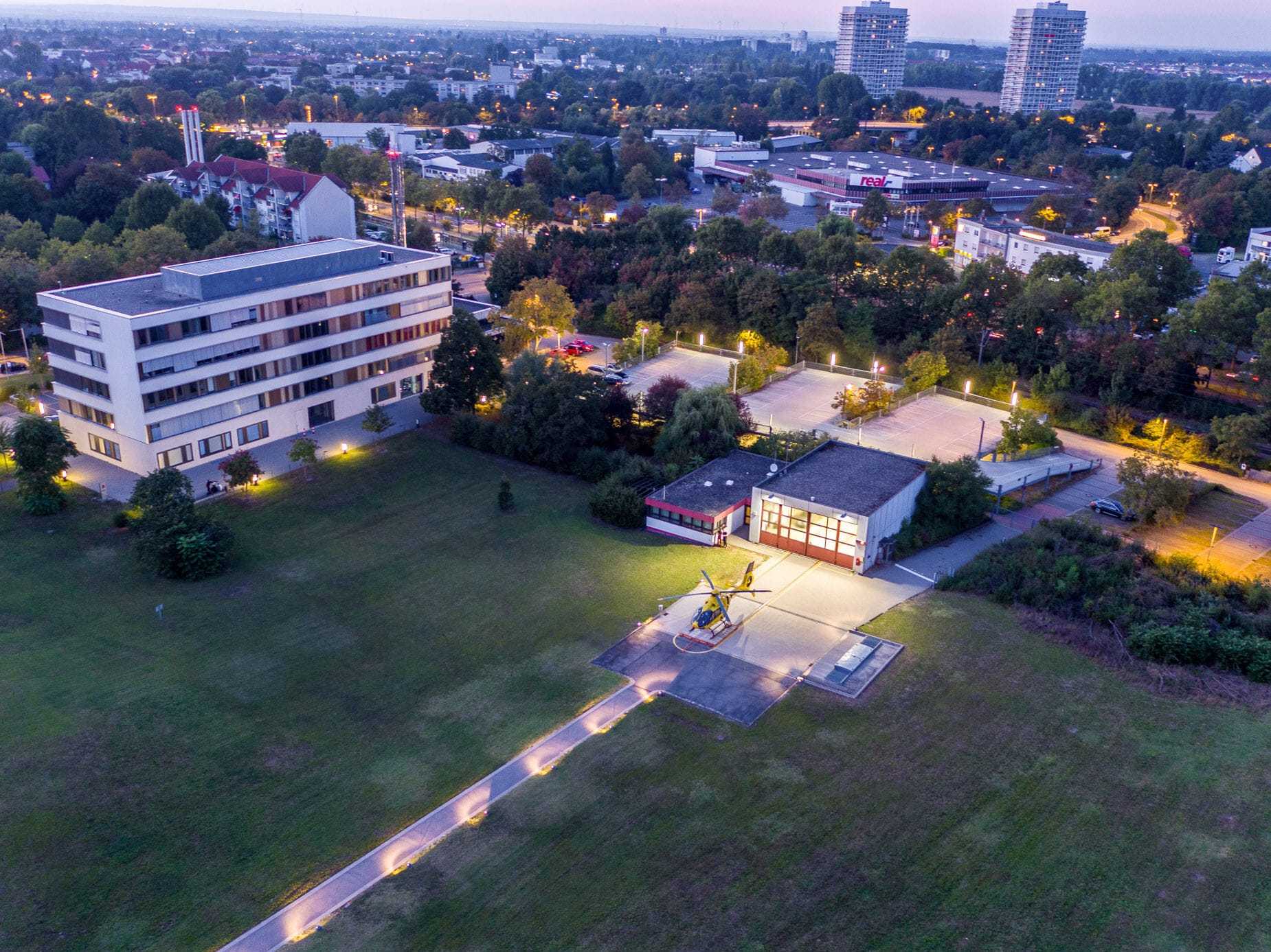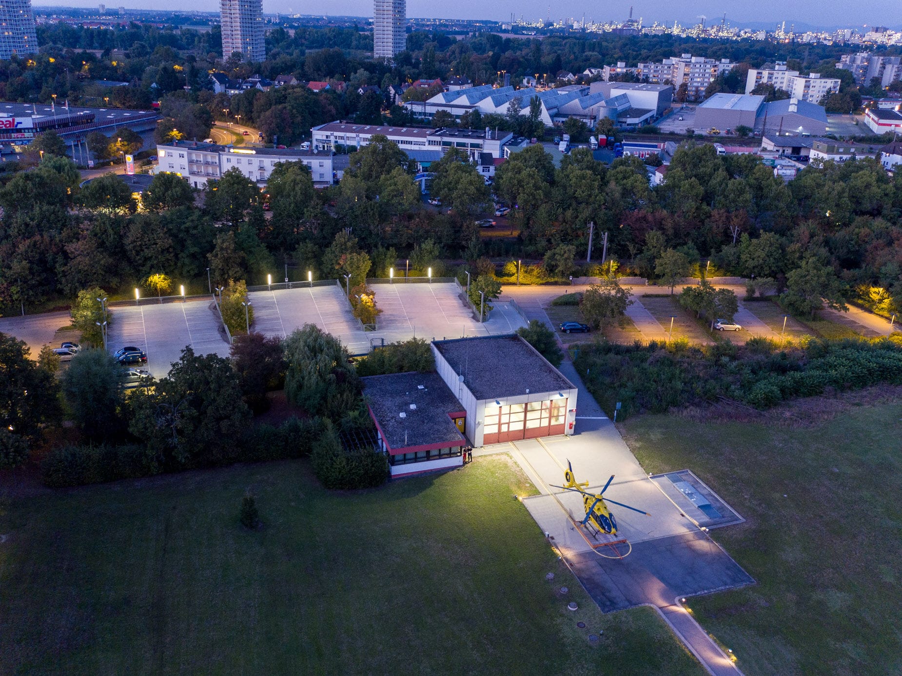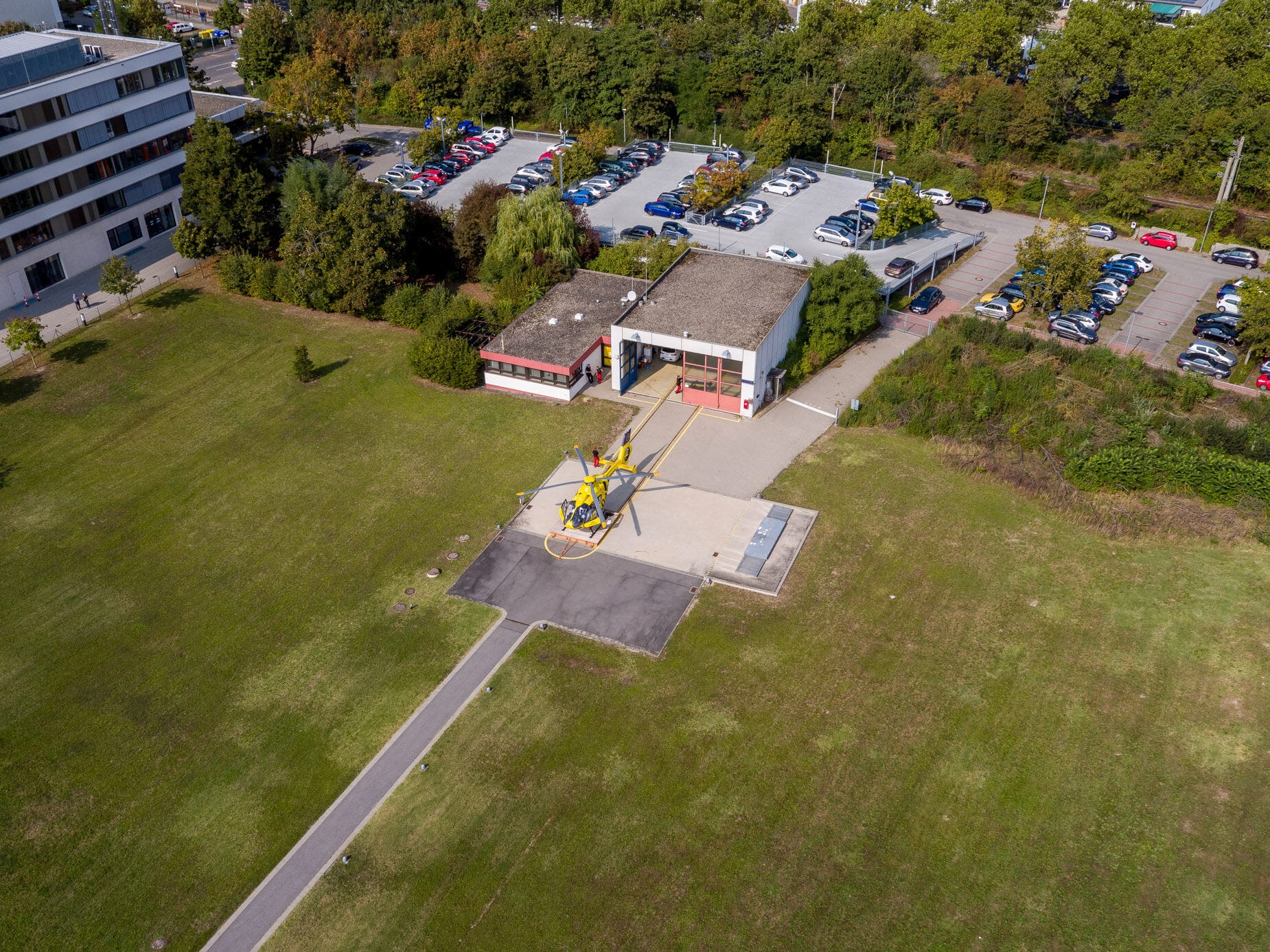 Gelber Helikopter von oben auf Landeplatz