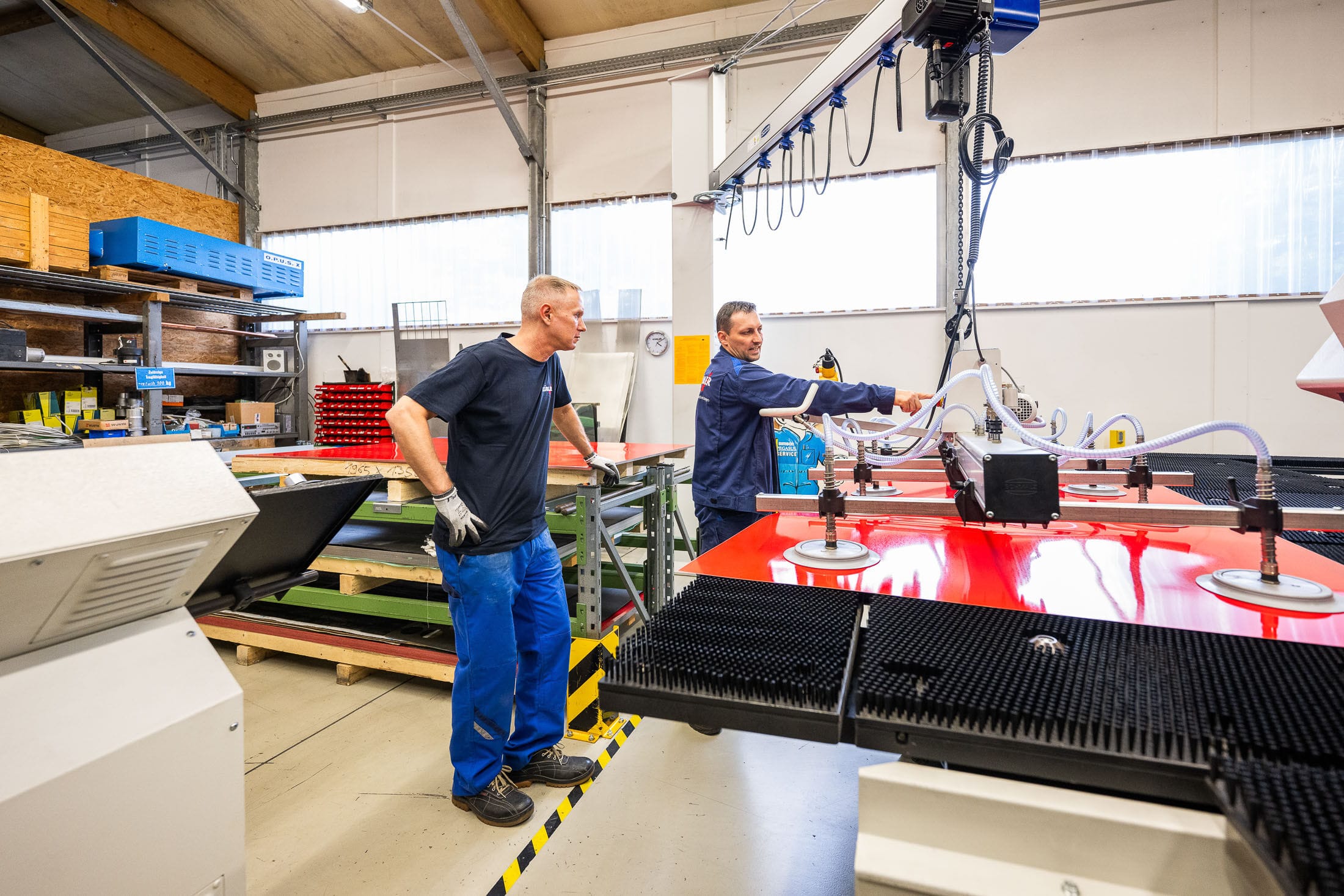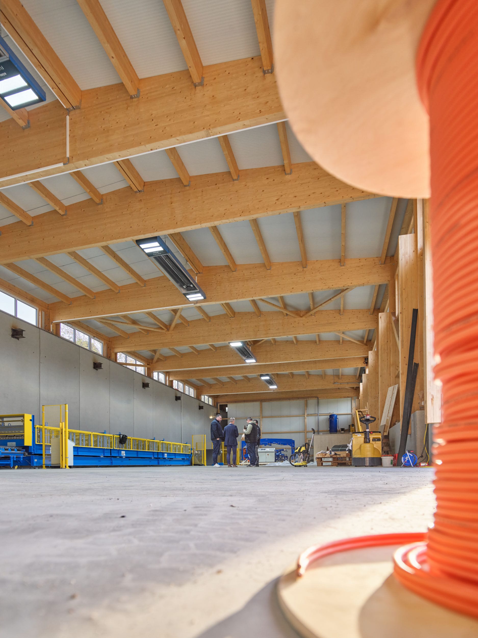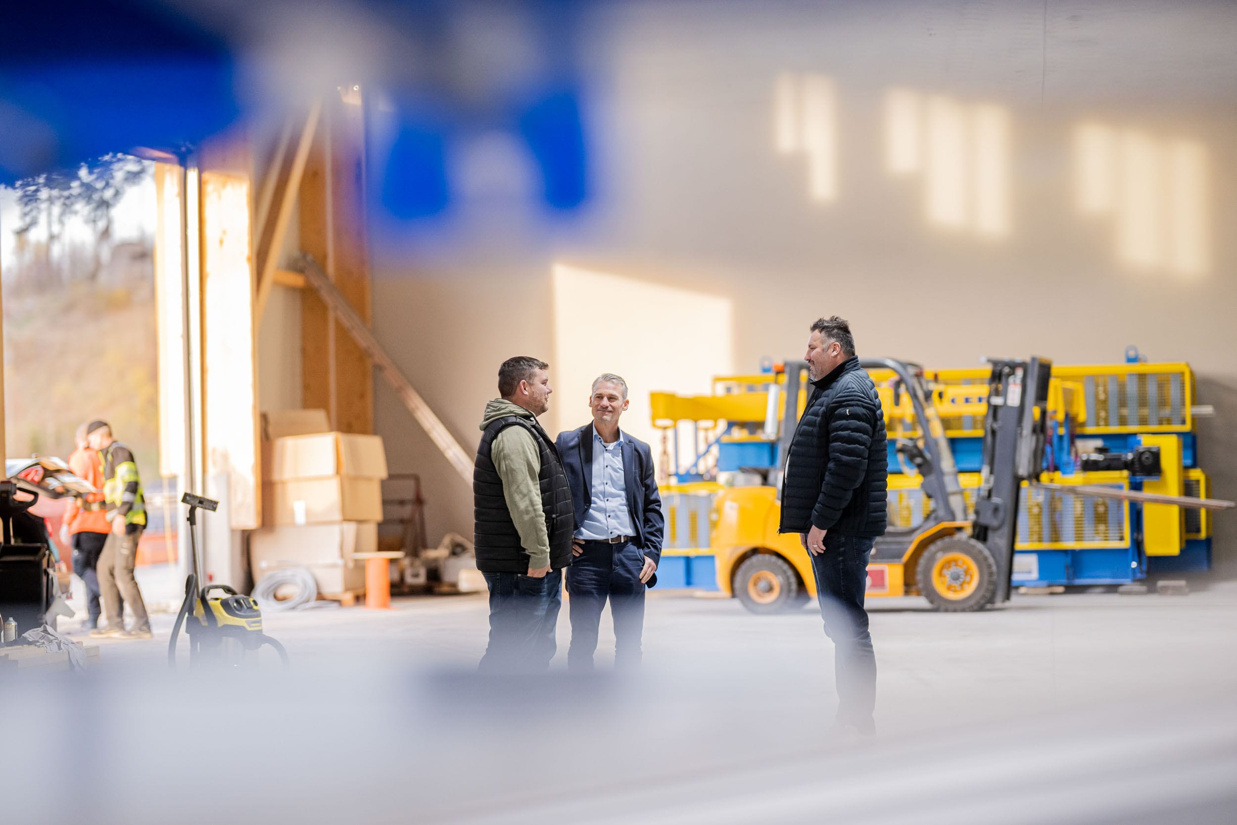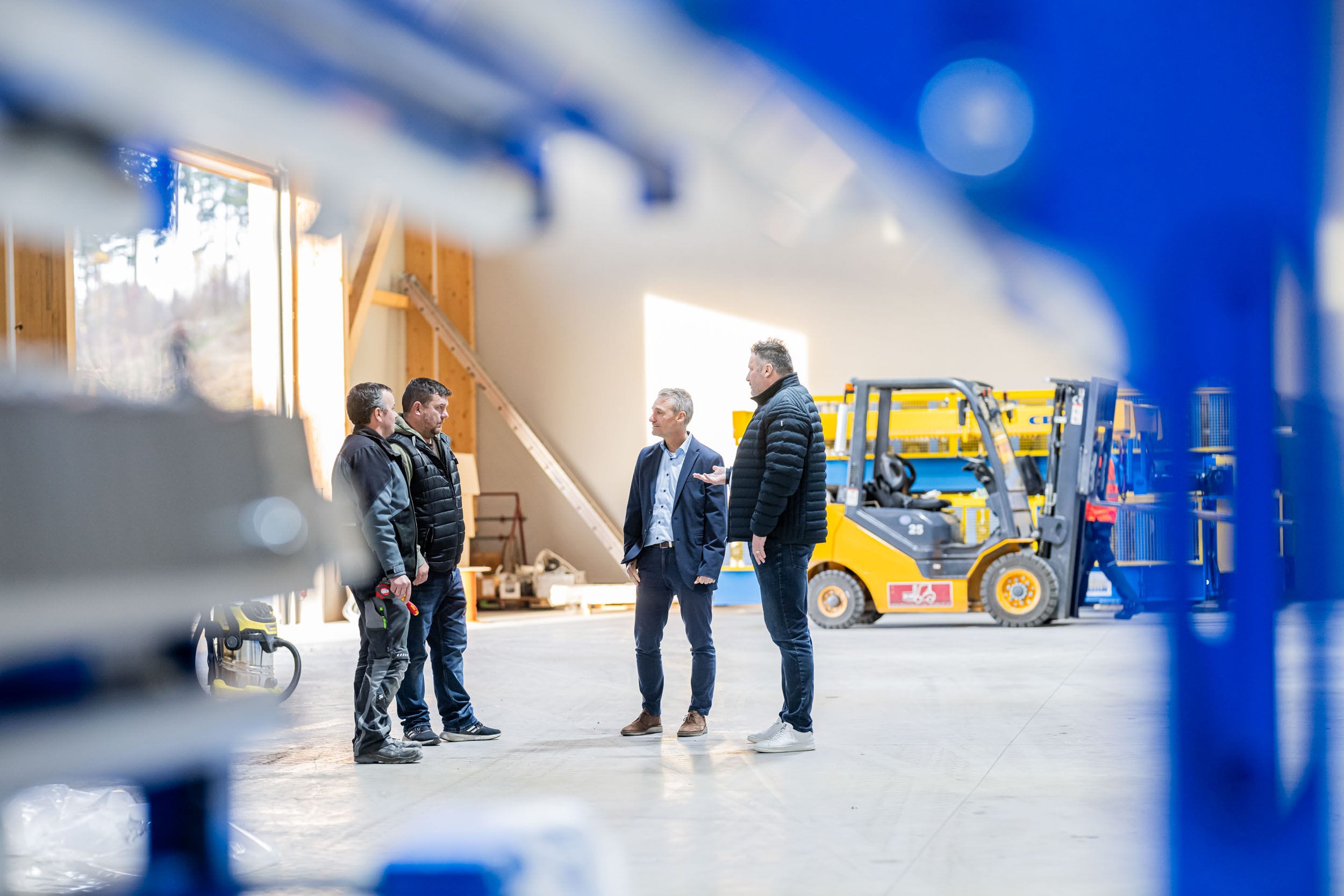 Personen diskutieren in einer Werkstatt.