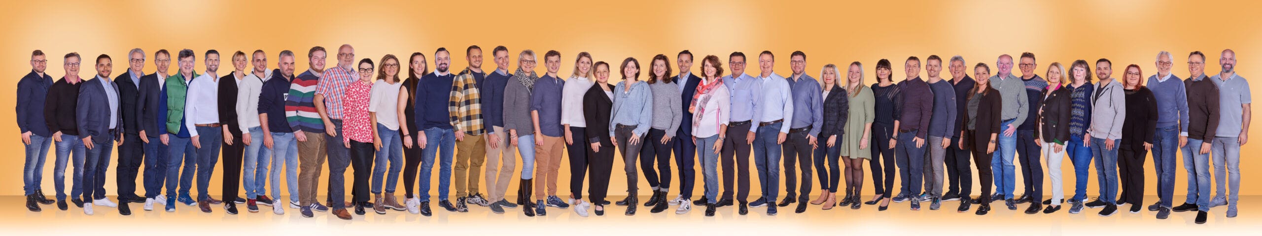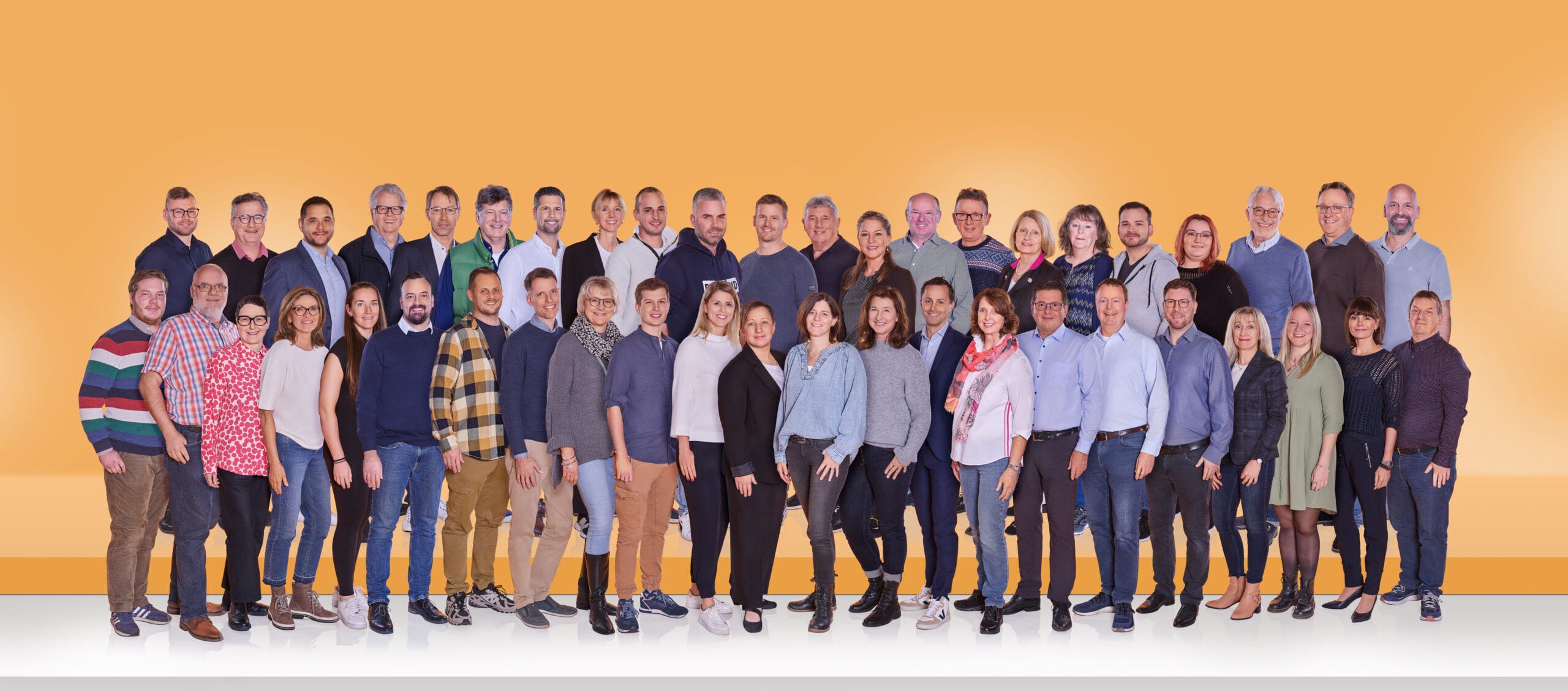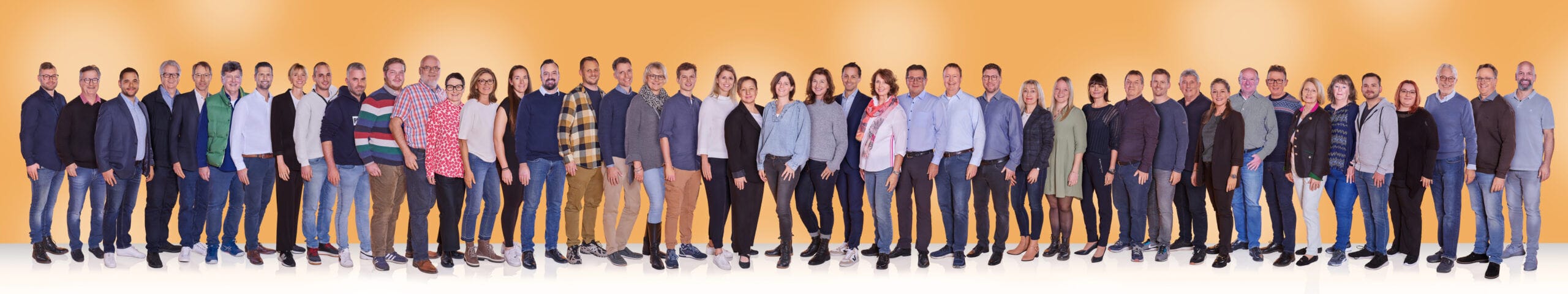 Großes Teamfoto mit über 40 Personen in zwei Reihen vor orangefarbenem Hintergrund, freundlich und professionell